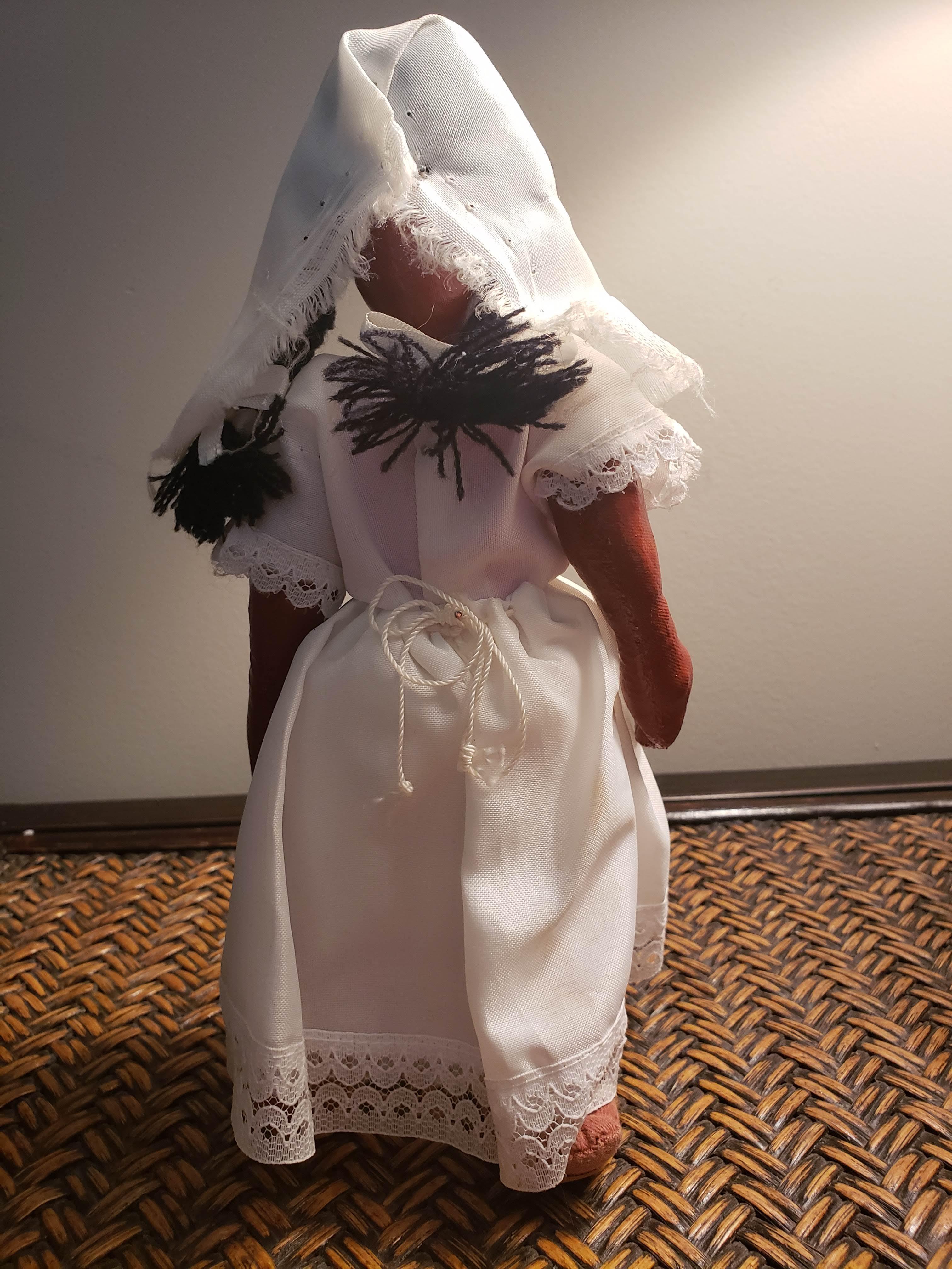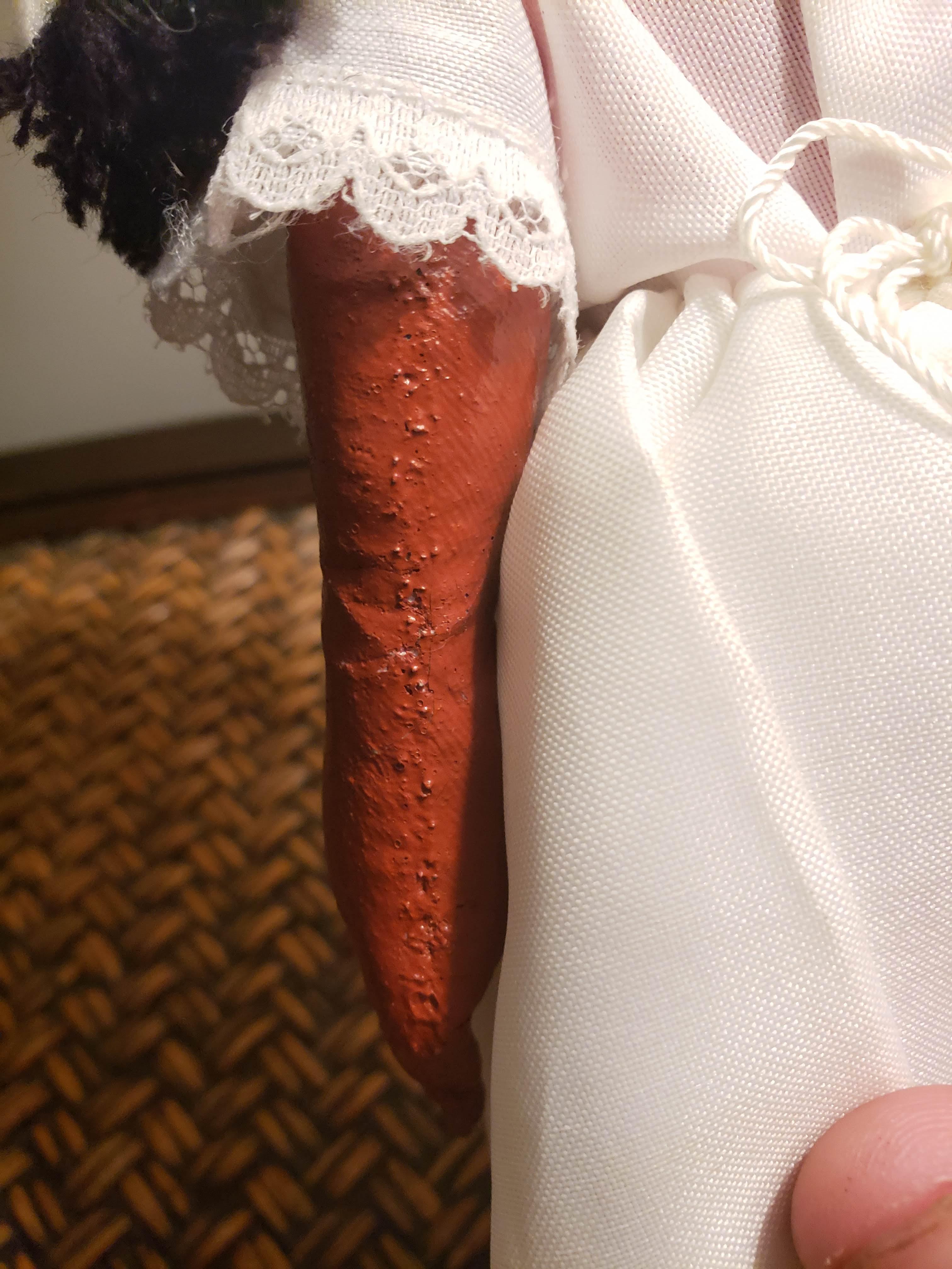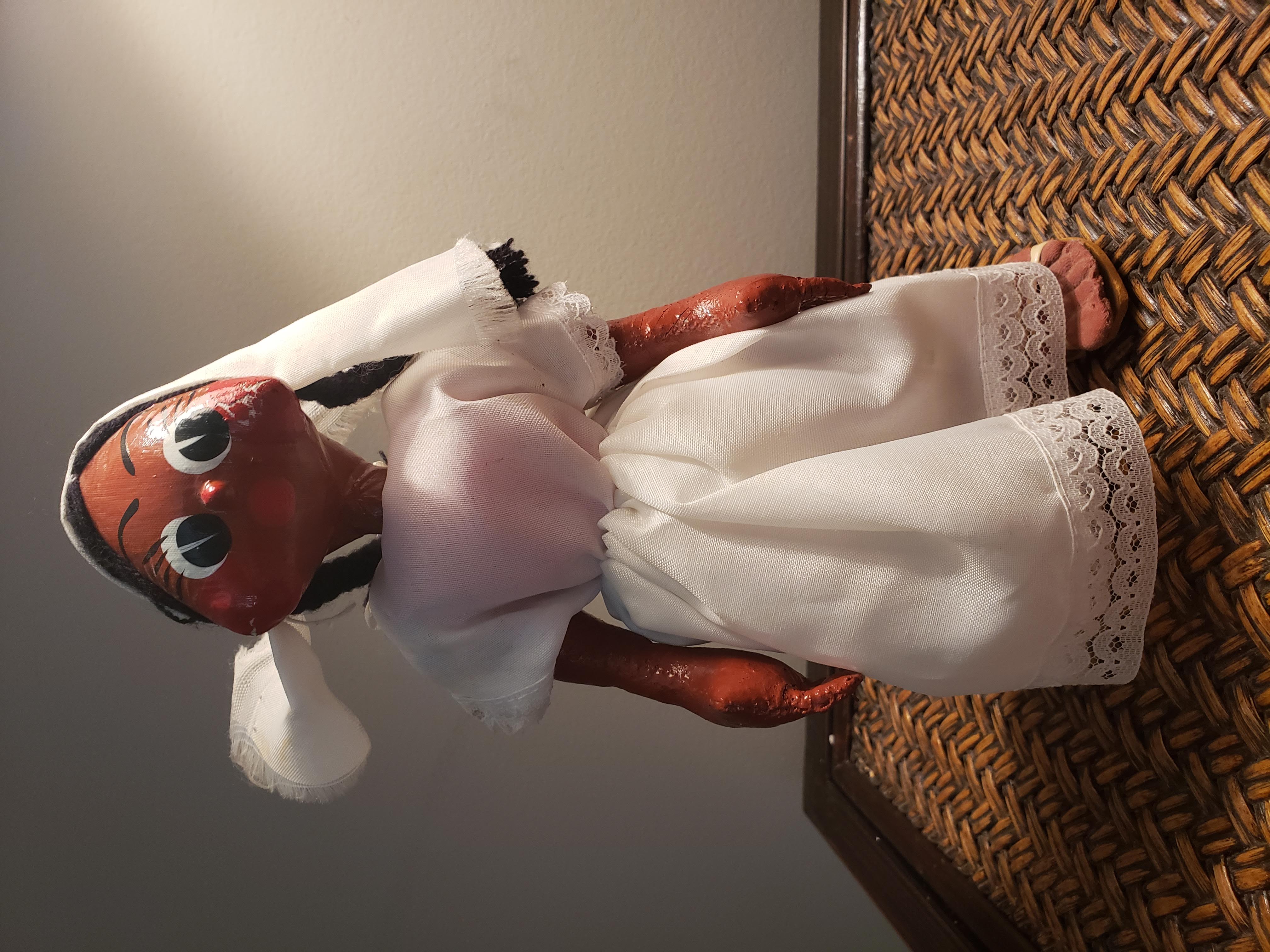 The doll was acquired from a store in Mount Pleasant, SC, right outside of Charleston, SC. The doll has a thick material that looks to be hand painted on. The joints are constructed with wire pins. The hair looks to be just made from yarn or something similar. The clothing is fastened on my flat headed pins. From what I could see there are no markings indicating the year of production or manufacturer. I didn't the clothes off the doll in fear of damaging it so I'm not entirely sure if there are markings or not.