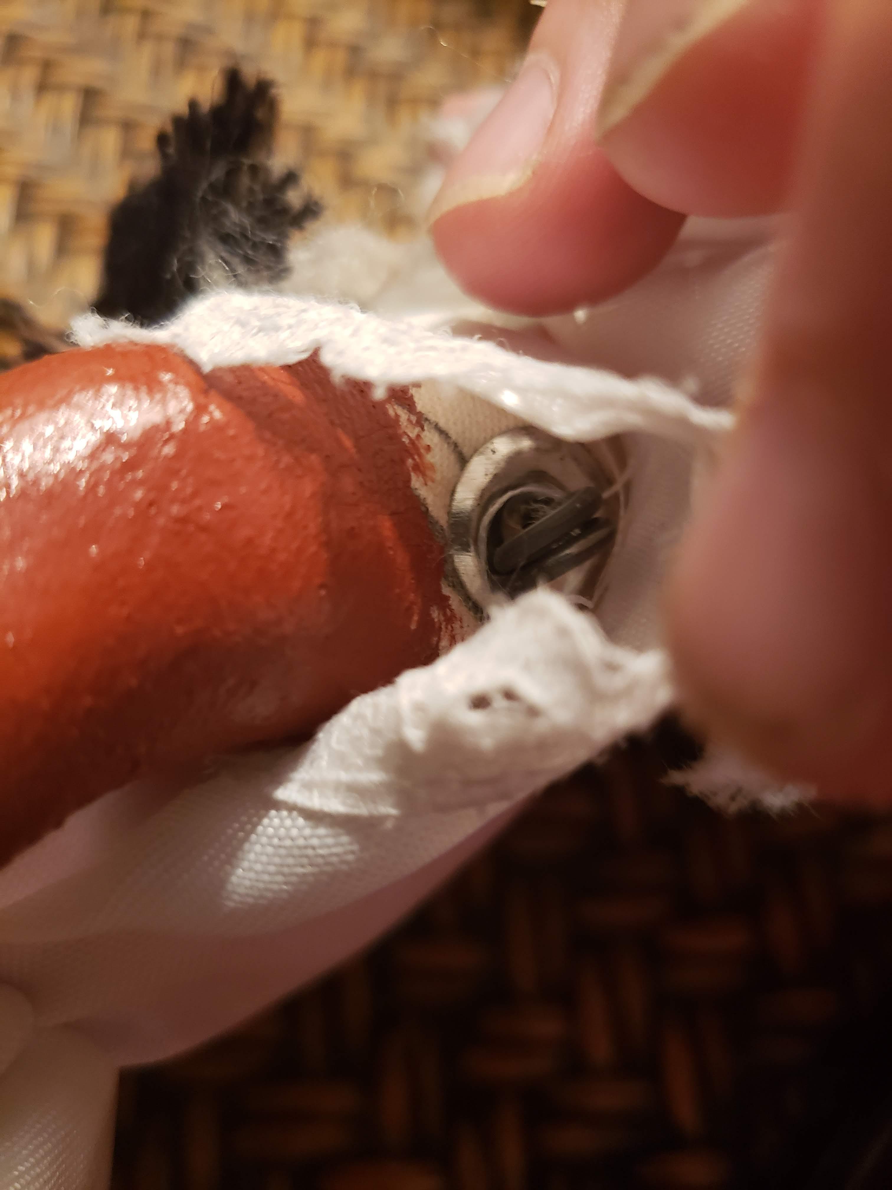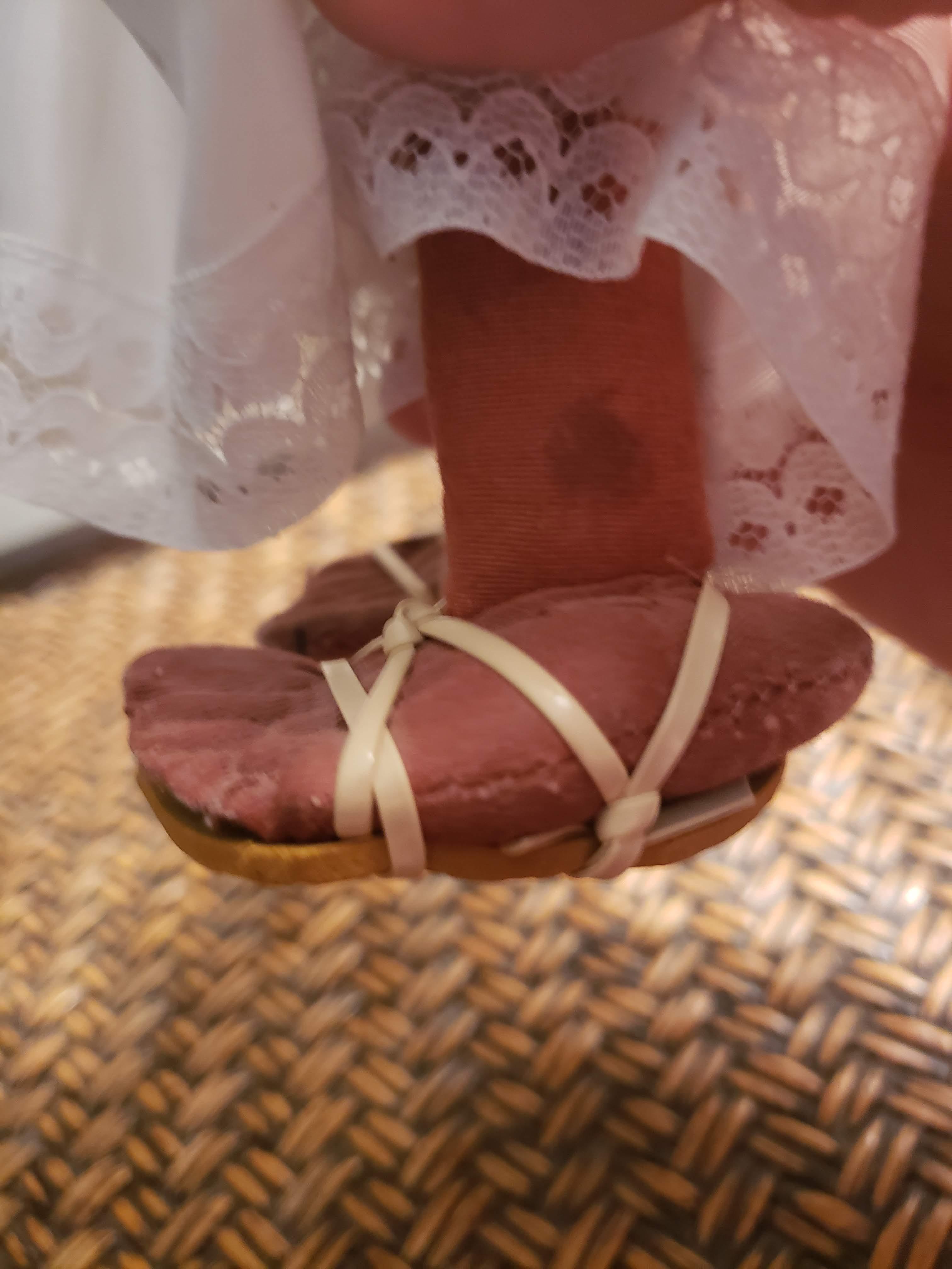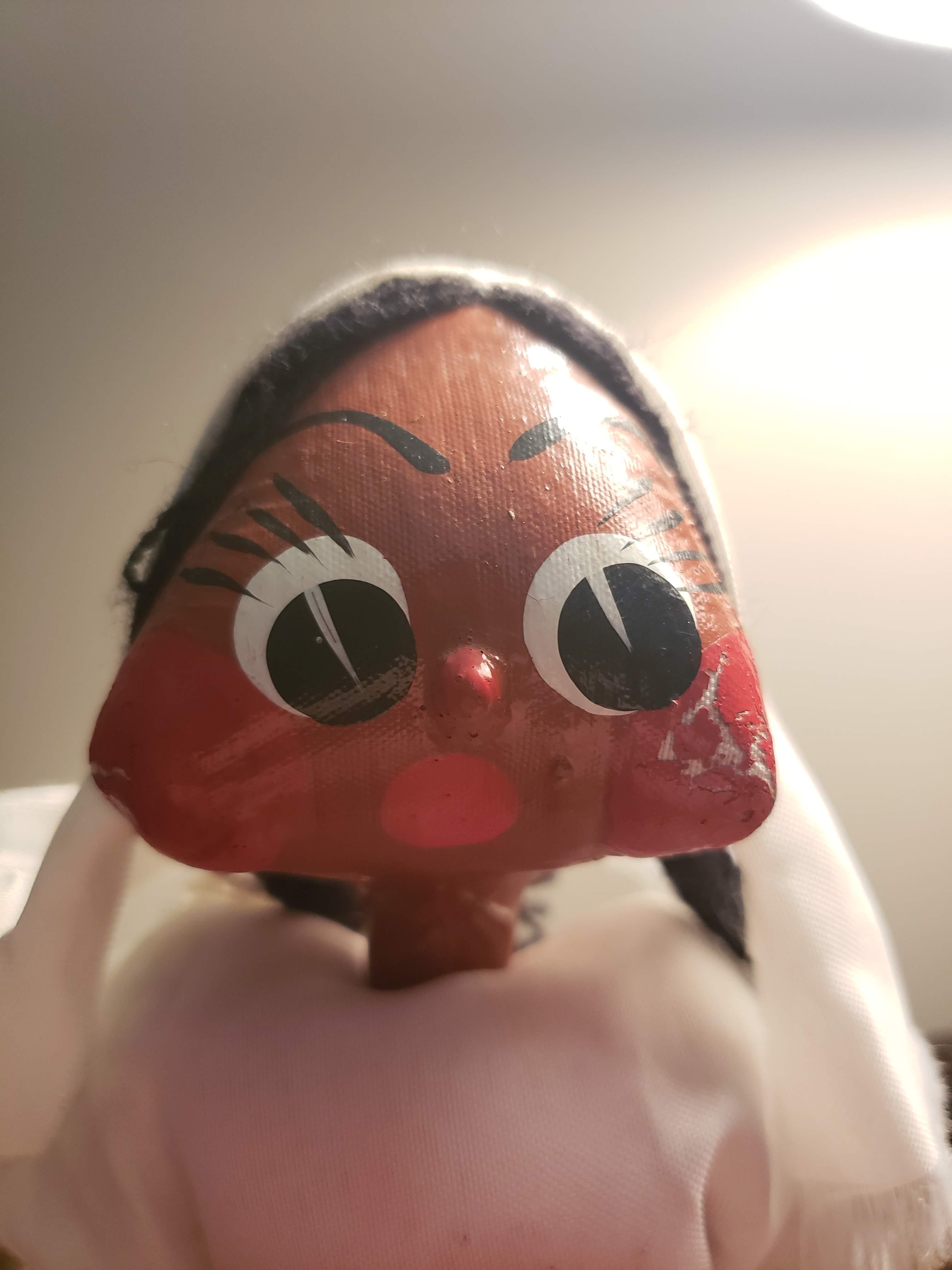 The doll was acquired from a store in Mount Pleasant, SC, right outside of Charleston, SC. The doll has a thick material that looks to be hand painted on. The joints are constructed with wire pins. The hair looks to be just made from yarn or something similar. The clothing is fastened on my flat headed pins. From what I could see there are no markings indicating the year of production or manufacturer. I didn't the clothes off the doll in fear of damaging it so I'm not entirely sure if there are markings or not.