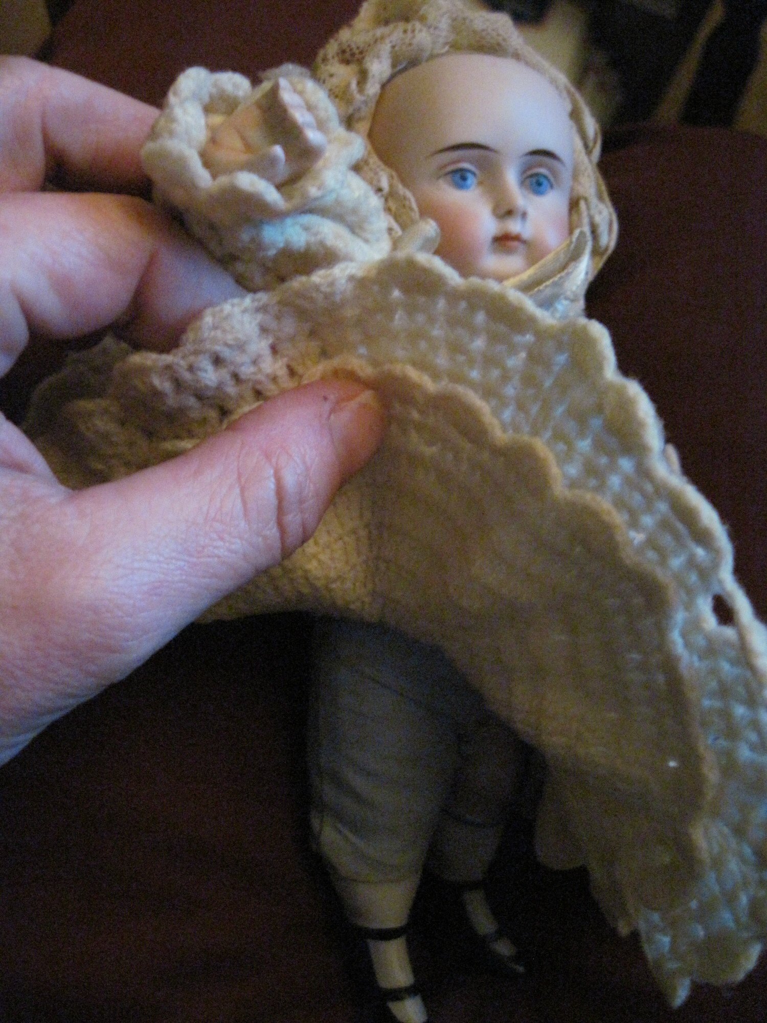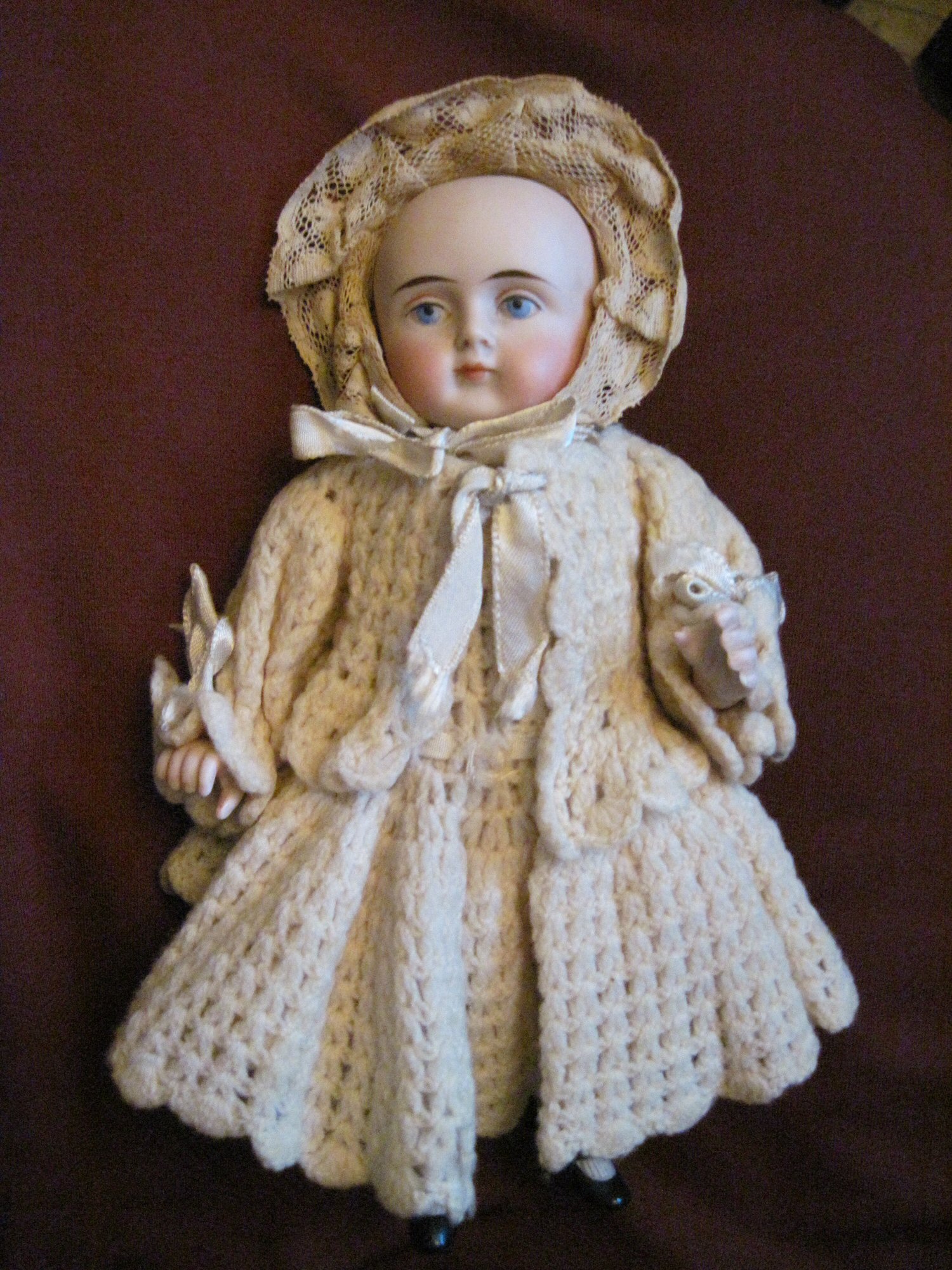 She is in the original hand crocheted outfit she was in when my great-grandmother gave it to my mother. And, she placed 3rd in an old doll show in 1953. I have the handmade awards and newspaper clipping for the event.