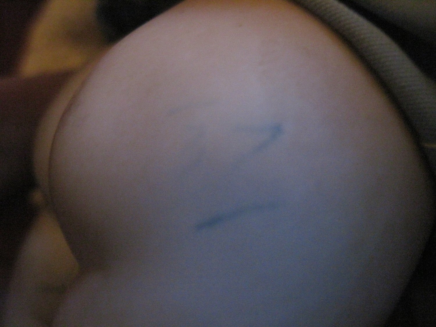 The only markings I can find are a simple indentation at the base of her neck in the shape of a retangle and what looks like the number '37' with lines above and below the number in a very faint blue possibly matching the color of her sock trim.