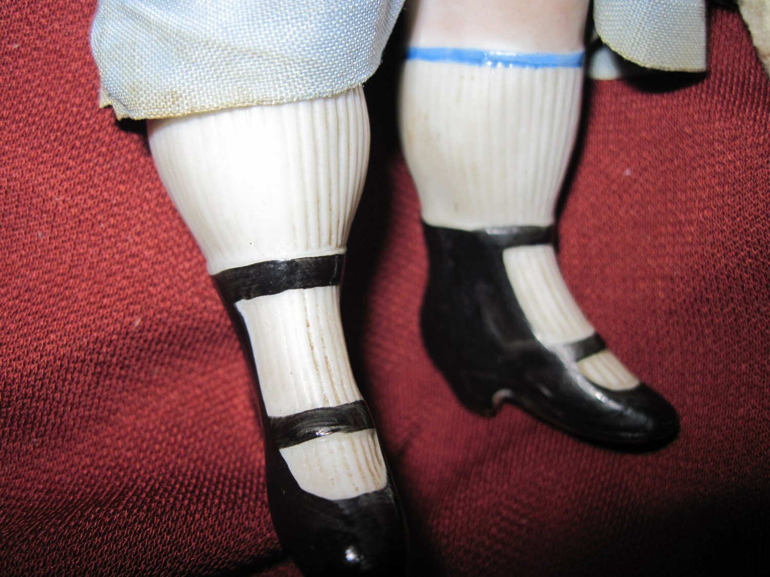 The legs are painted in white socks that stop just below her knee and are trimmed in blue. She has black Mary Jane style heeled boots.