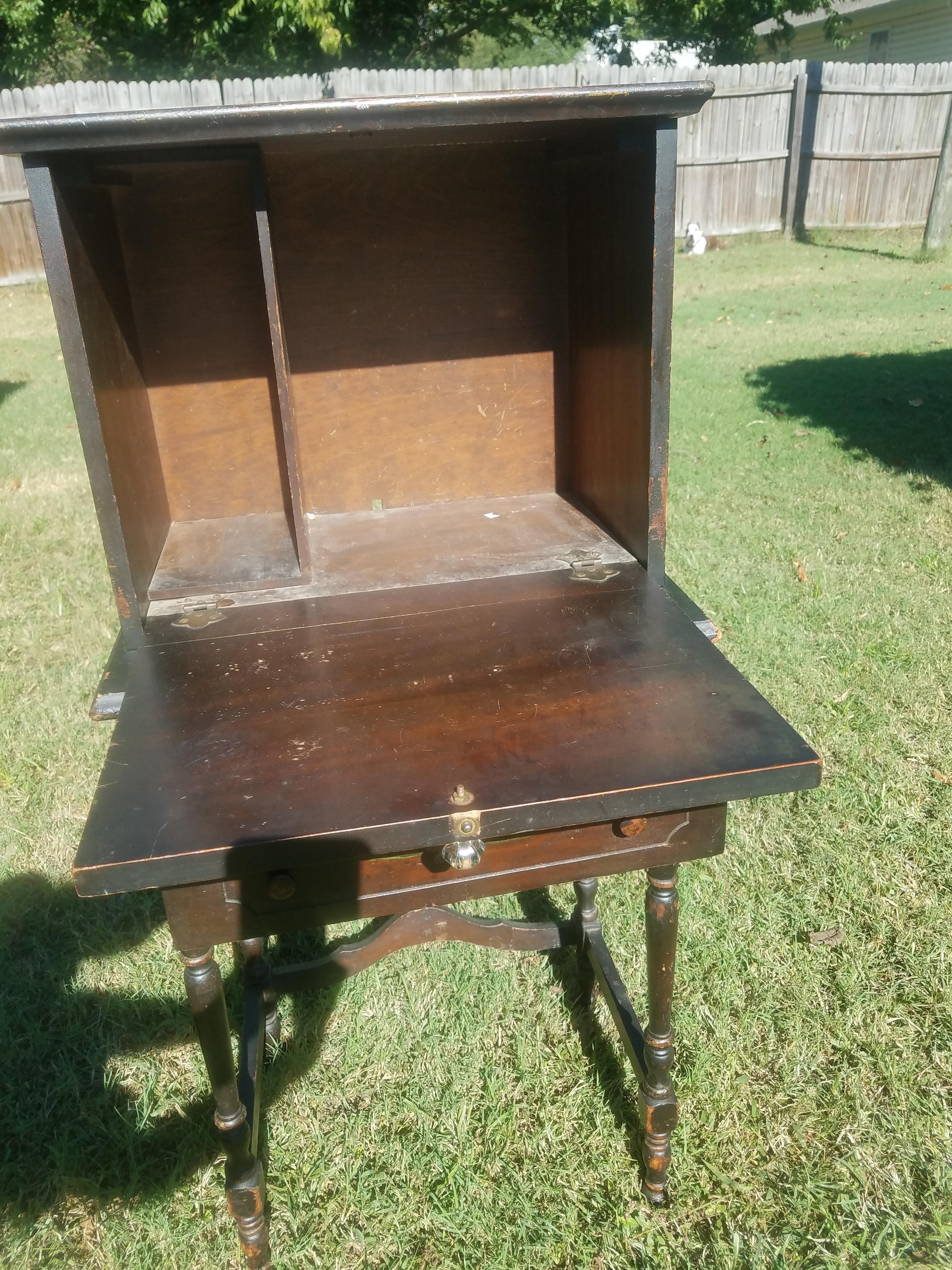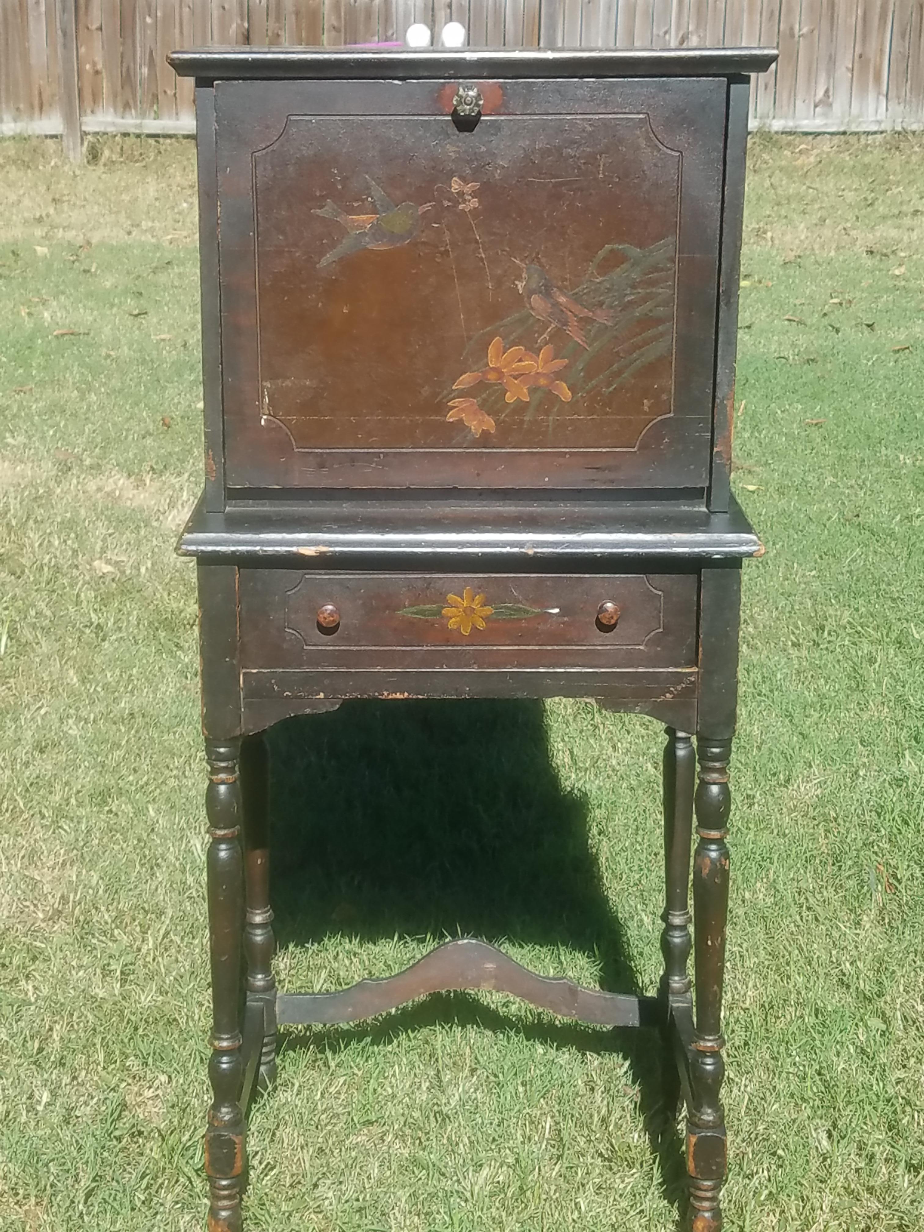 I was given this as a refinish project. Do not know the history. I would like to find out what it is before sanding and painting it. It is a small drop front desk. Does have some painting on front of drop and the drawer. Crystal handle. Hardware looks original.
