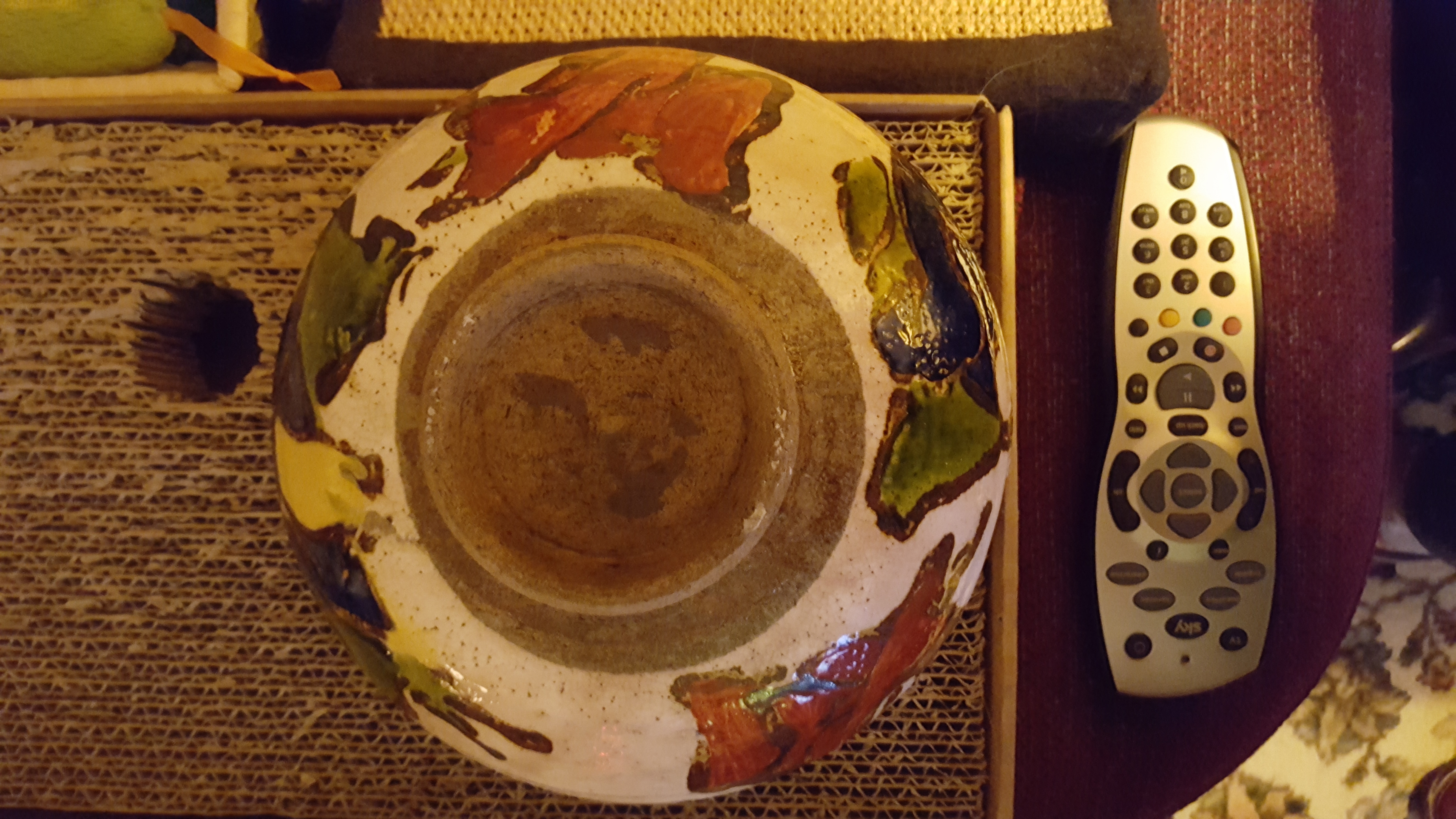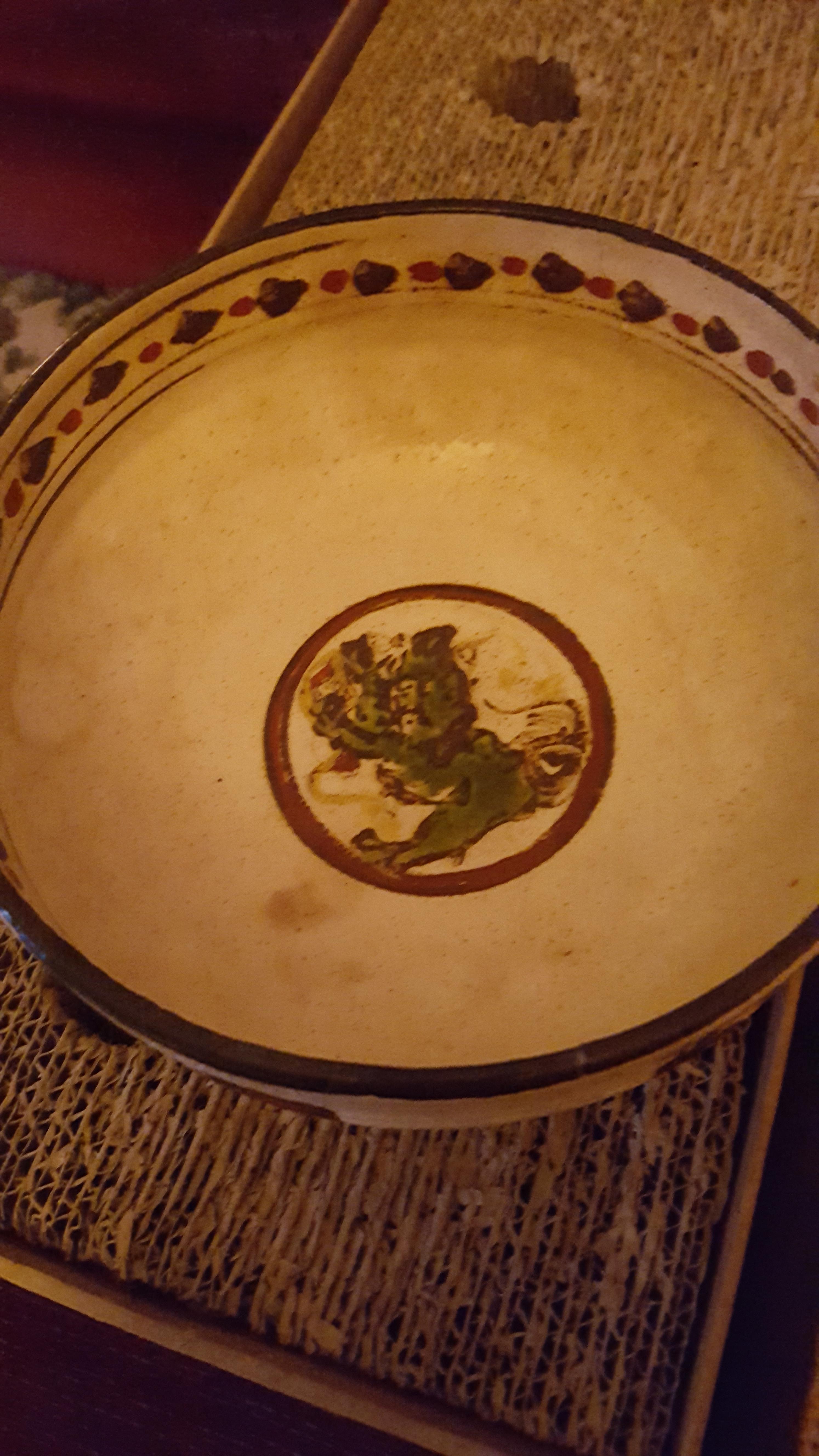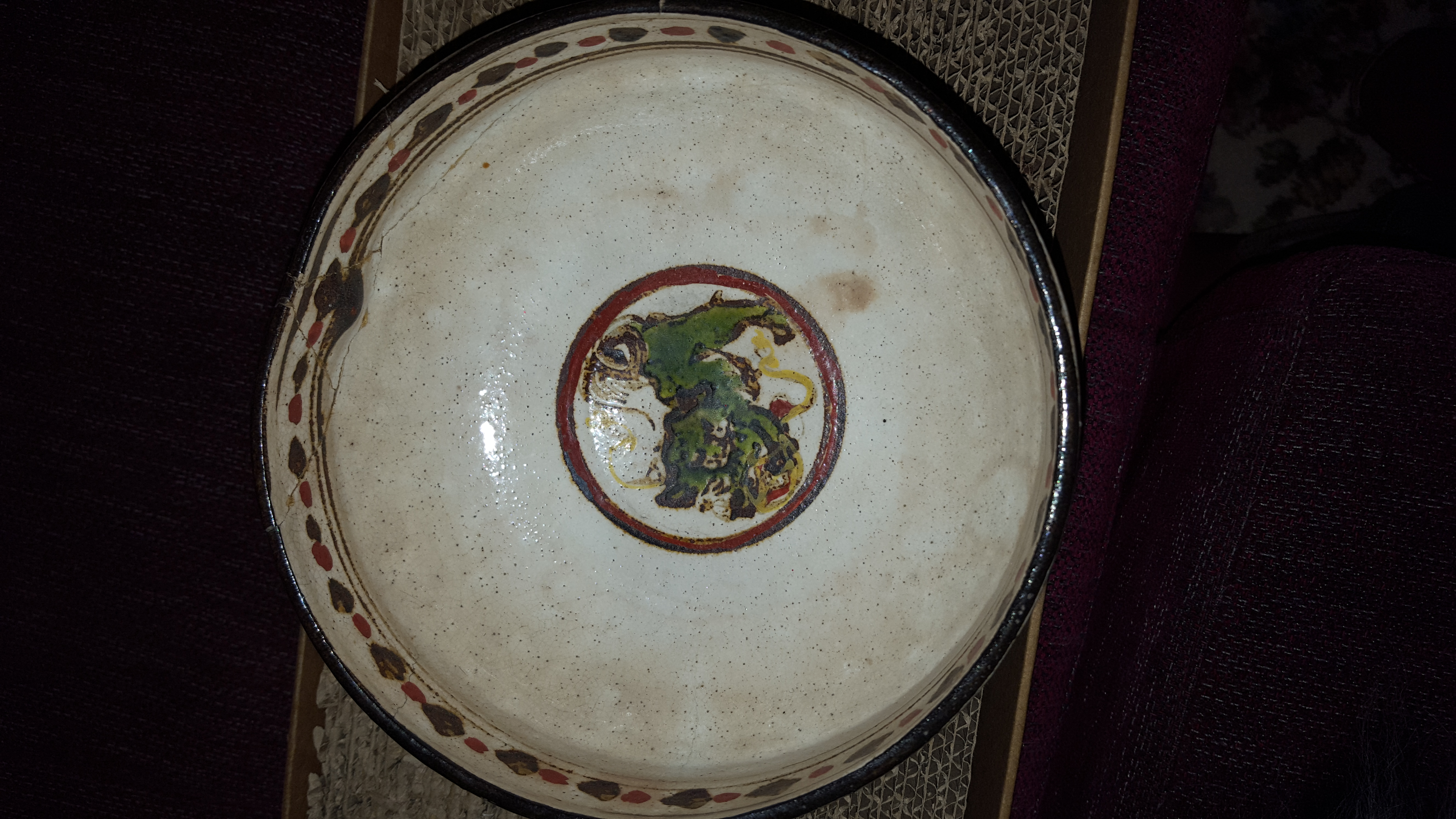 My Grandmother bought this in 2nd hand shop i believe...in the 50s or 60s. Have included a 'hand remote' to give impression of size. I have no idea what country it is from tho suspect Asia. There is an old break and it has been mended. Would like someone to date it and give information if possible. Have shown the marks on the base. It also has a thumb indentation near the rim likely made before firing. Any information will be gratefully received.