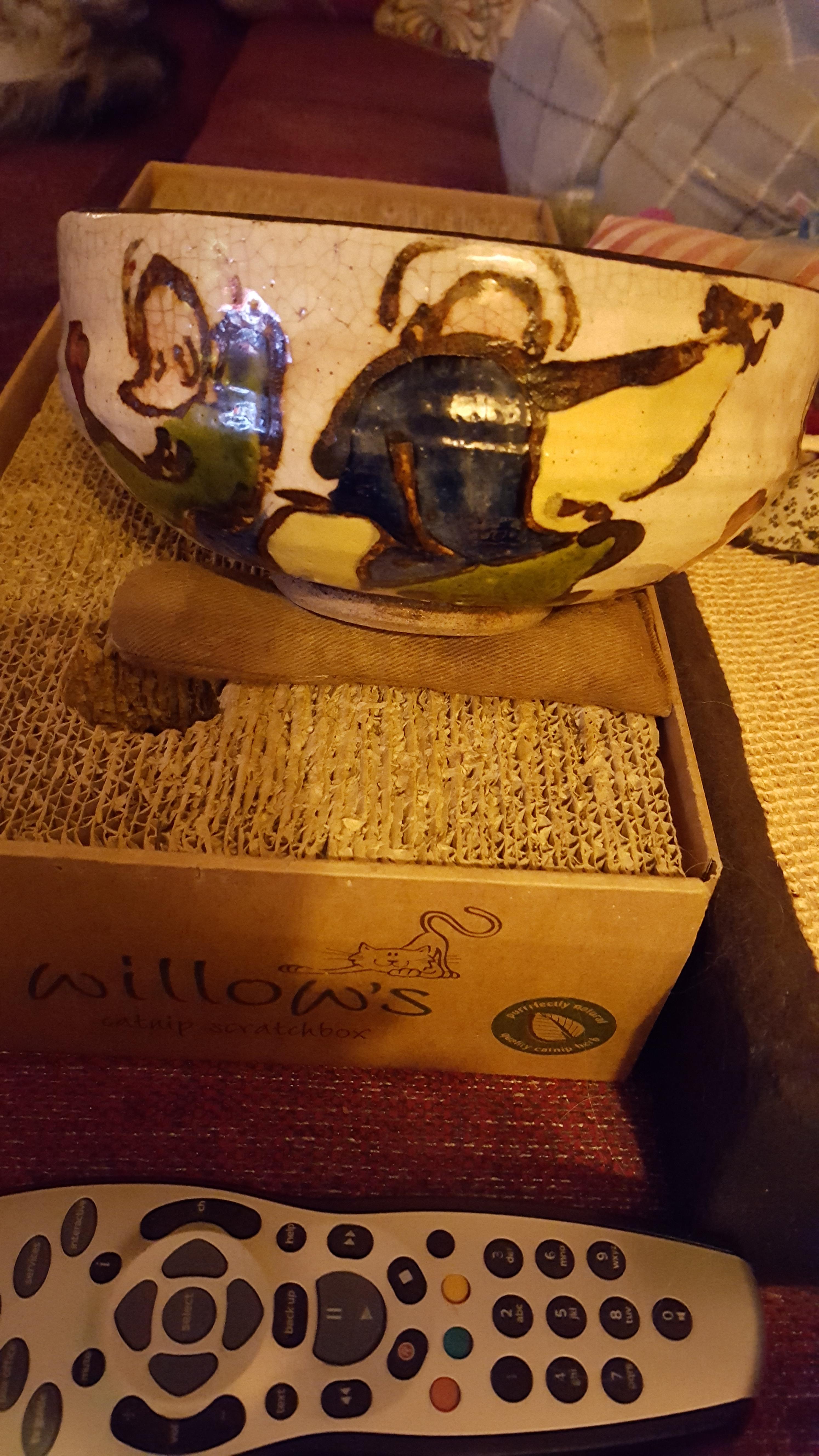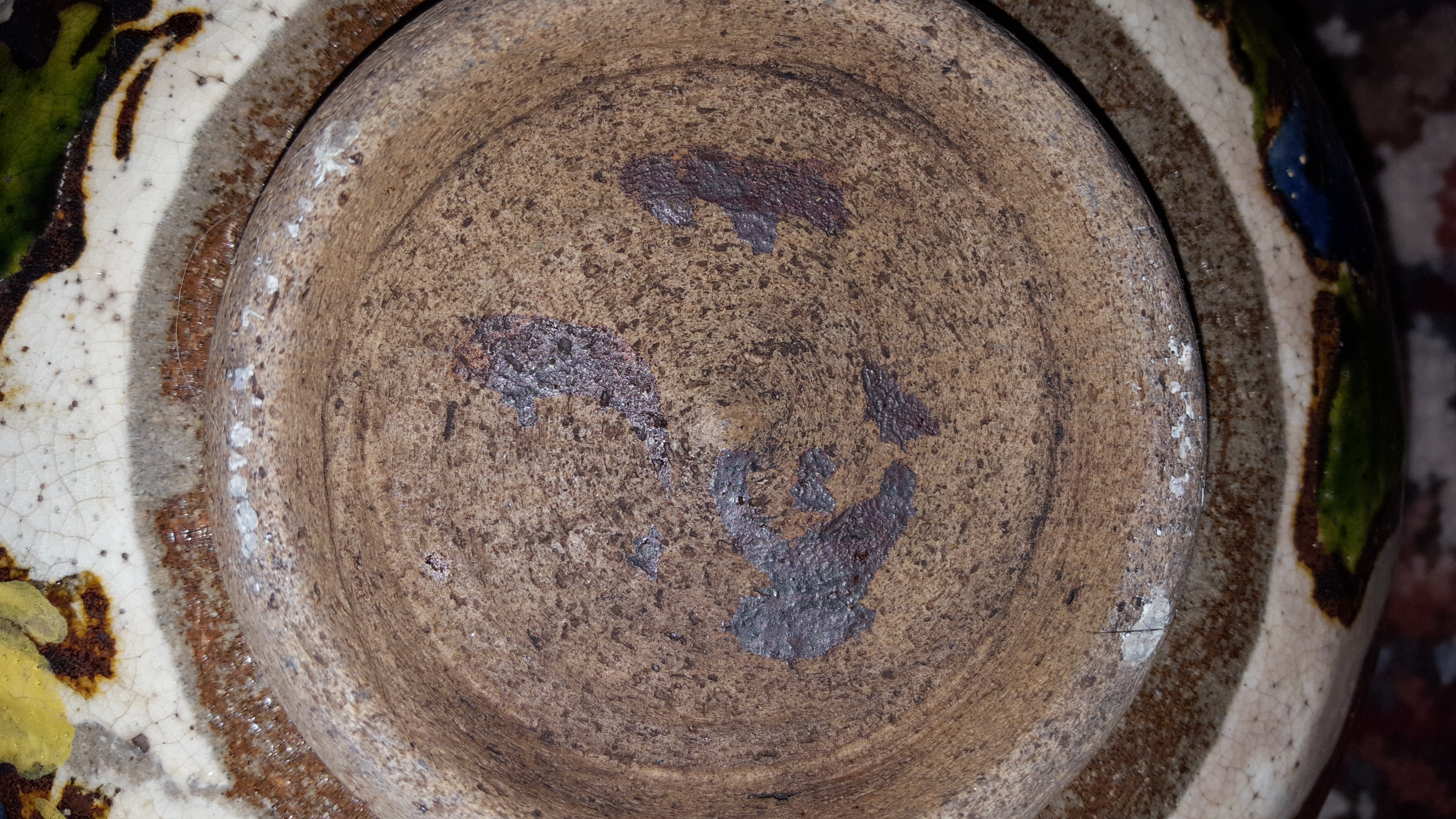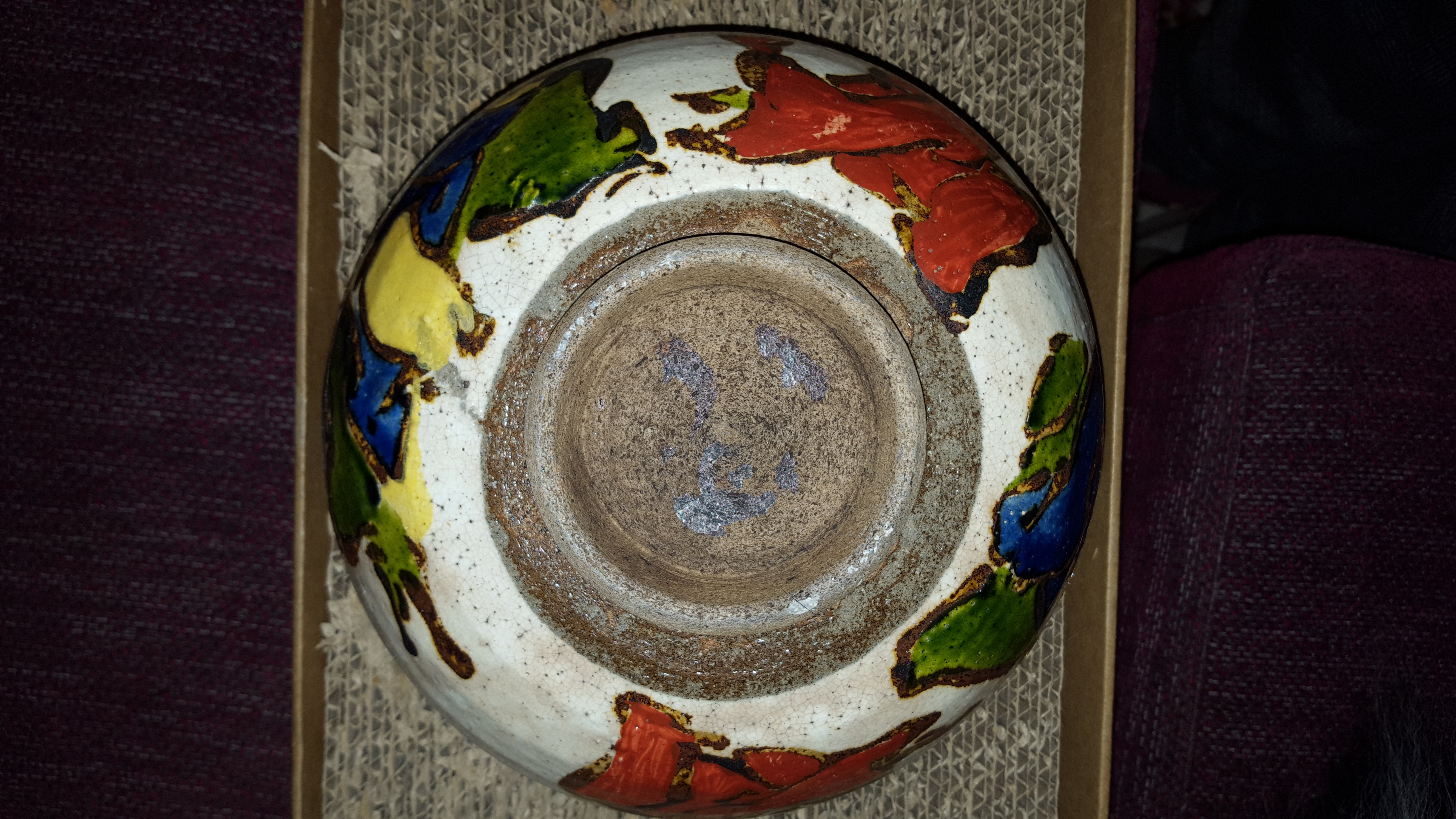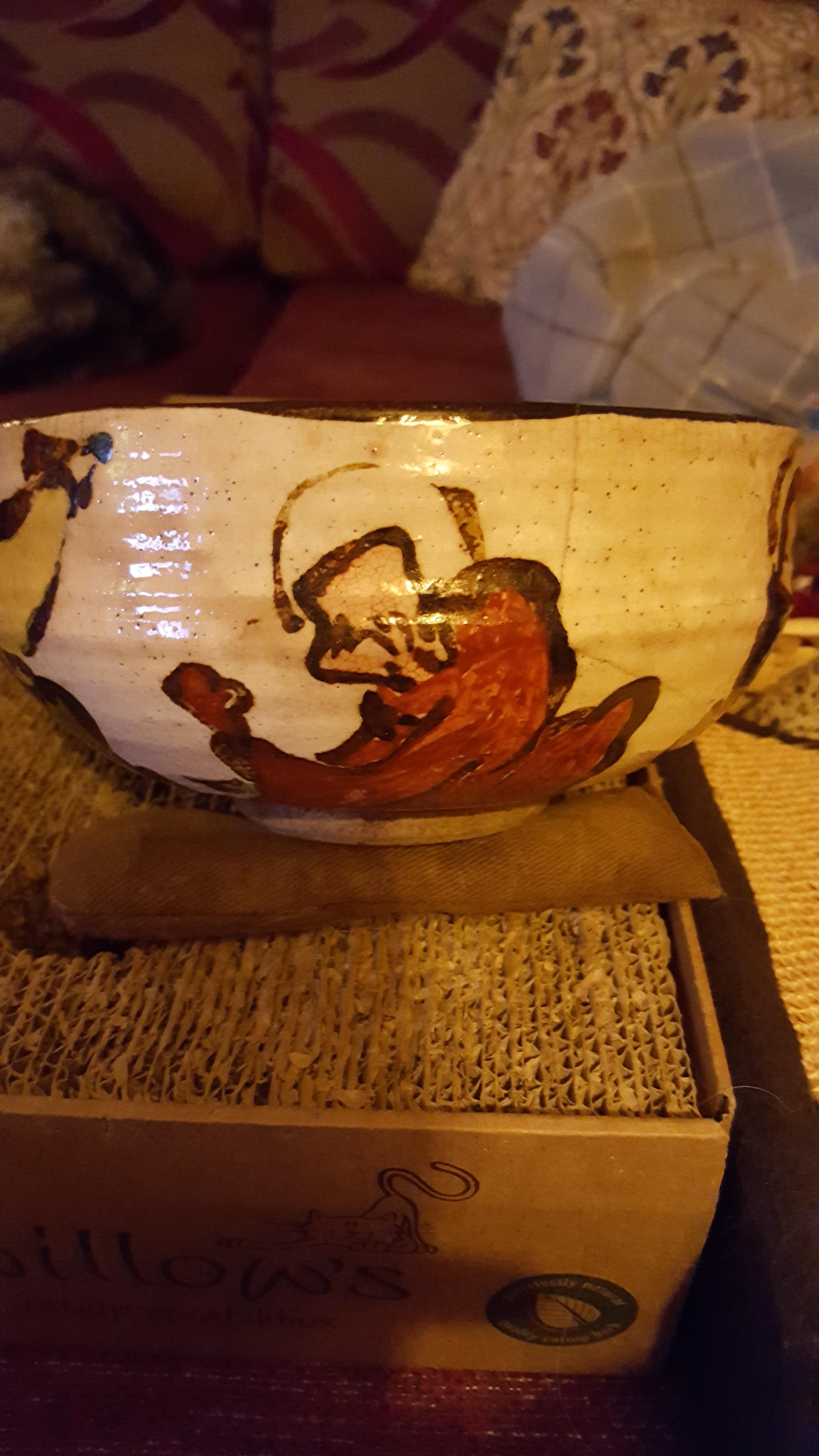 My Grandmother bought this in 2nd hand shop i believe...in the 50s or 60s. Have included a 'hand remote' to give impression of size. I have no idea what country it is from tho suspect Asia. There is an old break and it has been mended. Would like someone to date it and give information if possible. Have shown the marks on the base. It also has a thumb indentation near the rim likely made before firing. Any information will be gratefully received.