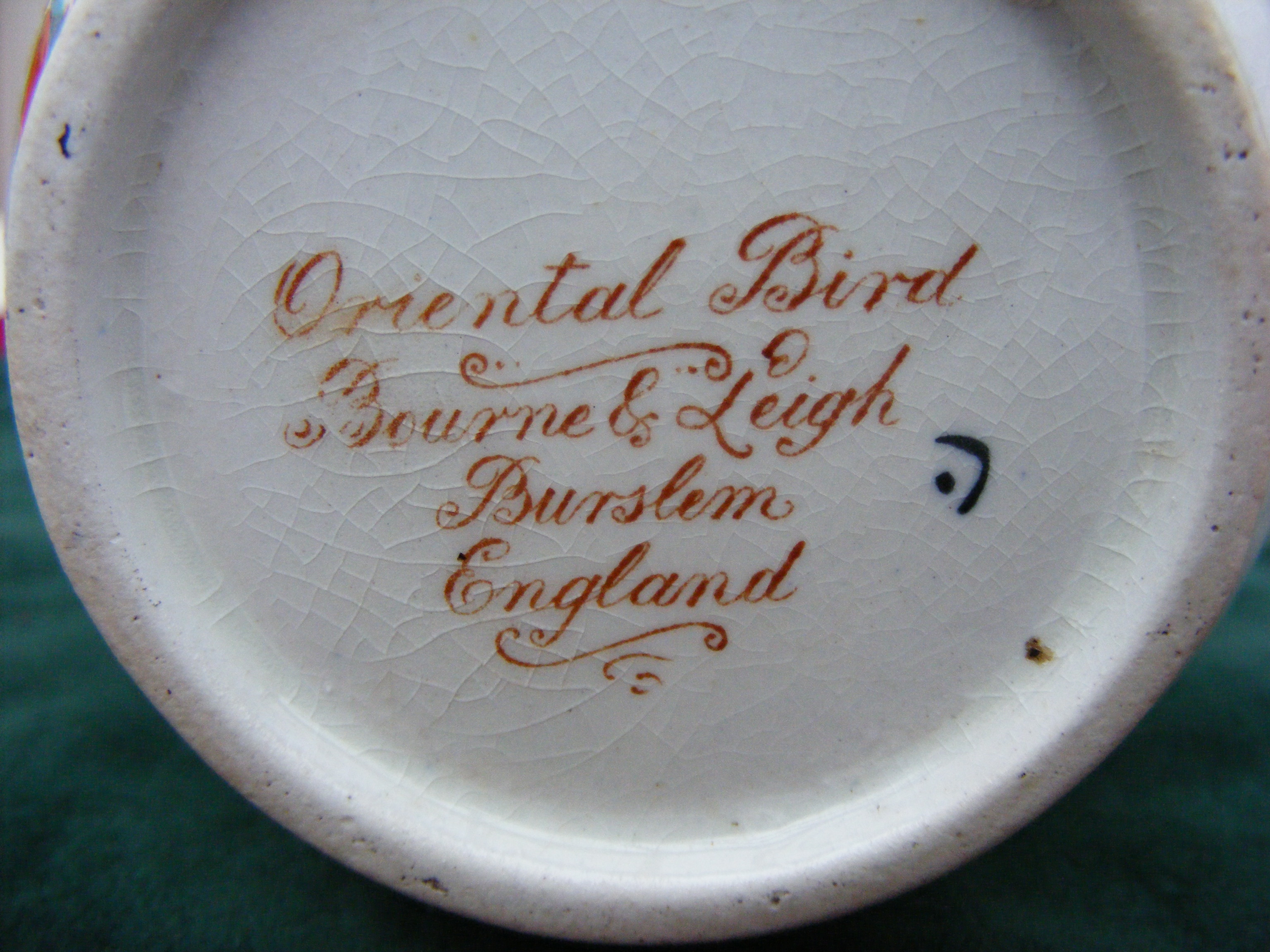 Base is stamped "Oriental Bird, Bourne & Leigh,, Burslem, England"