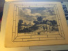 The engraving displays a rhinoceros as the main drawing with several other surrounding images of what look like a turtle a doc a human face. Fine details in limes.