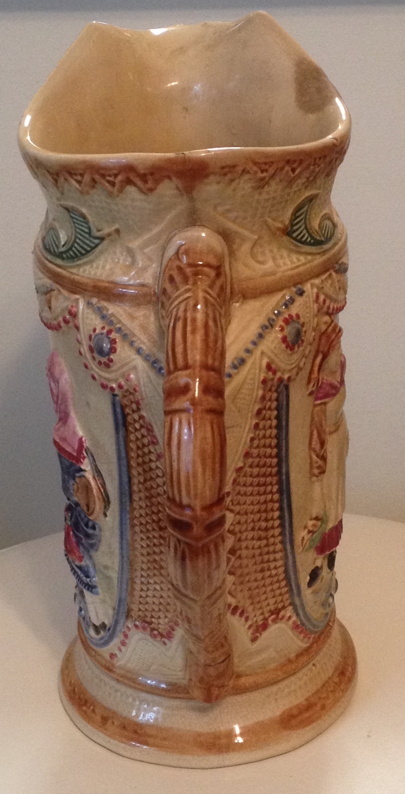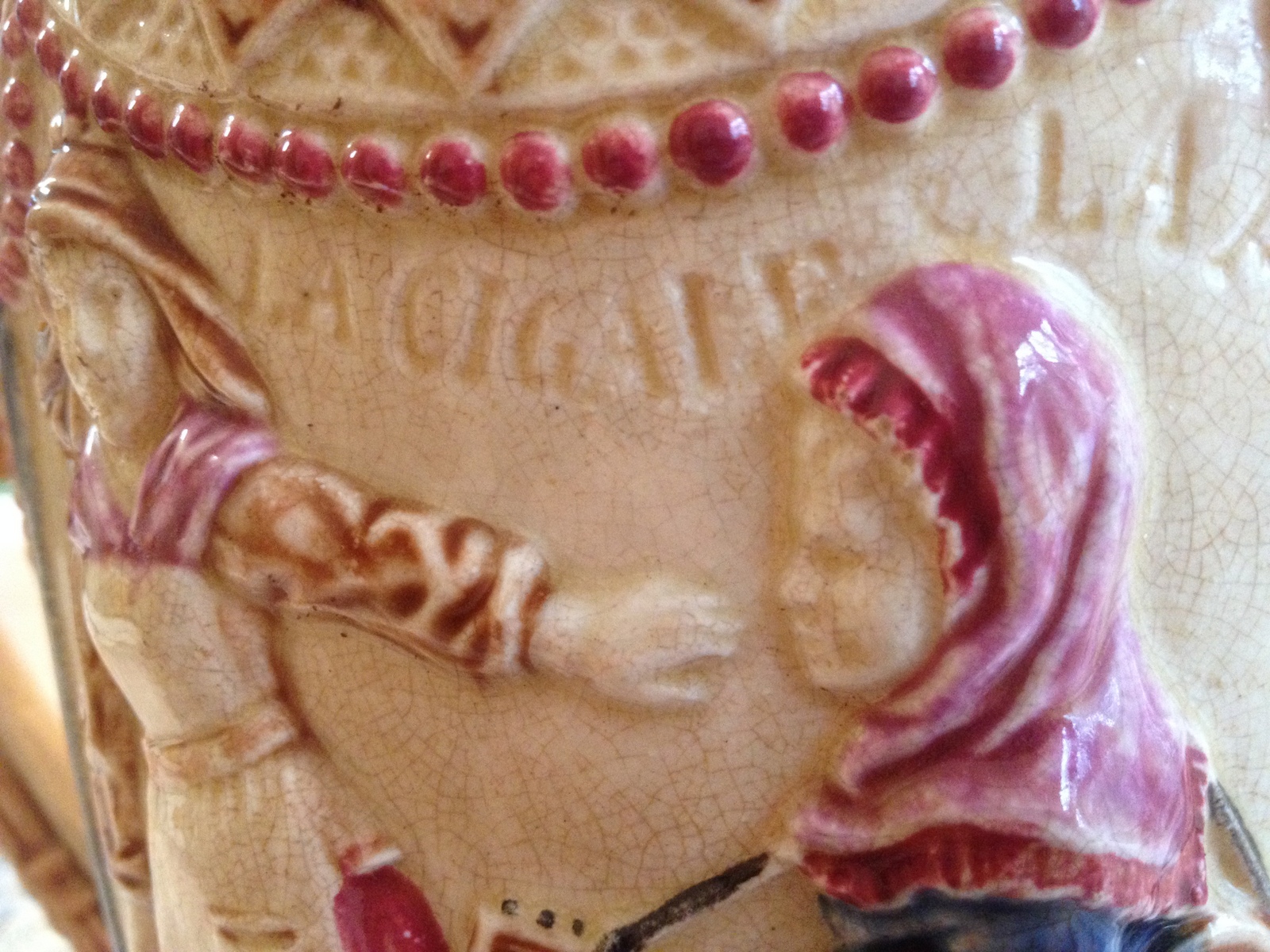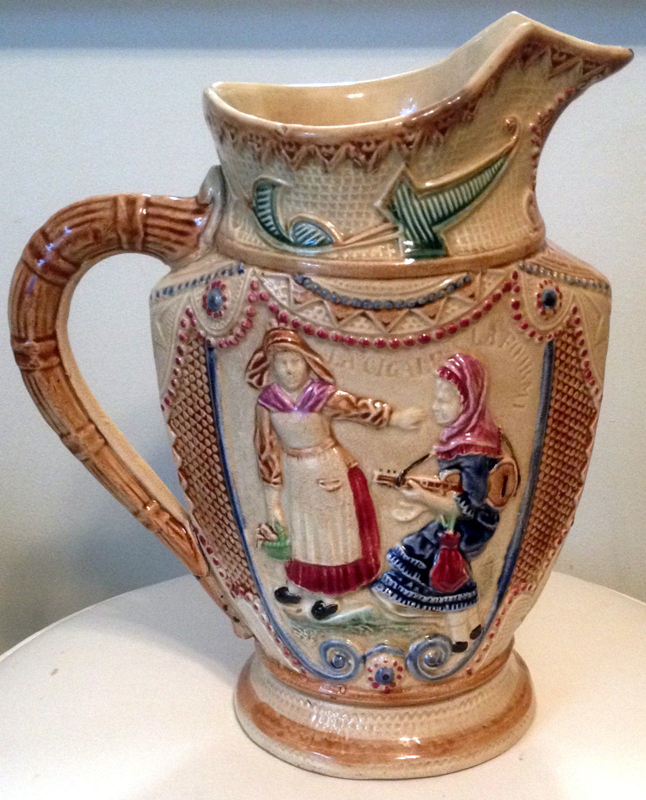 This pitcher is made of white clay, about 12" tall and hand-painted (it is packed away and I have forgotten the actual height). It is decorated on both sides with two peasant girls, one carrying a basket of vegetables, the other holding a stringed instrument (guitar-like). On one side, incised above the girls' heads is "La Cigale & La Fourmi" (The Ant and the Grasshopper-or The Ant and the Cricket, a French fable). The bottom is hand-signed with Greek letters, a red Sigma and a blue Delta, and possibly a brown Chi and Omicron. The glaze is crazed and the colors are good. There are a few chips; it appears to be old. Note: the green "flag" decoration near the rim of the pitcher is a mirror image on the two sides but the girls are not. Could the girls be formed by a mold and applied? The two sides are such a perfect replica of one another.