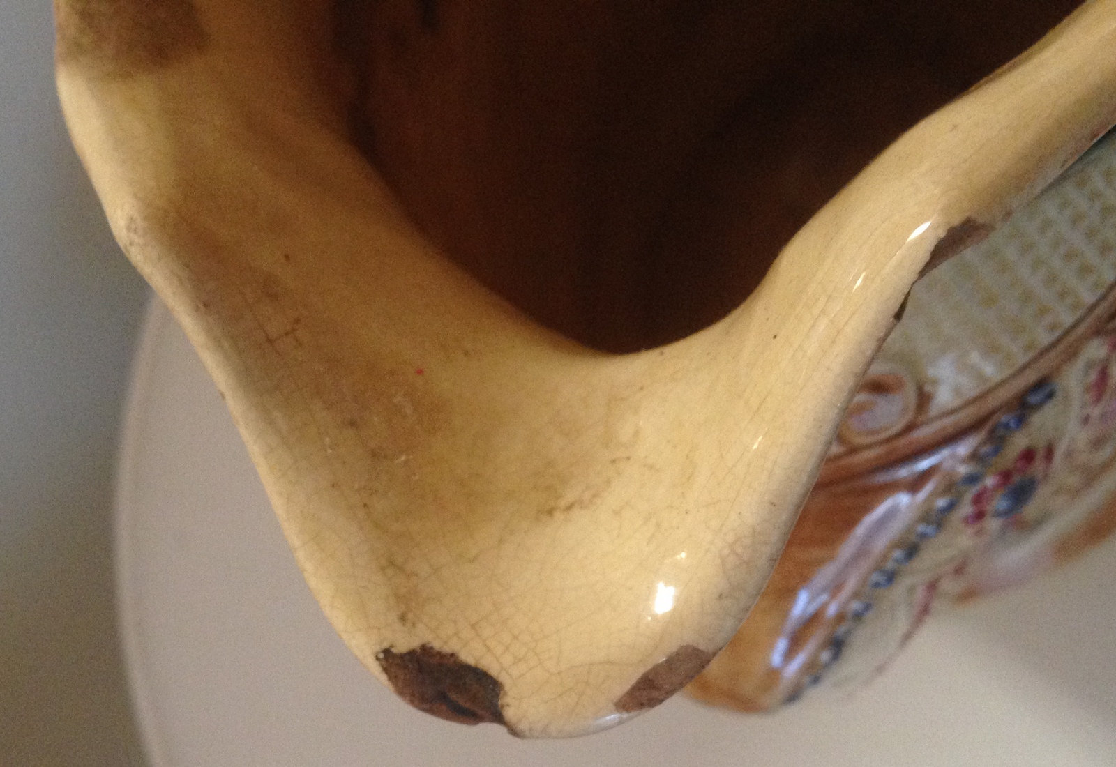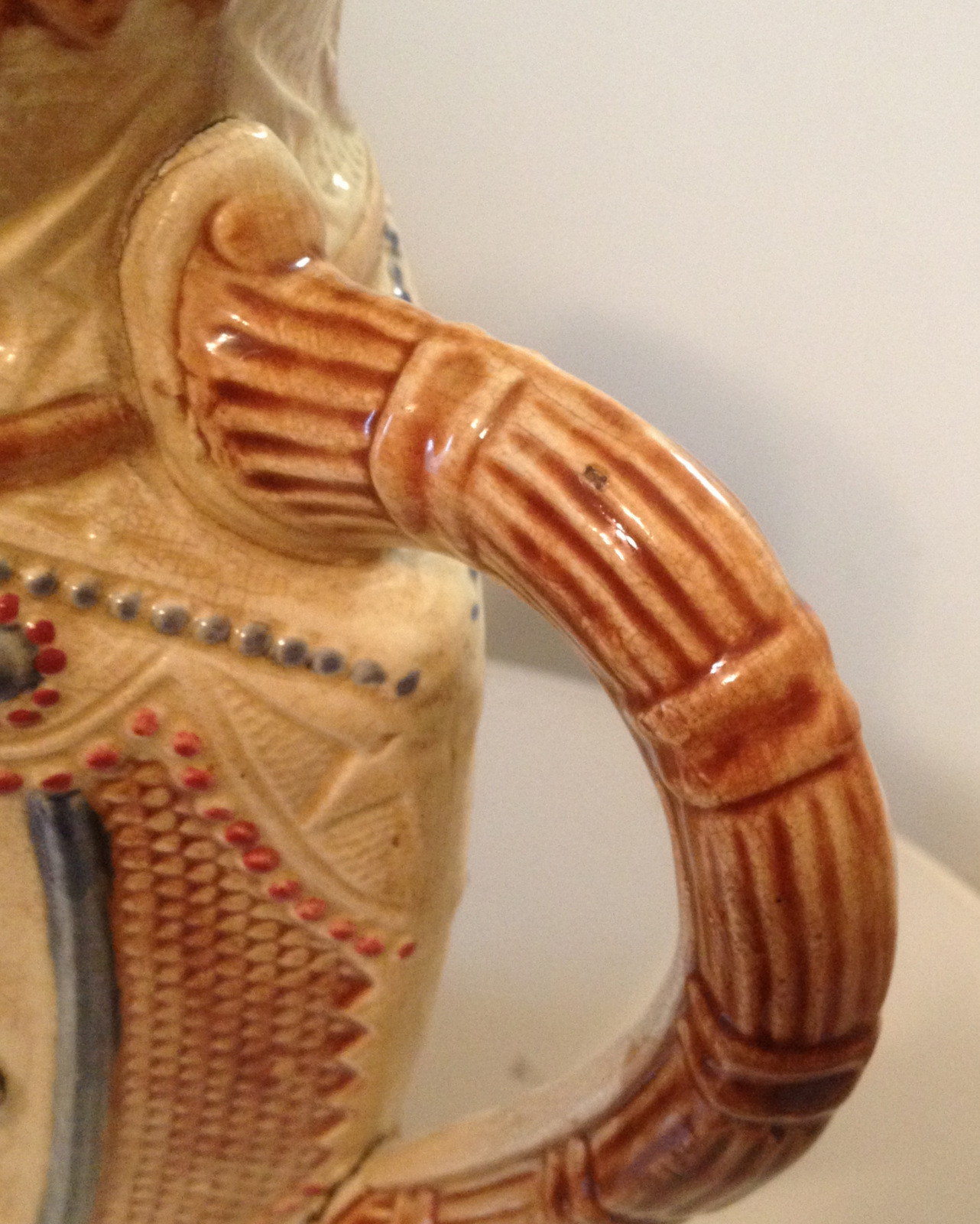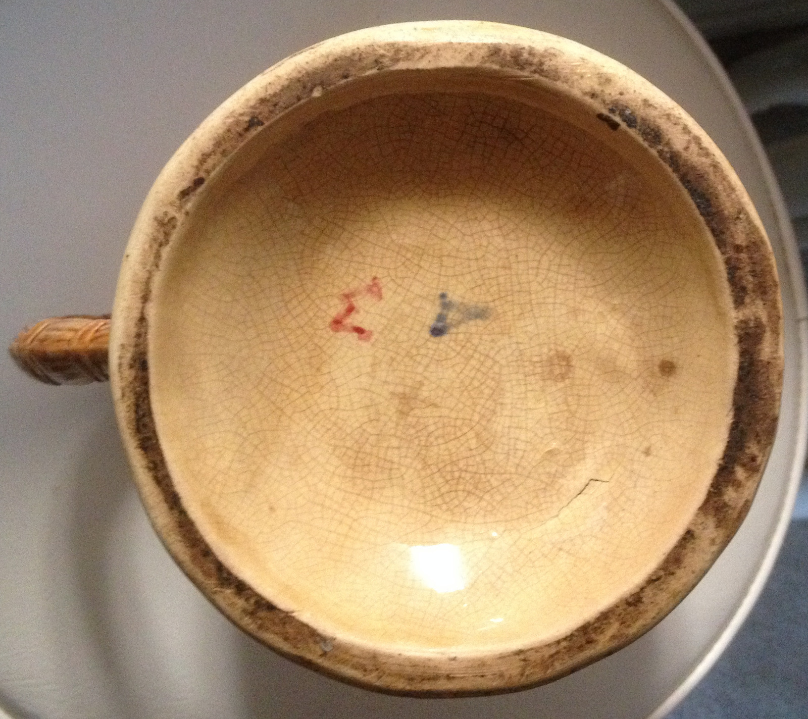 This pitcher is made of white clay, about 12" tall and hand-painted (it is packed away and I have forgotten the actual height). It is decorated on both sides with two peasant girls, one carrying a basket of vegetables, the other holding a stringed instrument (guitar-like). On one side, incised above the girls' heads is "La Cigale & La Fourmi" (The Ant and the Grasshopper-or The Ant and the Cricket, a French fable). The bottom is hand-signed with Greek letters, a red Sigma and a blue Delta, and possibly a brown Chi and Omicron. The glaze is crazed and the colors are good. There are a few chips; it appears to be old. Note: the green "flag" decoration near the rim of the pitcher is a mirror image on the two sides but the girls are not. Could the girls be formed by a mold and applied? The two sides are such a perfect replica of one another.