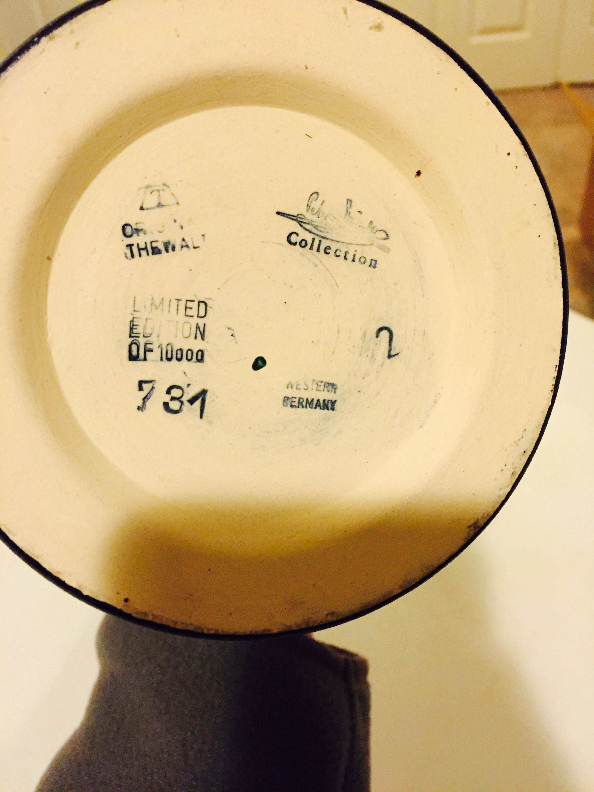 Not sure of the value and good use some help it says is manufactured thewalt west Germany has original tag bottom has stamped 731 west Germany the Walt and artists name. If you could let me know I would appreciate it thanks