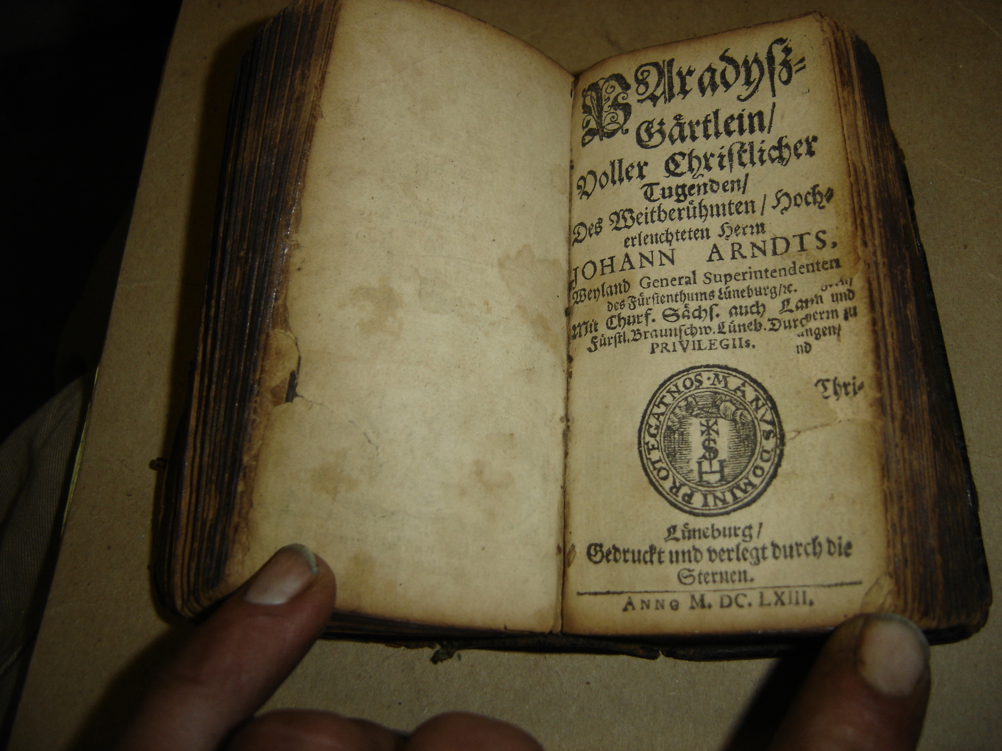 Old German prayer book. I really don"t know alot about thi book except that it was given as a gift to its original owner from a noble Brandenburg in 1659. I think it was published in Luneburg but being that my old German is nonexistant I can't be sure about even this. If anybody has any info even I would appreciate the feedback.