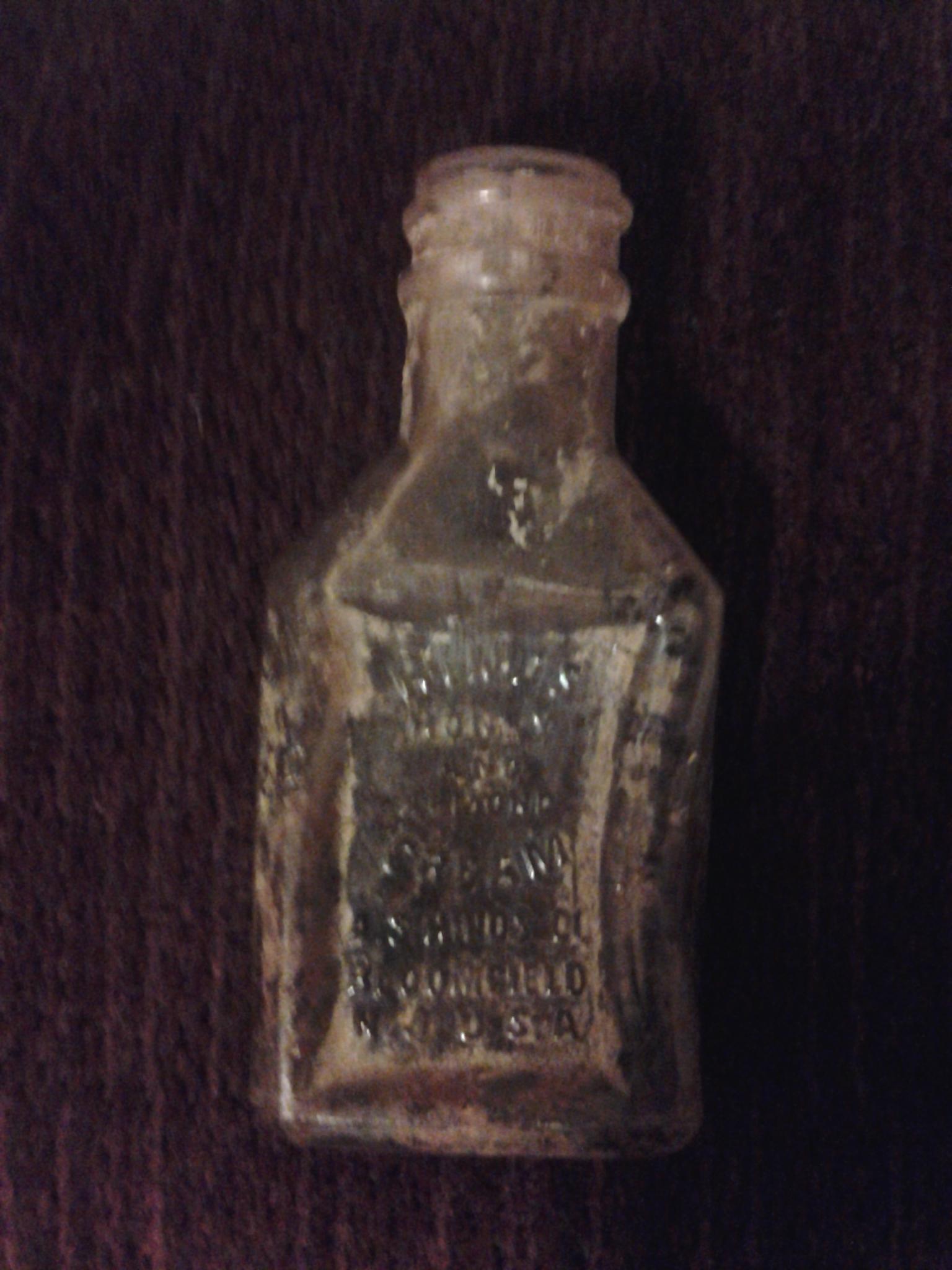 Smal clear rectangle shape bottle that reads hinds honey and almond cream also the maker a.s. hinds bloomsfeild n.j. u.s.a.
