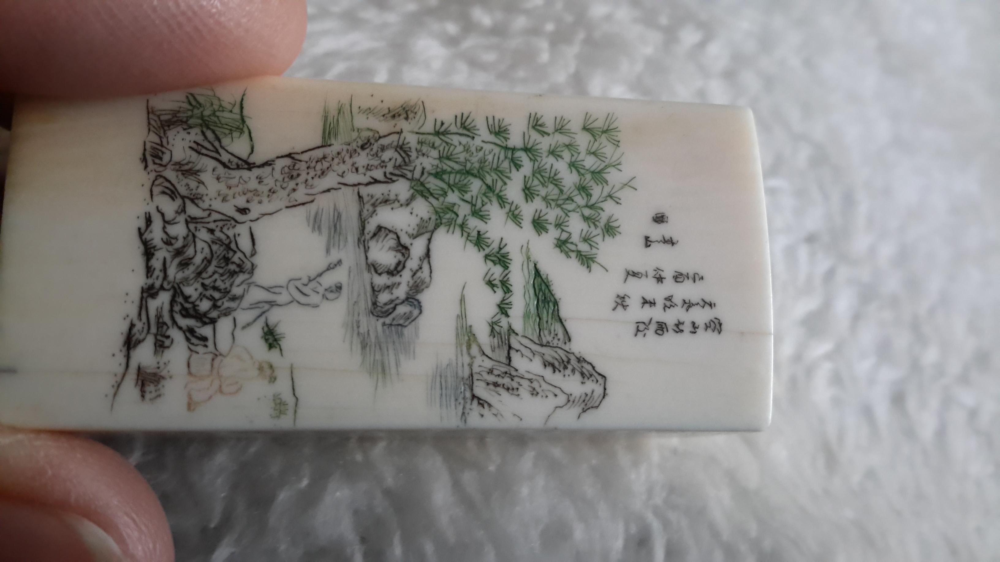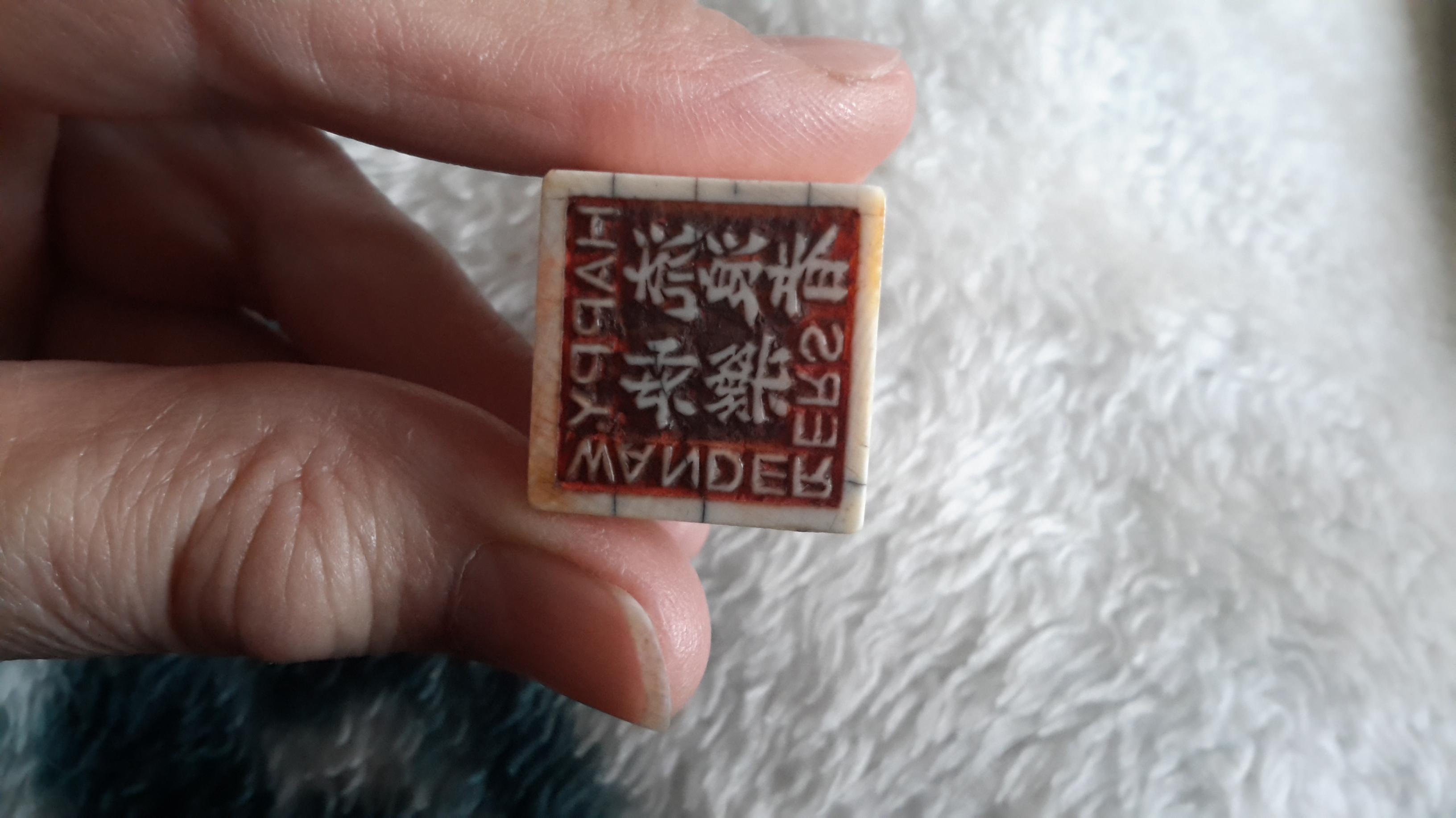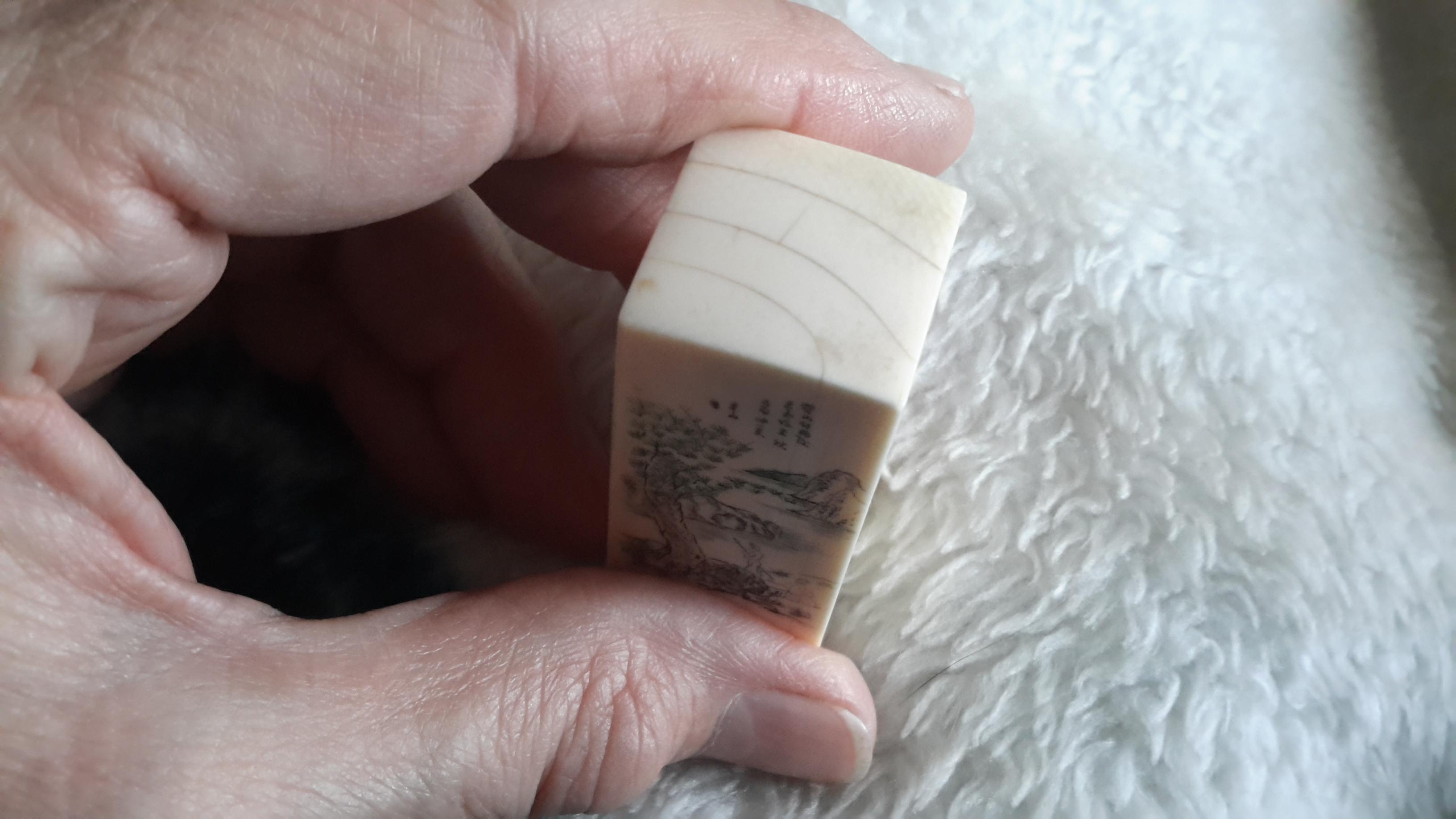 Was told this is a leter stamp used by a sea captain.has oriental characters carved on the stamp face along with "happy wanderers". Face has pictorial scrimshaw scene with river, tree, mountain and two people. One seated, one standing holding a long walking stick. More charcters. 2" tall about 1c square. The stamp face shows use of red ink.