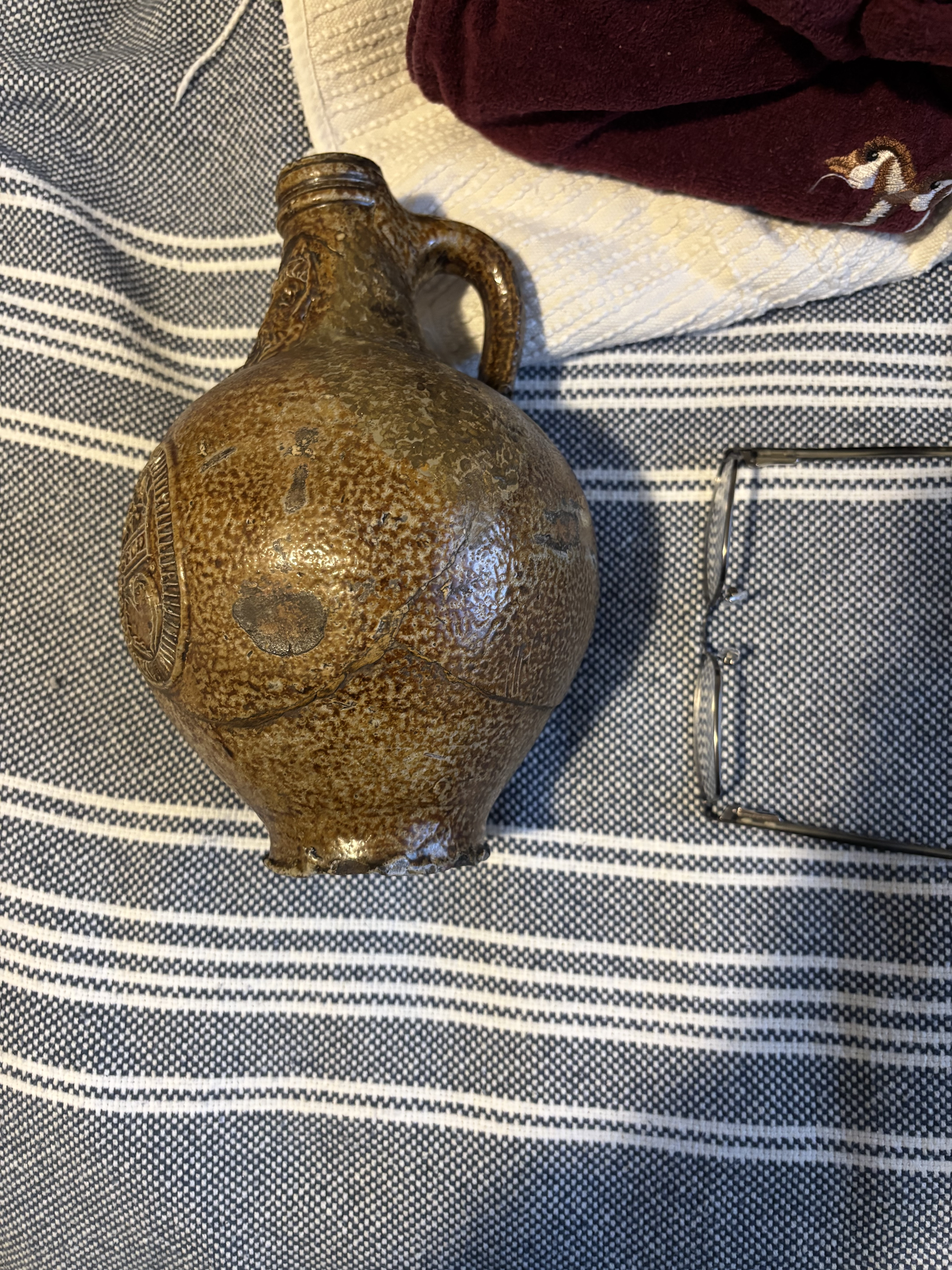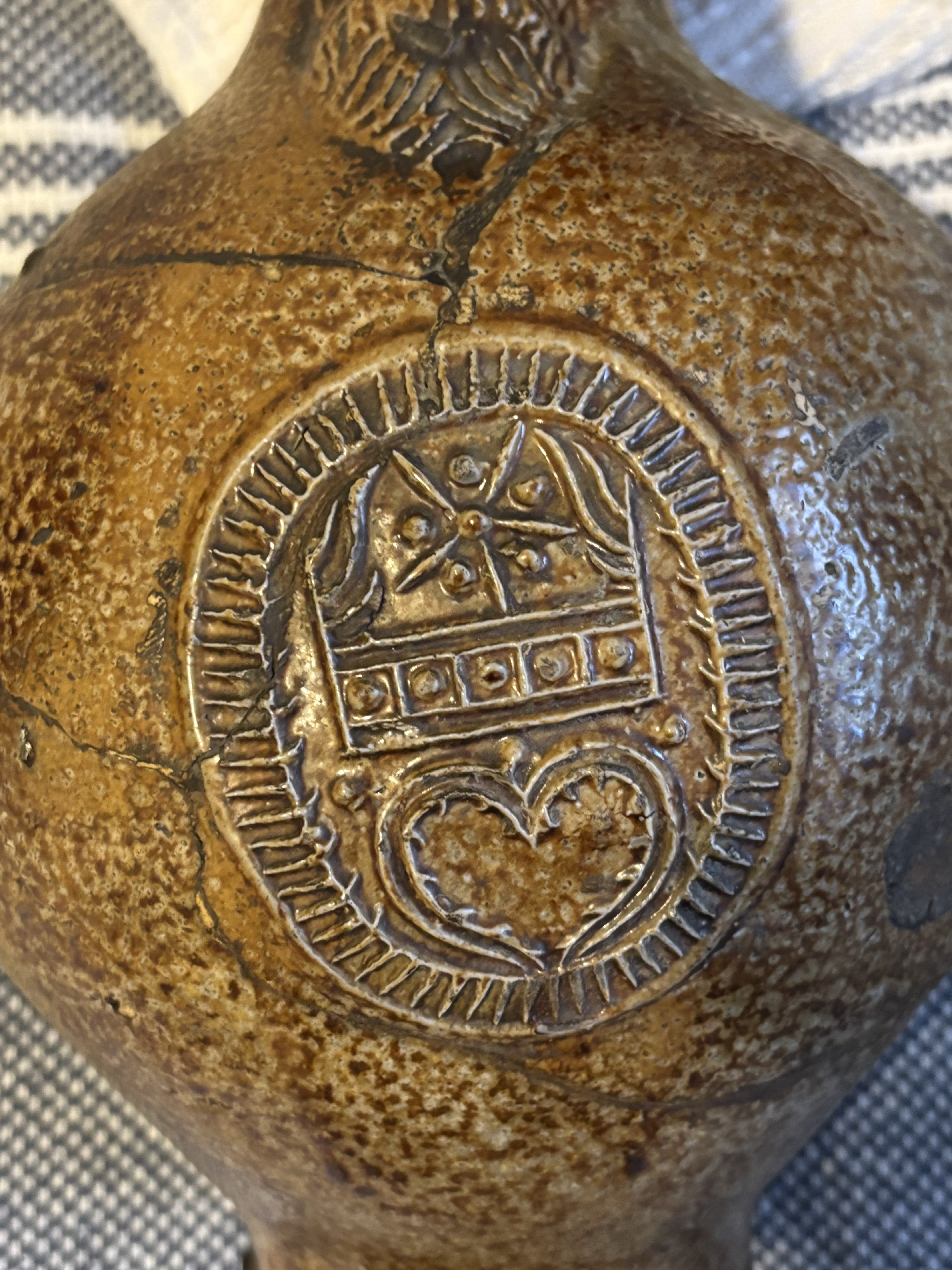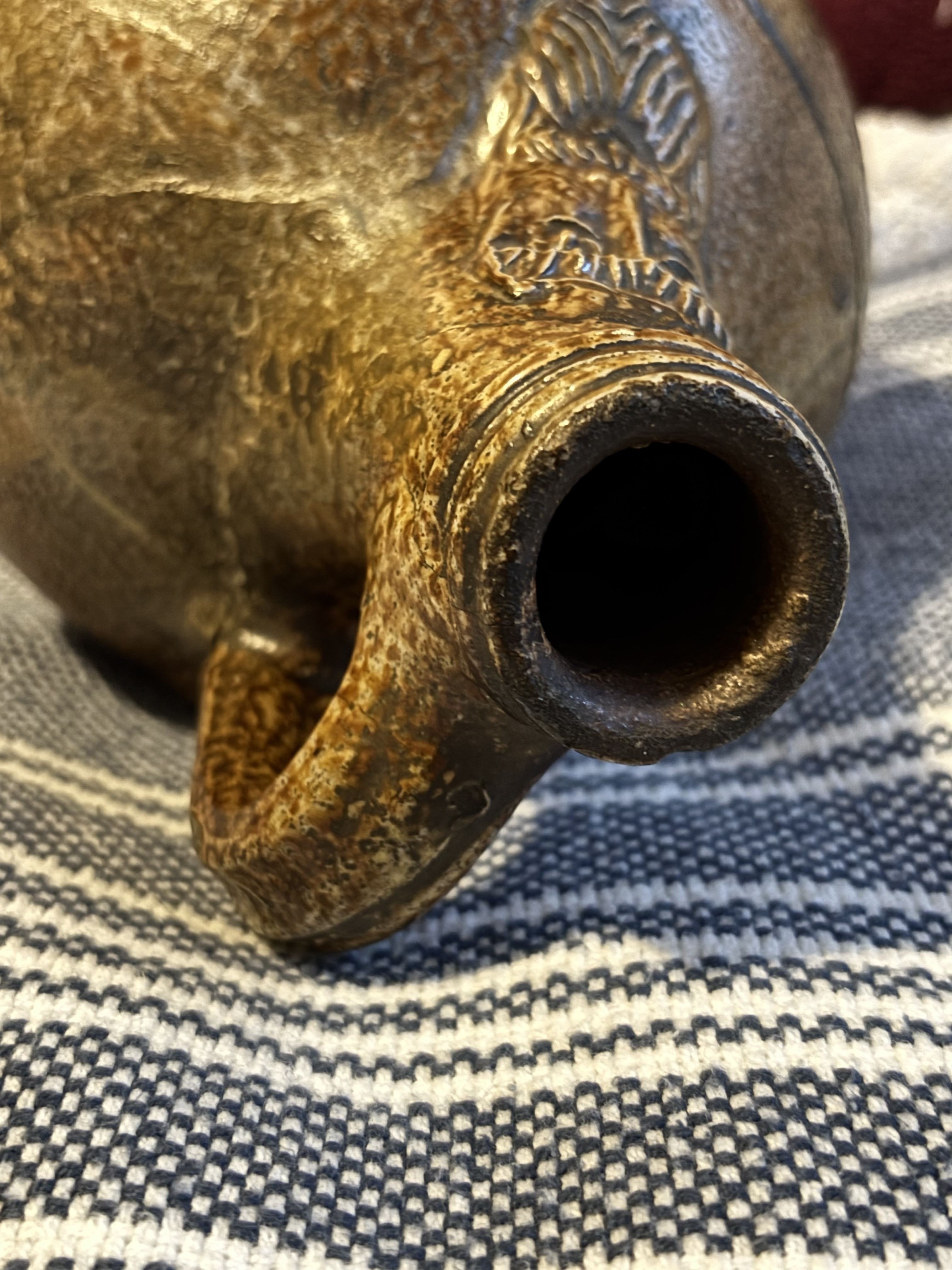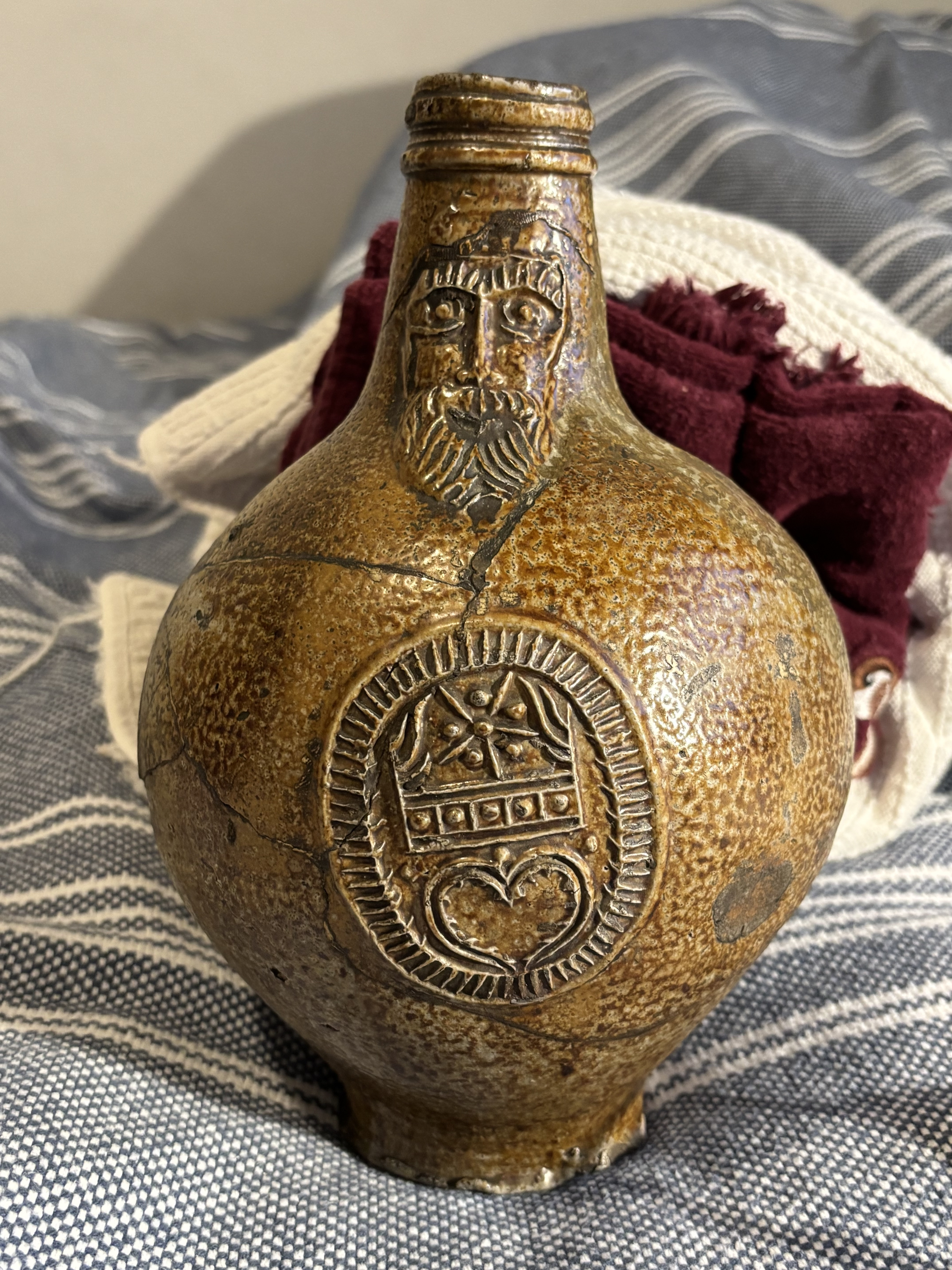 Your item is a Bartmann jug, a form of salt-glazed stoneware that was widely produced in the Cologne and Frechen regions of Germany from the 1500s through the 1700s. These jugs are immediately recognizable due to the applied bearded face mask on the neck and medallion-like stamped decoration on the belly.