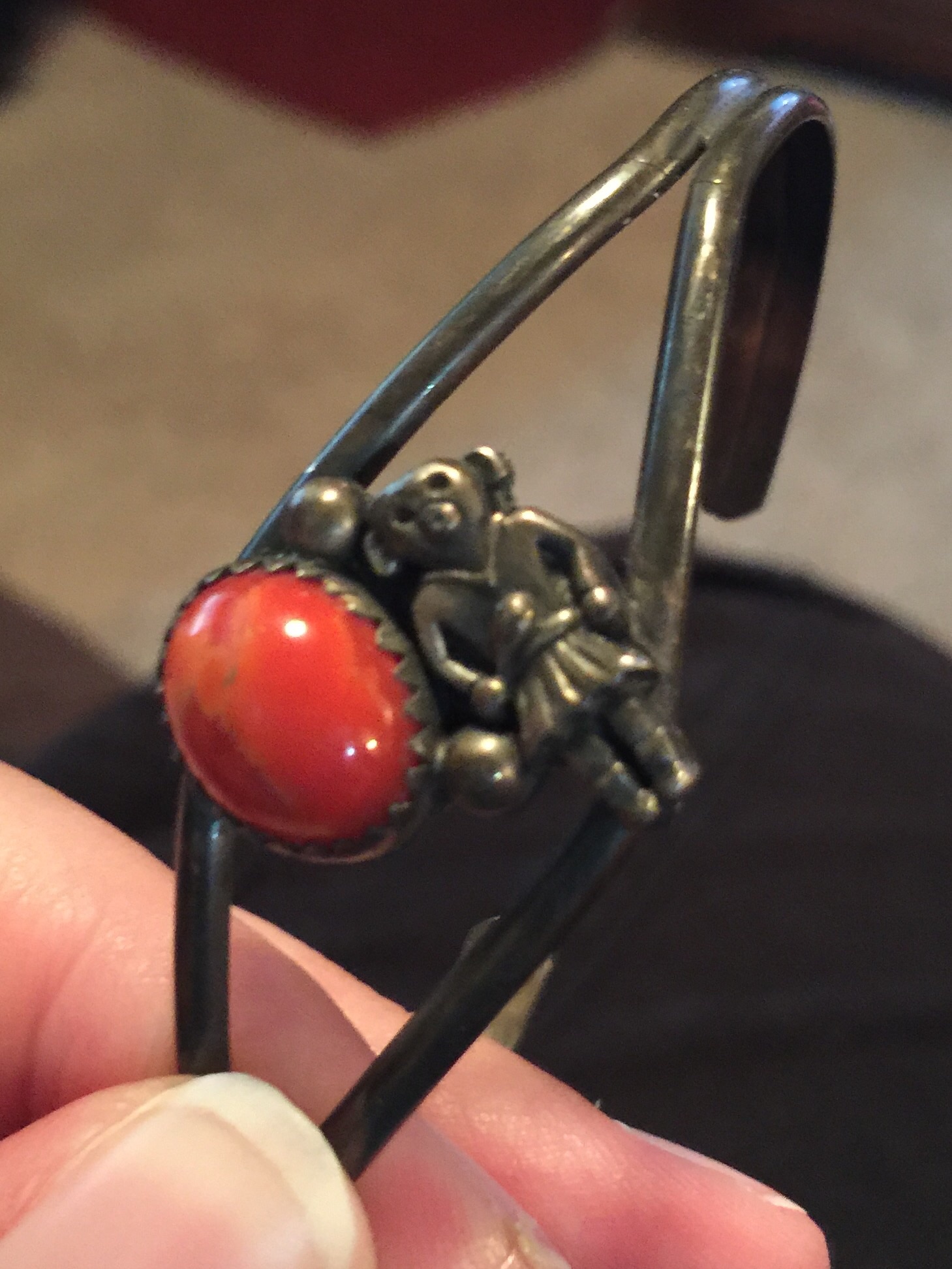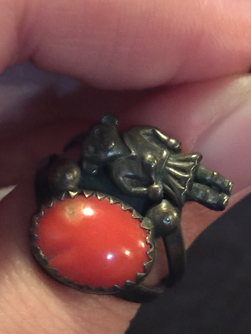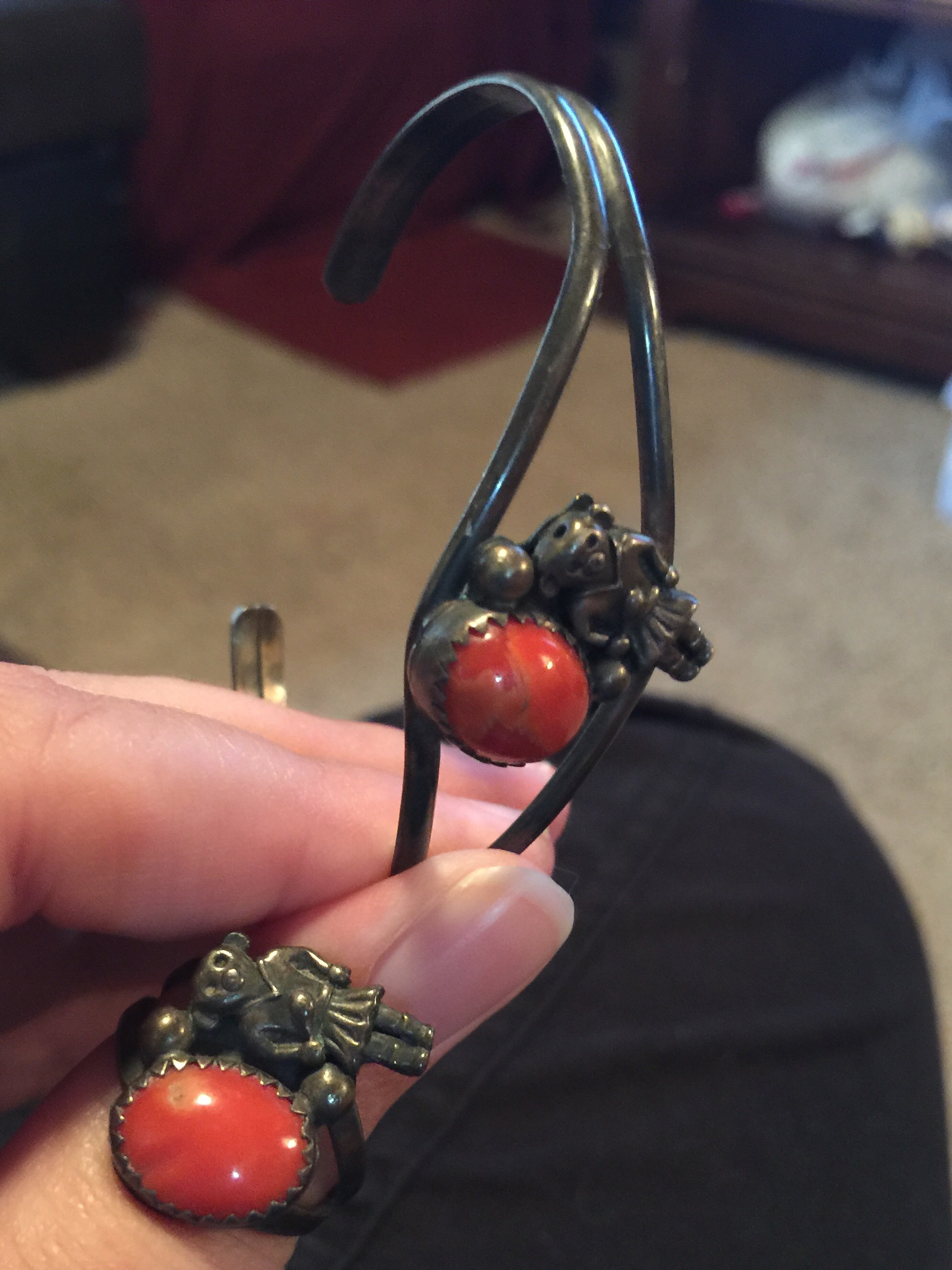 It is a matching ring and bracelet set. On the left side it features a red stone and to the right of that is an animal (a monkey, lamb or bear. I can't quite tell) standing upright in a v-neck sweater, skirt and boots. The animal is holding what looks like a club. She may be a band majorette??