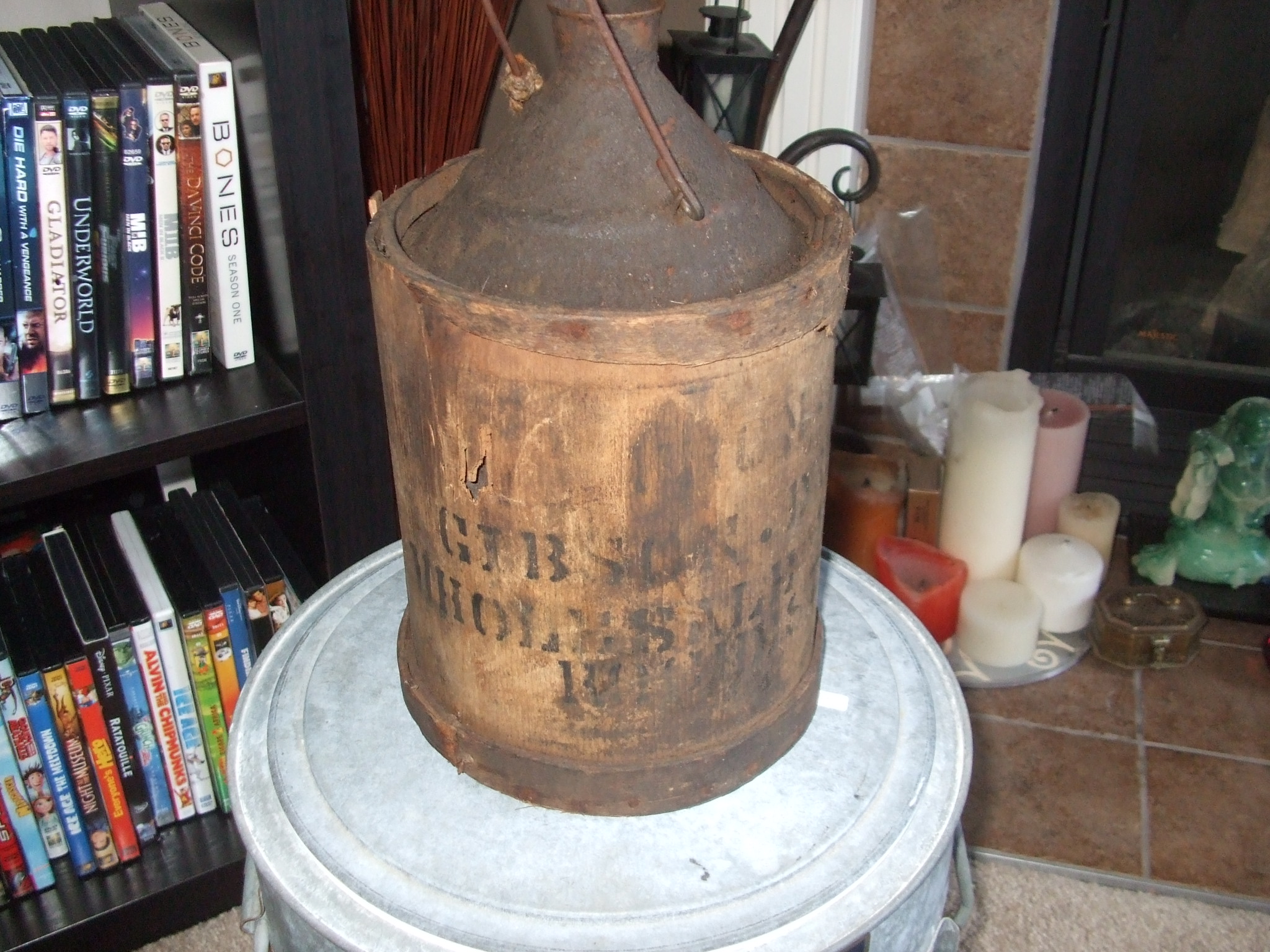 I haven't done anything to try to clean this up to see what type of metal it is. The whole stencil on the side is "Gibson Drug Co., Wholesale Druggery, Rochester, NY" It's in pretty good shape considering it's apparent age. I can't find any refrence to it on line.
