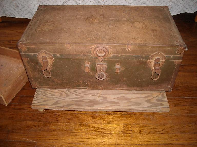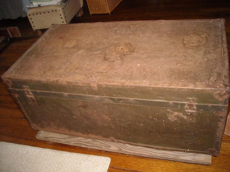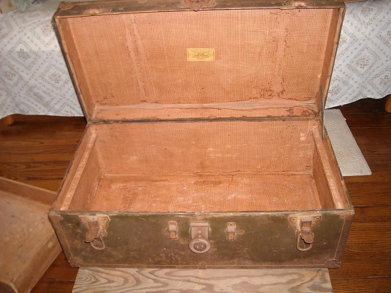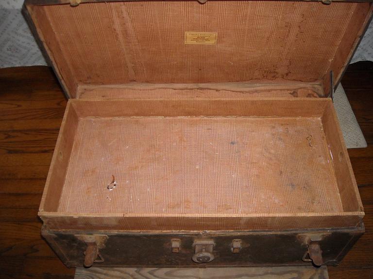I bought this at an estate auction in Oklahoma a few years back. It had been stored in their barn. In it were some very old family portraits in frames and an old men's brush set. It measures 30 1/2" x 16" x 12" deep. Handles are gone, but hardware is still there. It is a bit rough for condition. Inside, as can be seen in pictures is also a bit rough, but still intact.