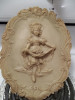 a very large framed tapestry -- the detail is beautiful and graceful, the colors muted and darkened with age. It is moorish or Egyptian, a street scene with a graceful dancer. a man on a horse looks on, and a band is seated on the ground around her playing tambourines and drums. Fell in love with the beautiful detail when I saw it, even though the colors were muted with age.