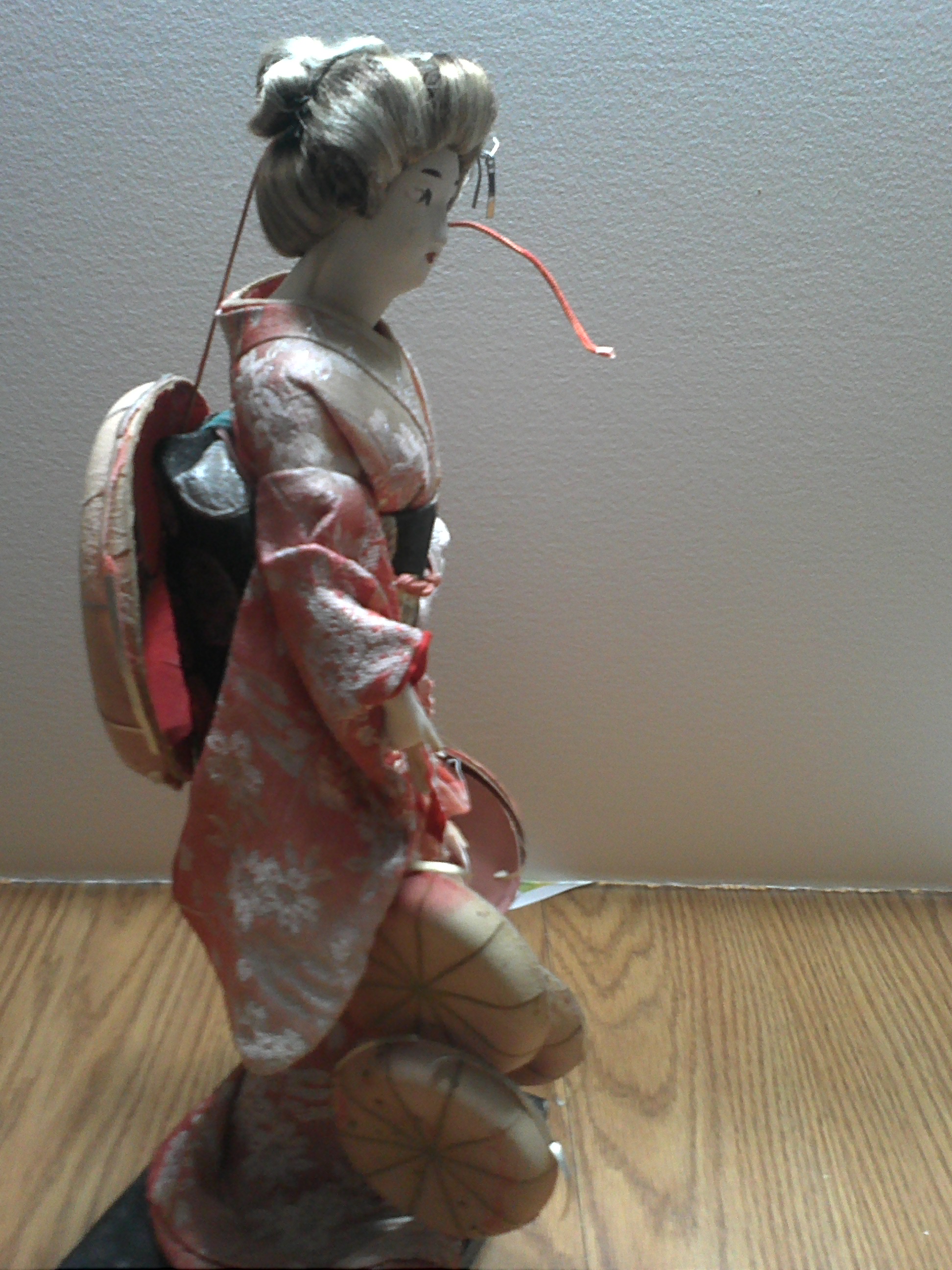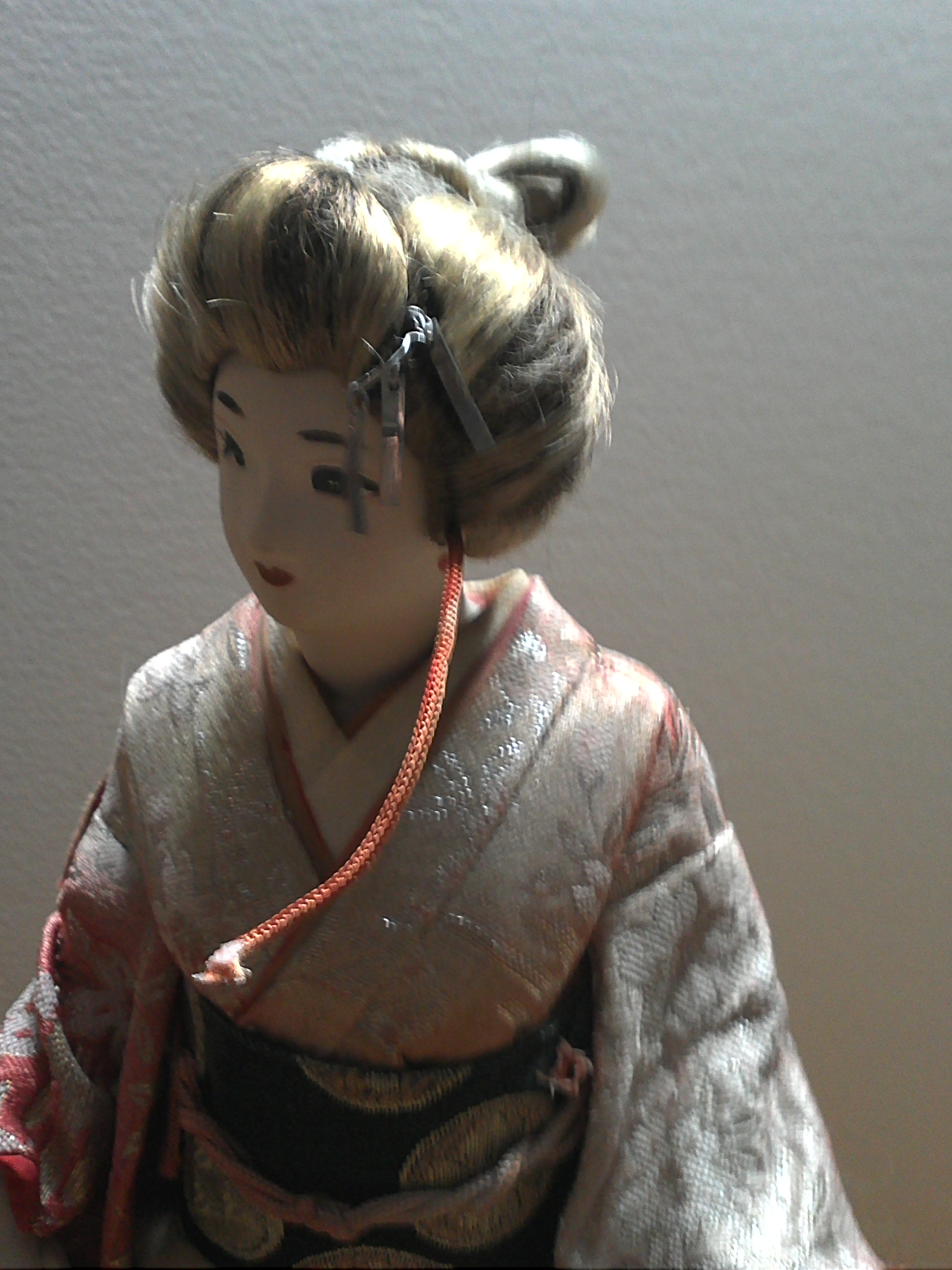 While browsing a local thrift shop, I came across a rather old looking Nishi Doll. While it has quite a few condition issues, it is for the most part very attractive. I paid 8 USD for it, and would like to know what it is worth. I have seen them go online anywhere from 30-500 USD, but I couldn't locate my model anywhere. The Nishi Co. Sticker on the bottom doesn't have a number of any sort, and the hair is light colored (Sun damage maybe? because the top of her kimono is faded a little as well) Anyway, I was wondering if someone could tell me what it is worth in its current condition? would there be a way to get it restored and boost it's value?