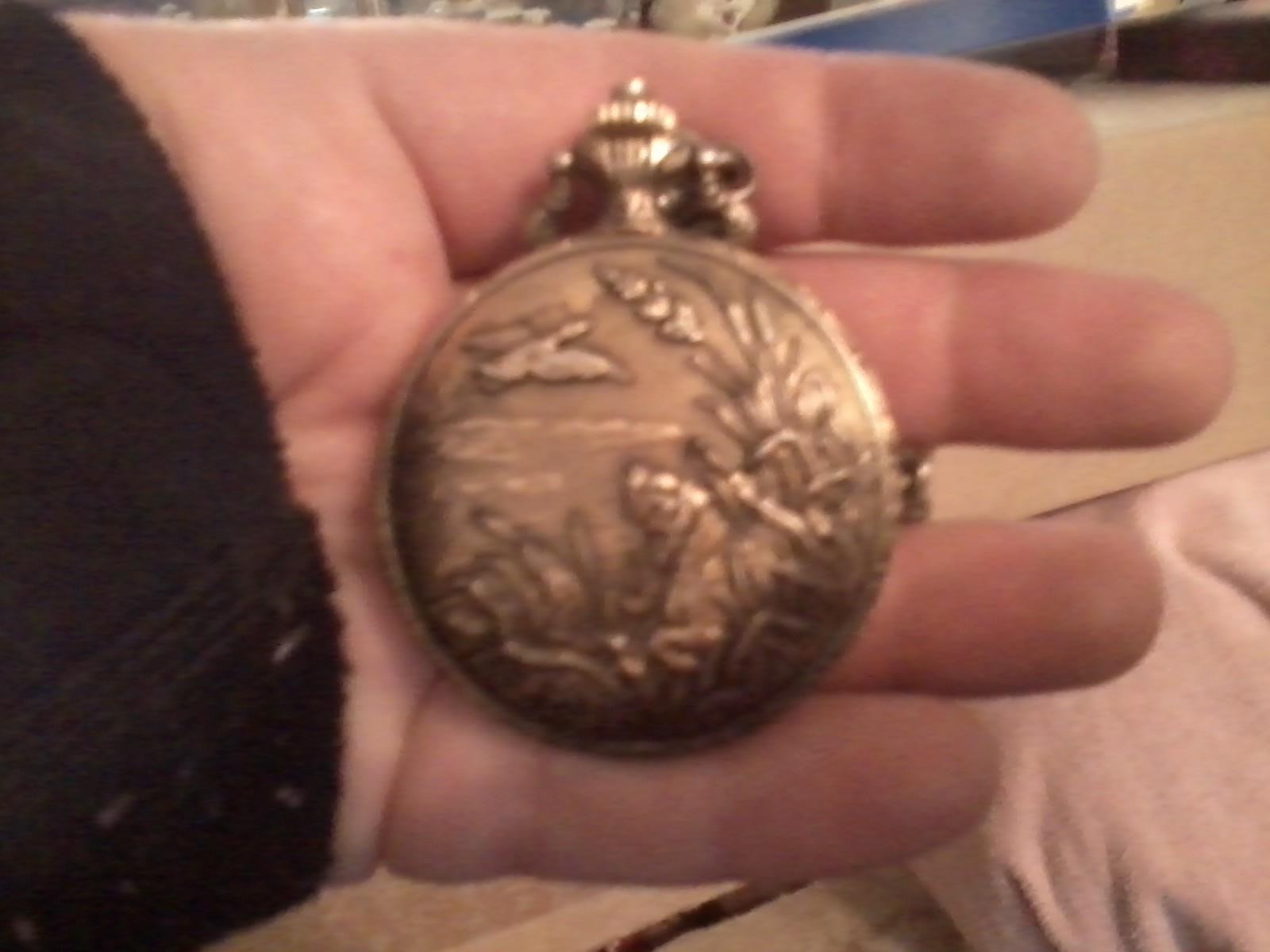 This pocket watch has "Dundee Jewelers" on the watch face, shock resistant on the watch face, and has roman numerals.