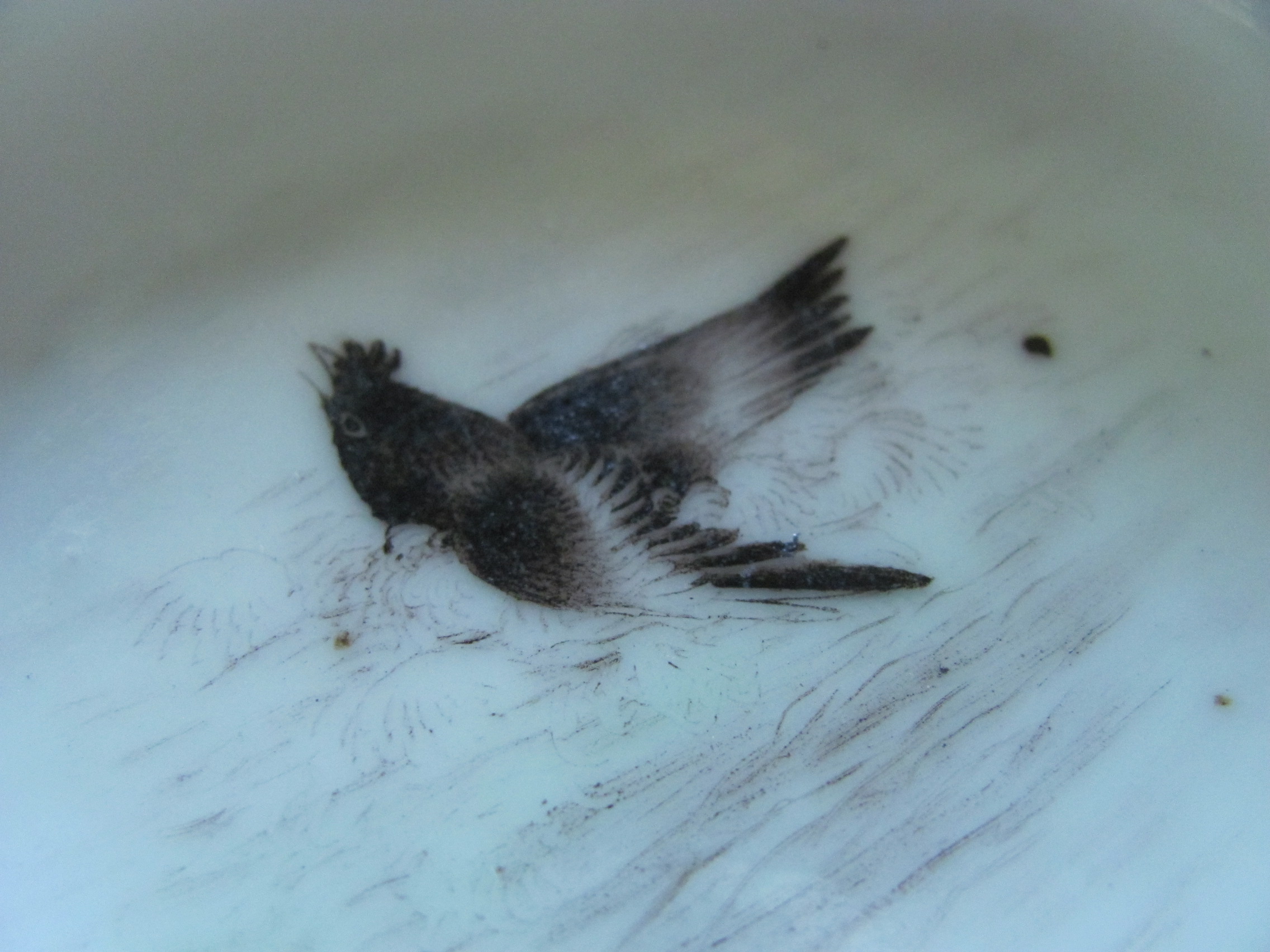 Glossy porcelain brush washer with a shallow circular curved lip and has a double ring base.