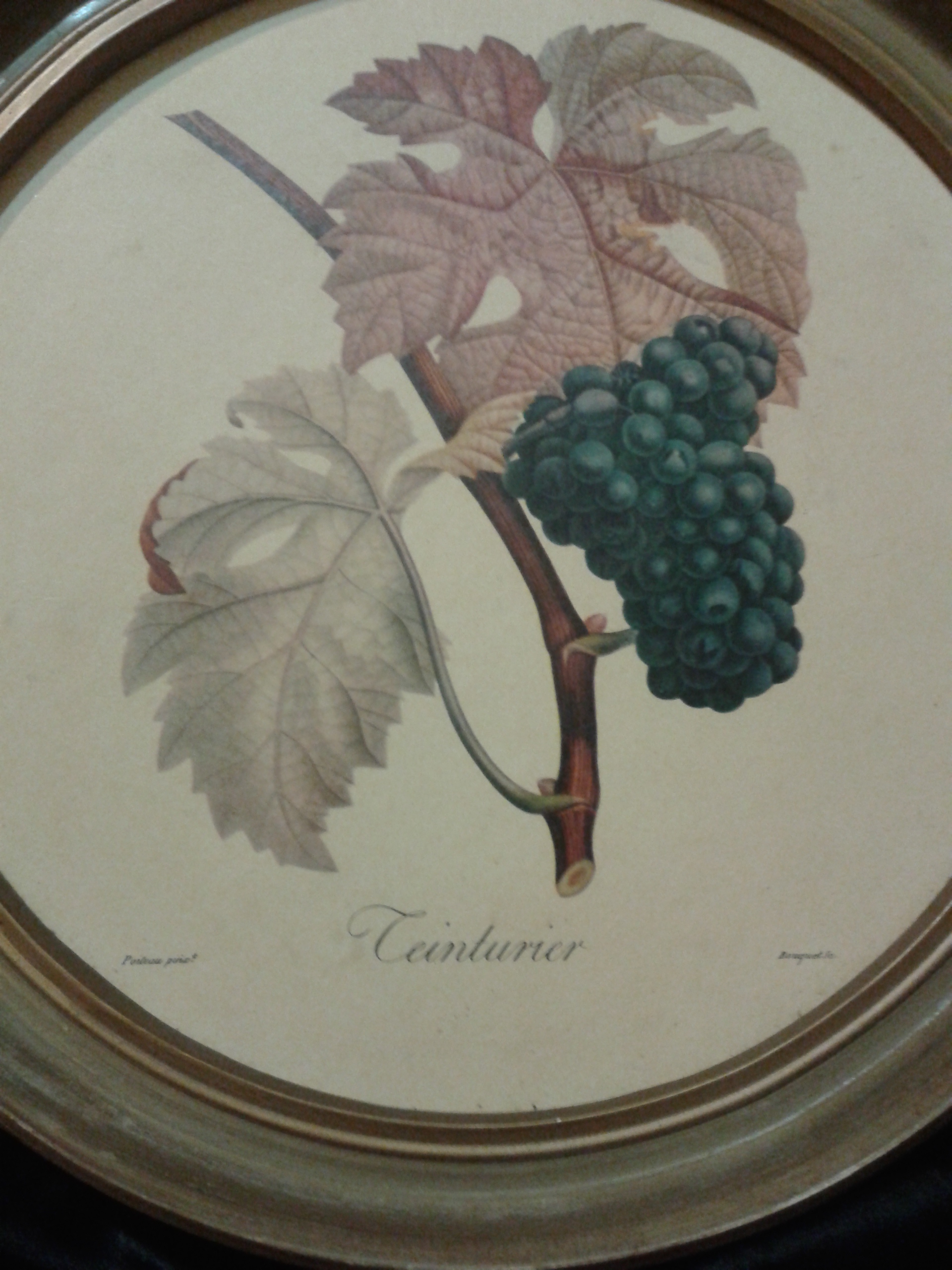 TEINTURE IN CURSSIVE MIDDLE BOTTOM, with Poite pina beside it and Banquet Sc beside the other side of Teinture IT has purple grapes on an old looking branch? in a circle frame with no glass. has paper on back, and rusty kinda brasslooking picture staples