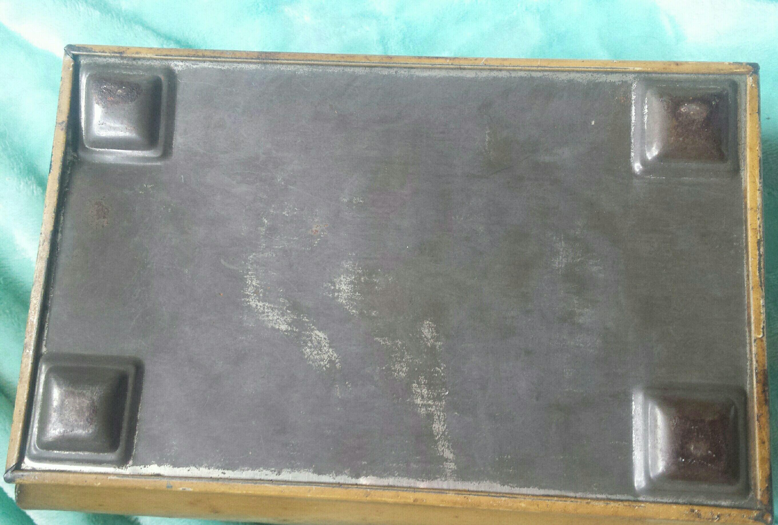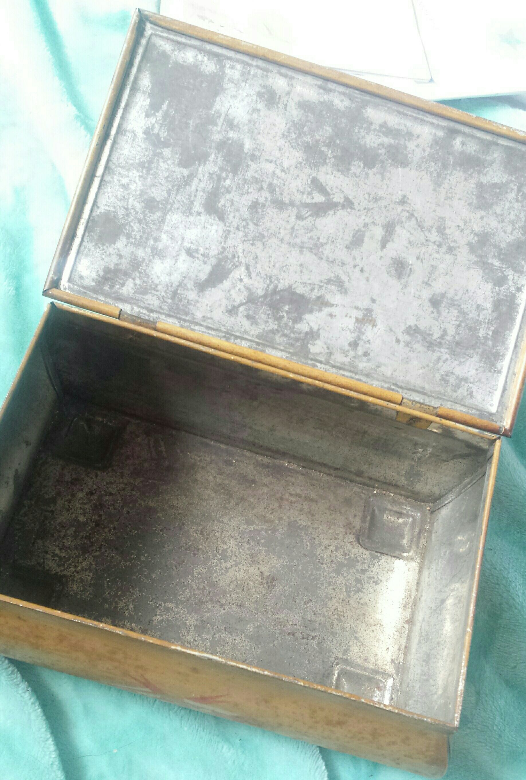 Roughly 14cmx22cm at the top. Quite damaged, rusty and very dented.