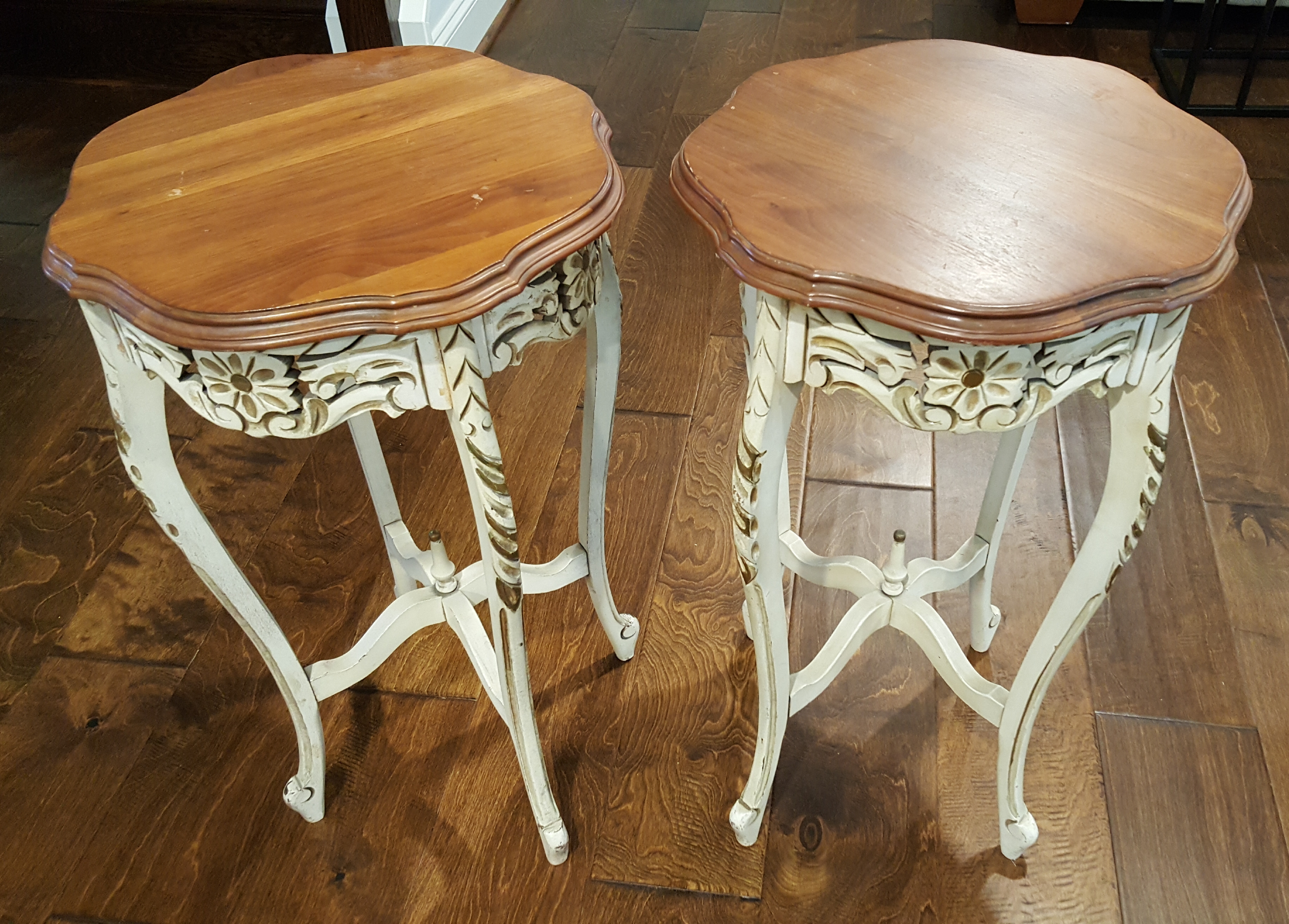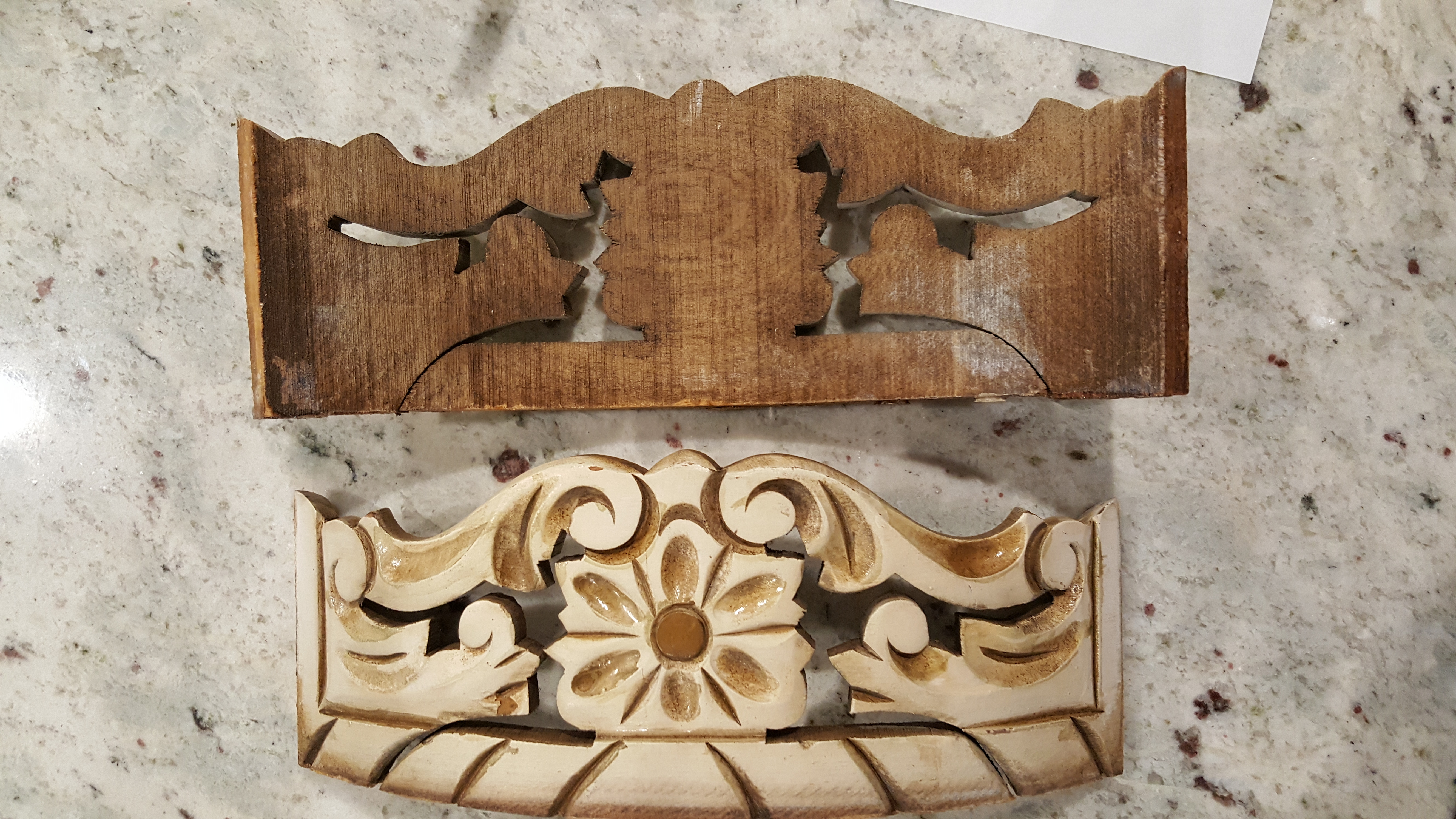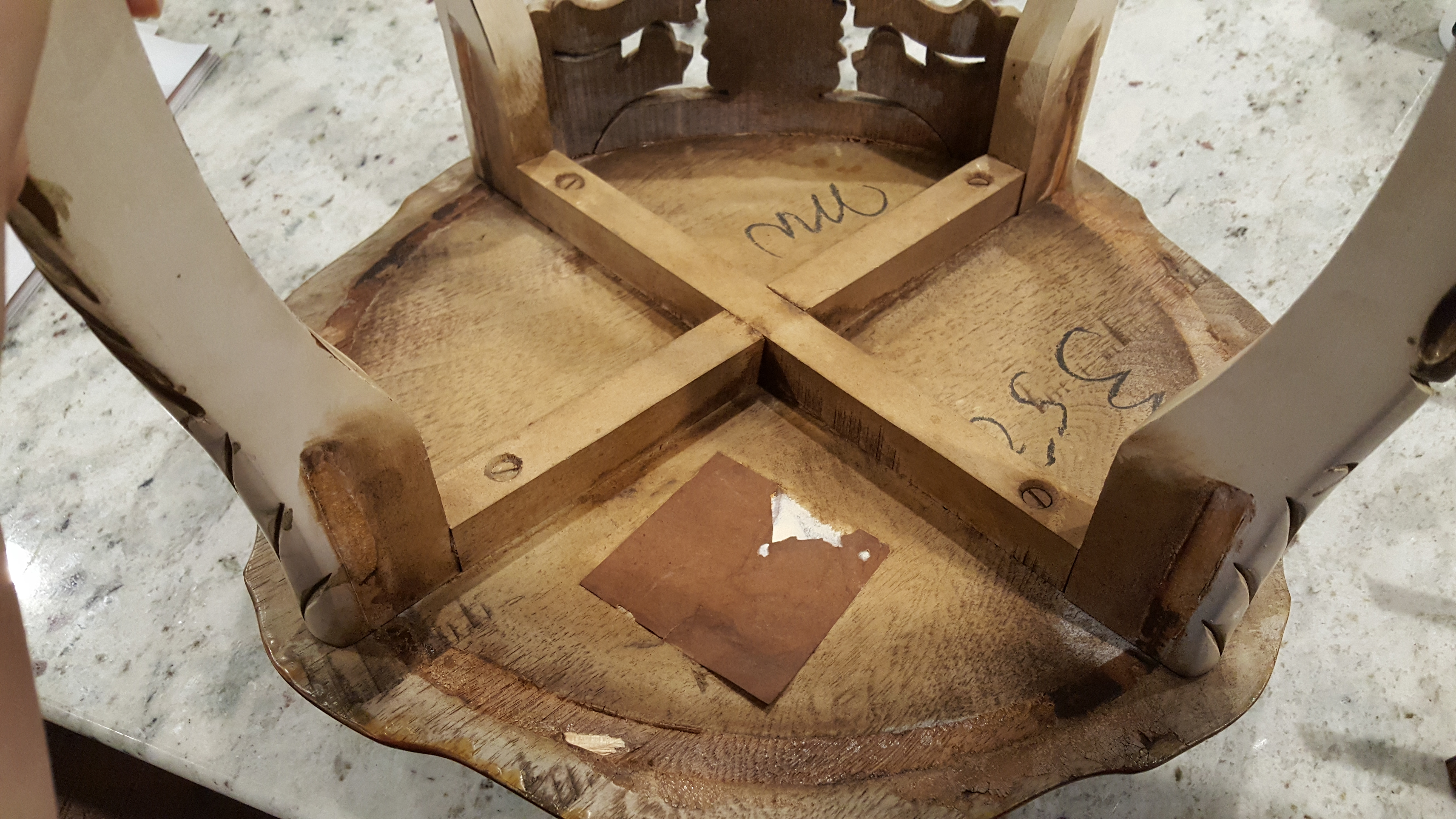 These belonged to my grandmother, she was born in 1911. I got them around 2002. She had them hidden away in her attic since 1990 or earlier. There are no markings on the item to help identify sadly. There is a sticker type tag that is very worn and unreadable. There are flathead screws on the underside. Several of the detailed side pieces have come off, but I have them all. They appear to have been glued on originally.