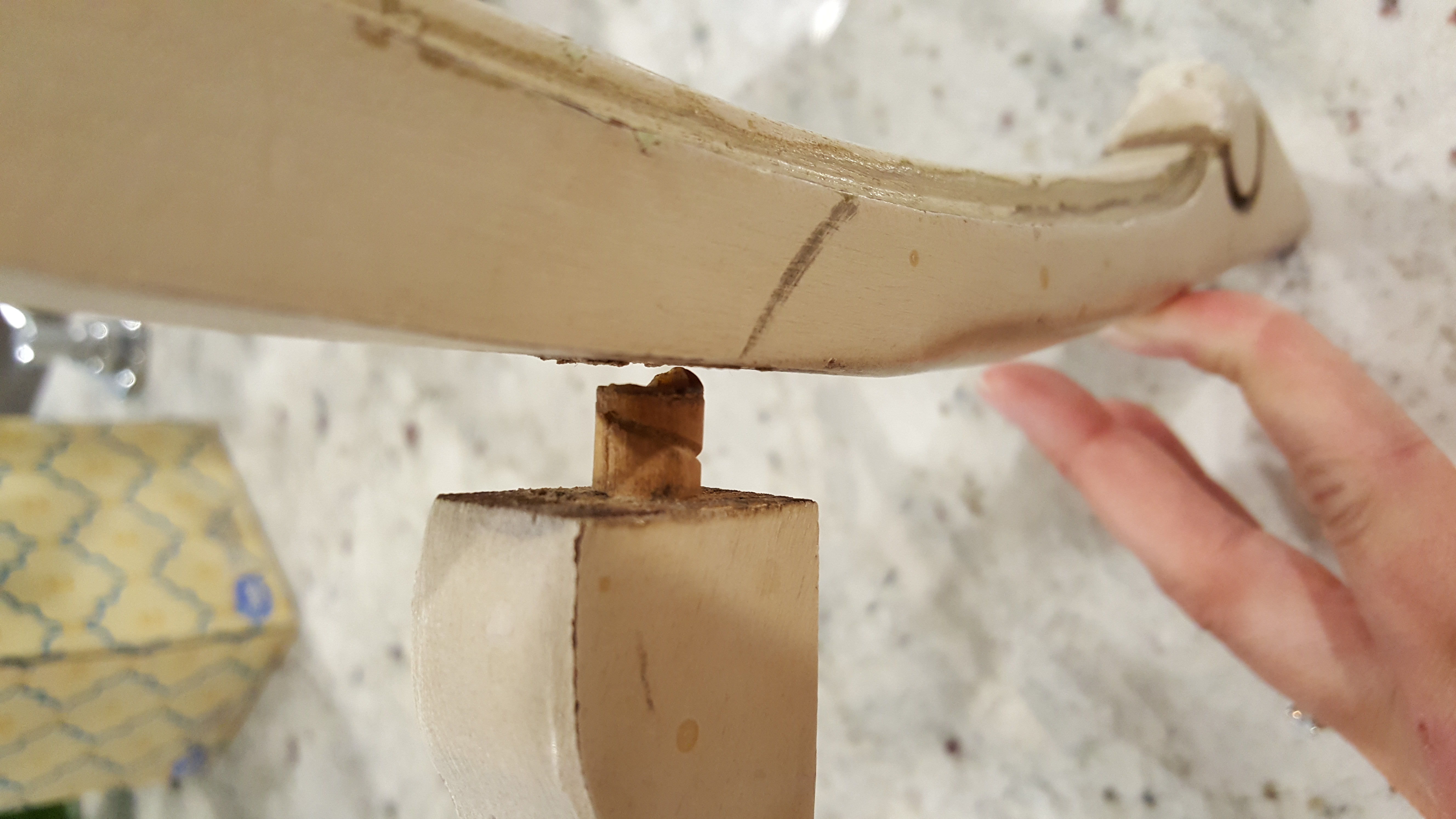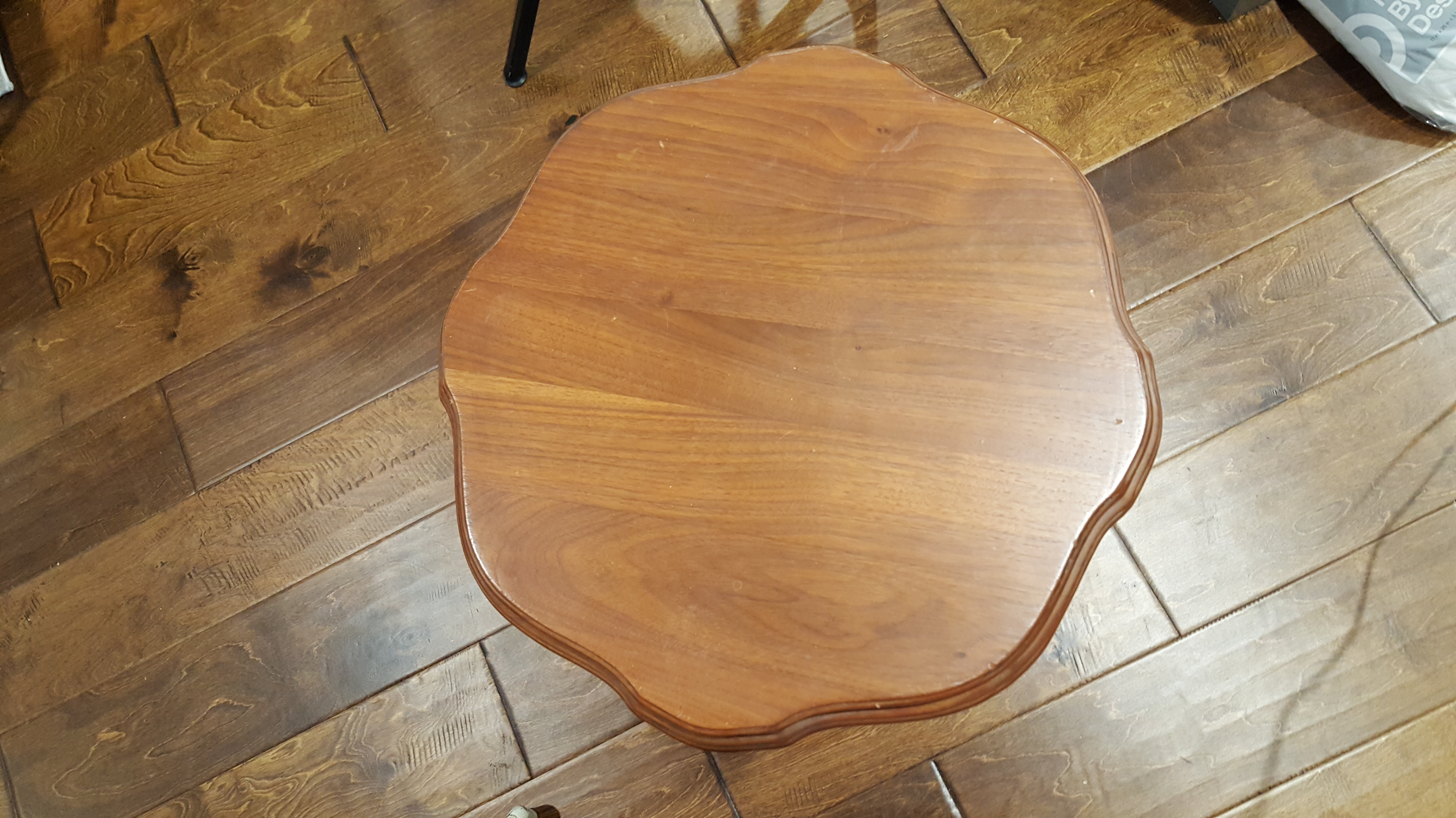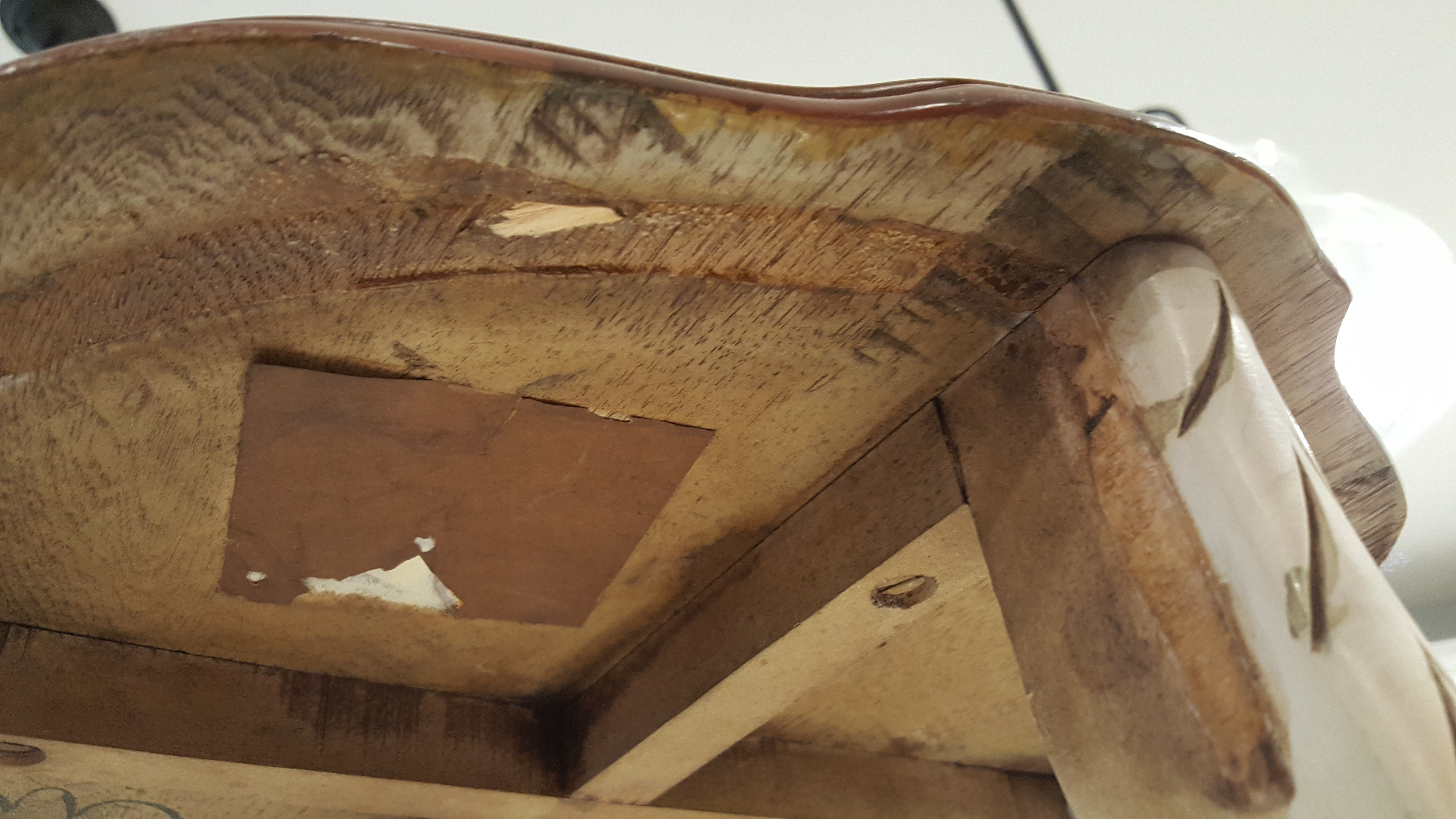 These belonged to my grandmother, she was born in 1911. I got them around 2002. She had them hidden away in her attic since 1990 or earlier. There are no markings on the item to help identify sadly. There is a sticker type tag that is very worn and unreadable. There are flathead screws on the underside. Several of the detailed side pieces have come off, but I have them all. They appear to have been glued on originally.