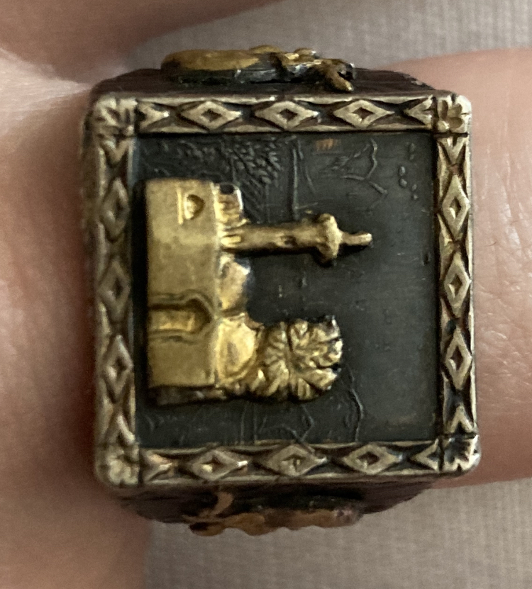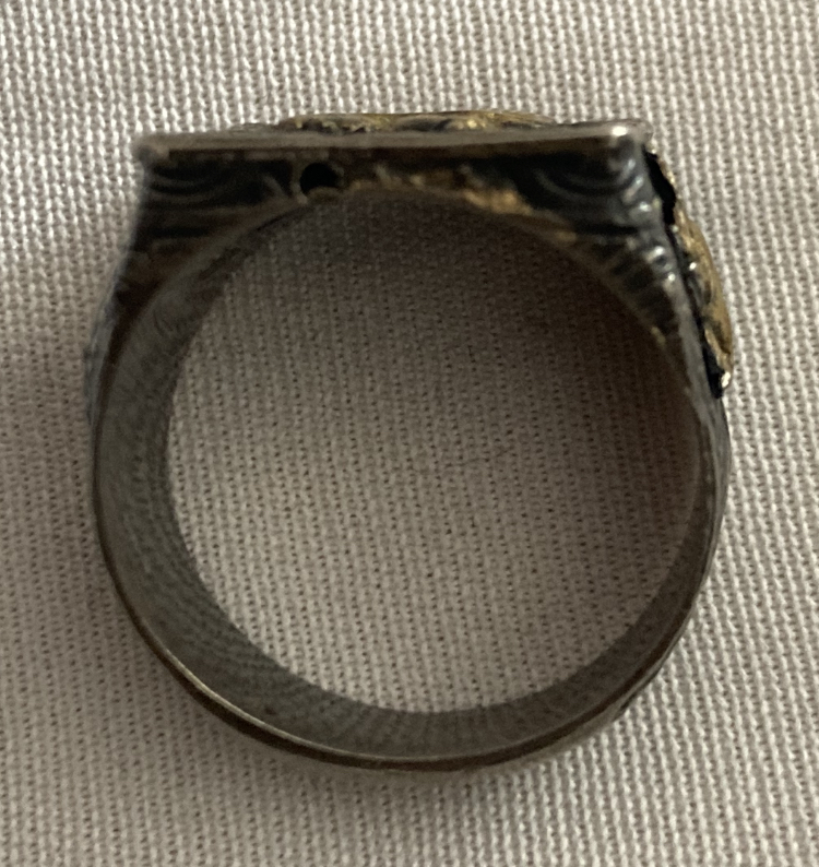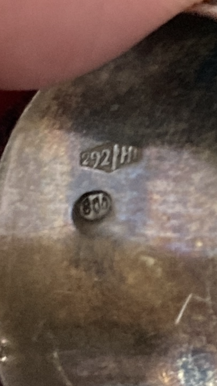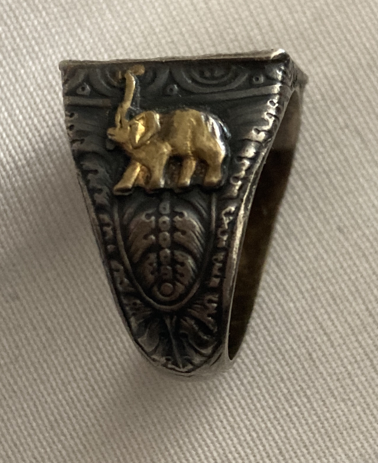 I have no idea where is the ring from. Judging by the number (800) on it, it’s made mostly of silver. I still haven’t figured out what does the 292 H or M mean. The front of the ring looks like some building with a palm in the back. On both sides there’s an animal (i think it might be an elephant).
