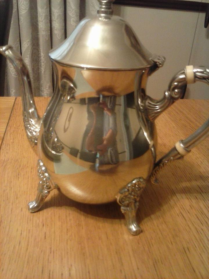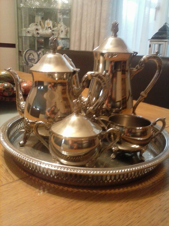 This set has 4 pieces , all matching. The handles of both pots have some sort of inlay (maybe bone). The tray probably doesnt match and may be exluded.