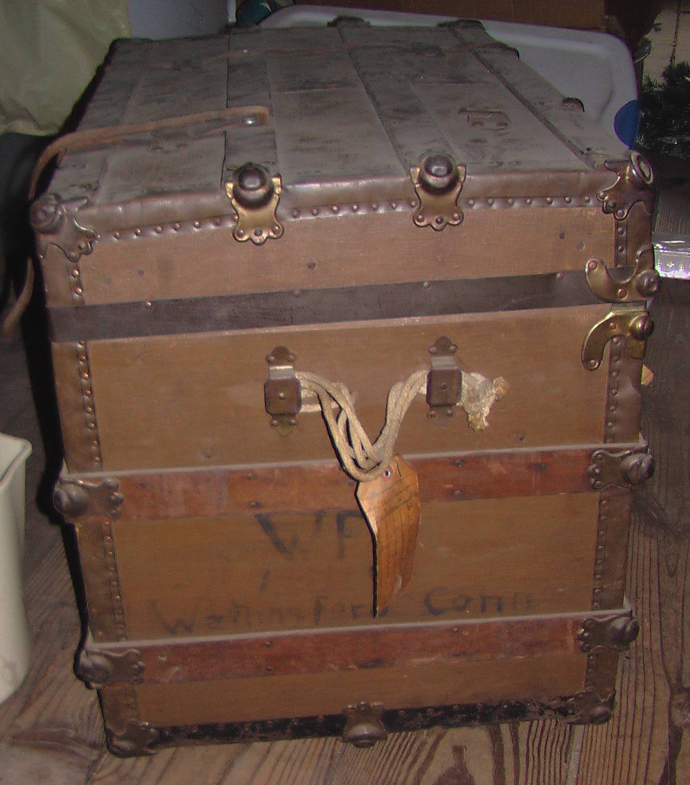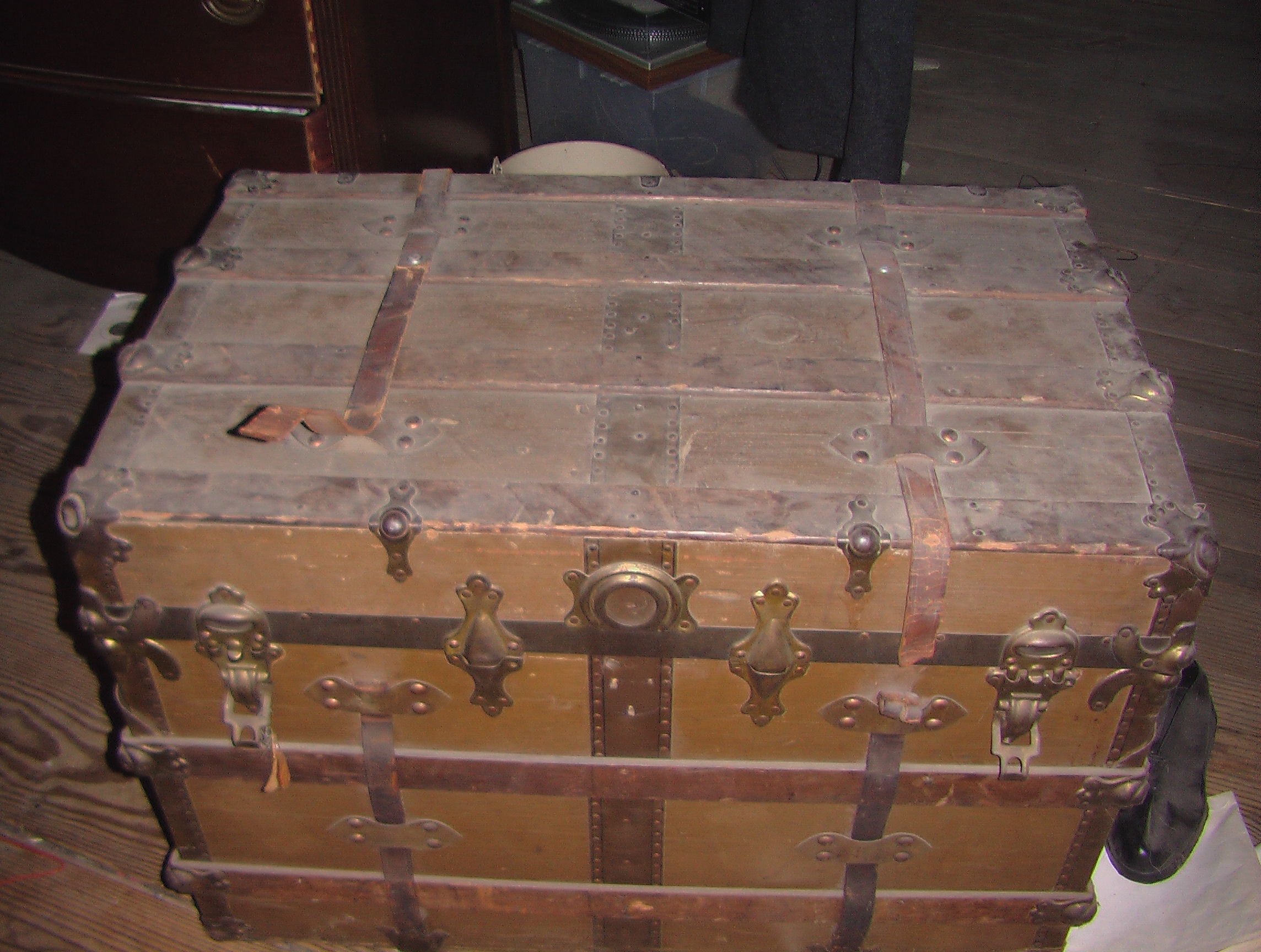 old trunk with partialy dry rotted leather straps othewise looks to be in very good condition with none  of the metal parts missing, hinges are good bottom sides and top are solid