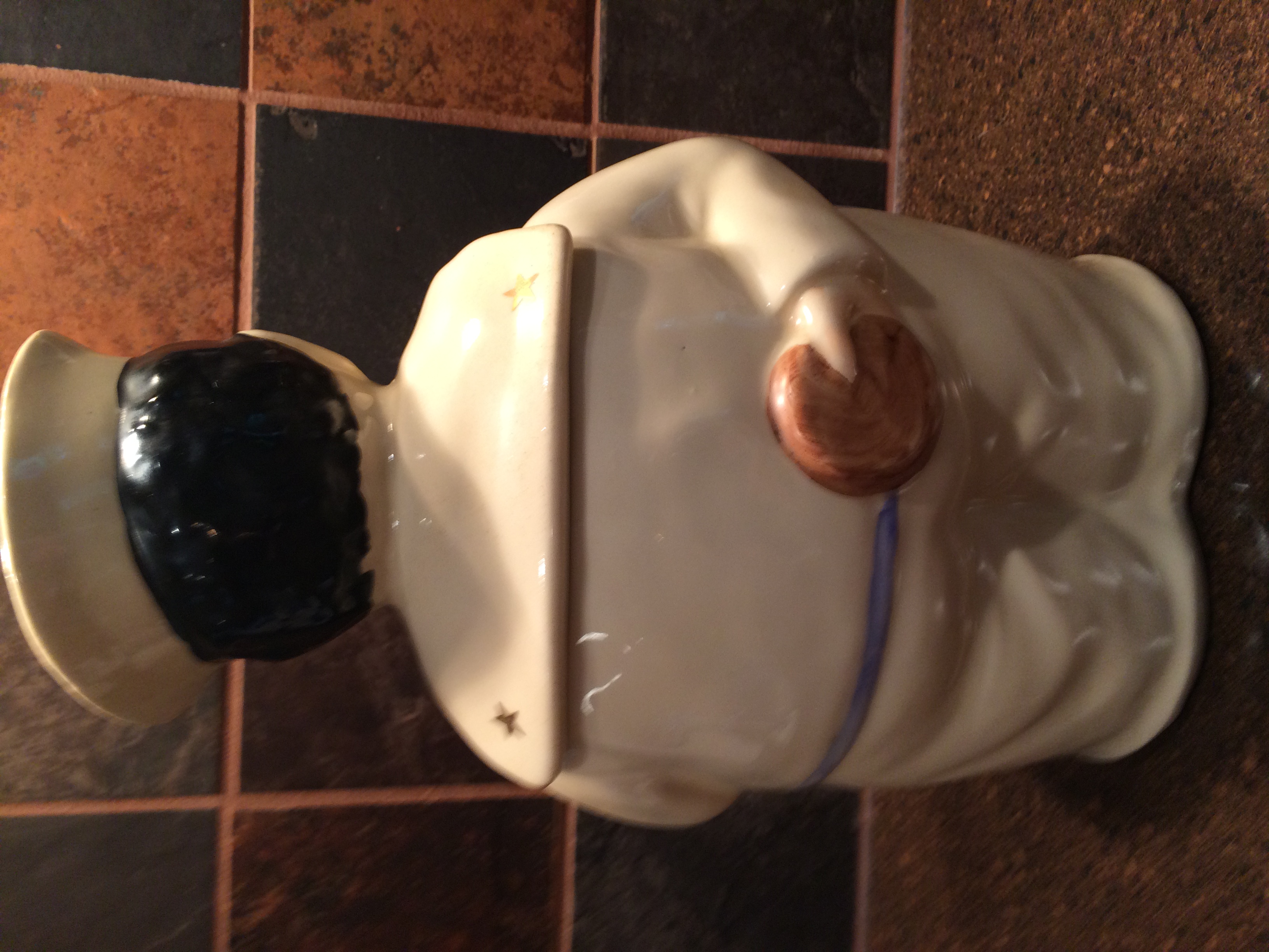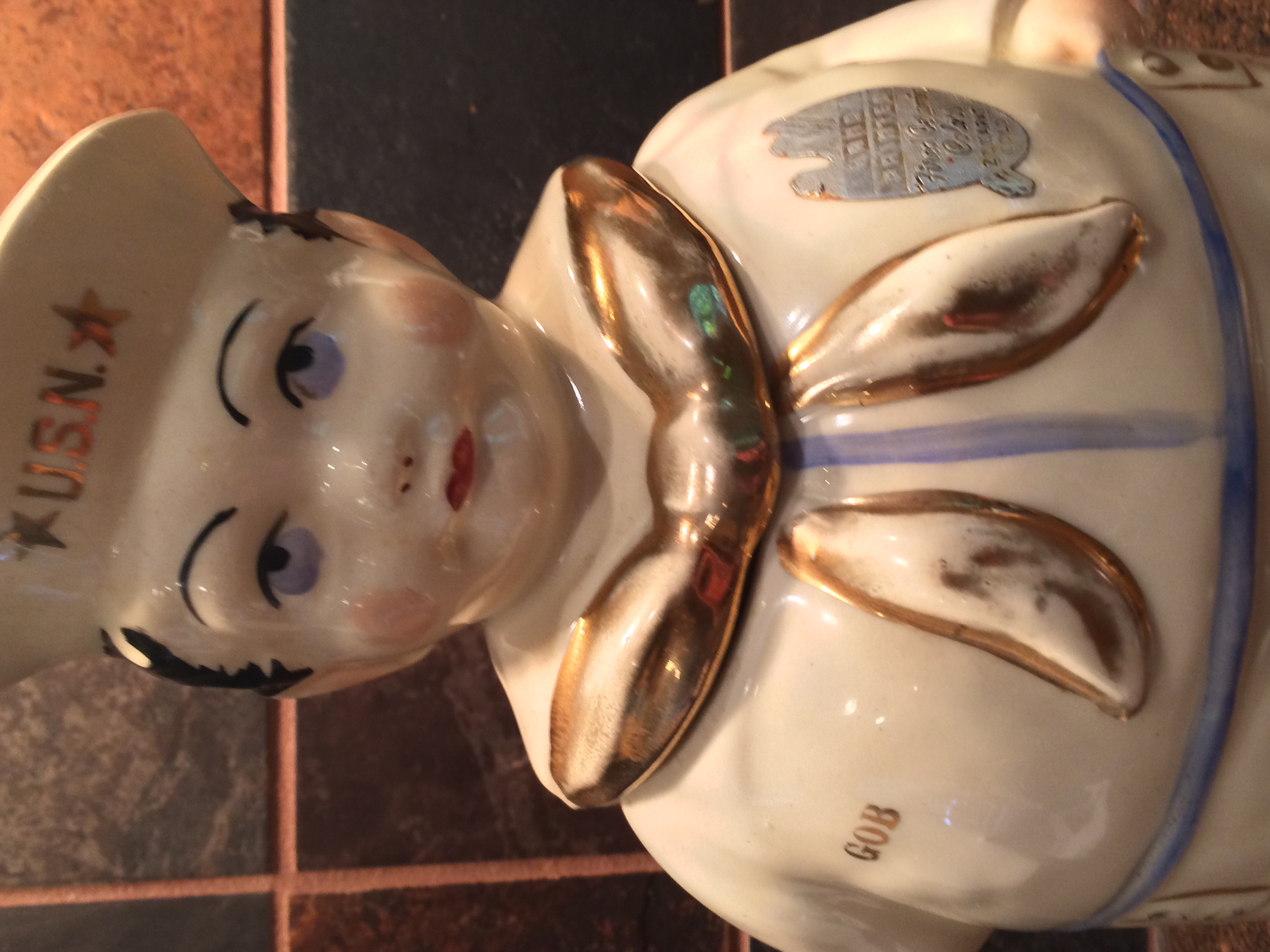 I was able to obtain some information regarding this cookie jar by searching in google "gob cookie jar". However, I have yet to find the exact same item. What appears to make my item unique from the others, is that has some type of "stamping plate" and/or painted seal to the right side of the sailor's scarf as observed within one of the four attached pictures.
