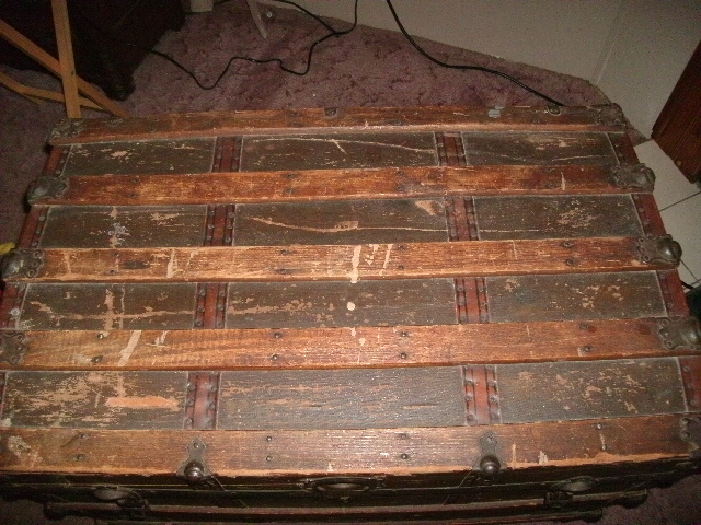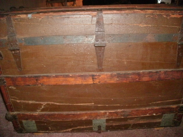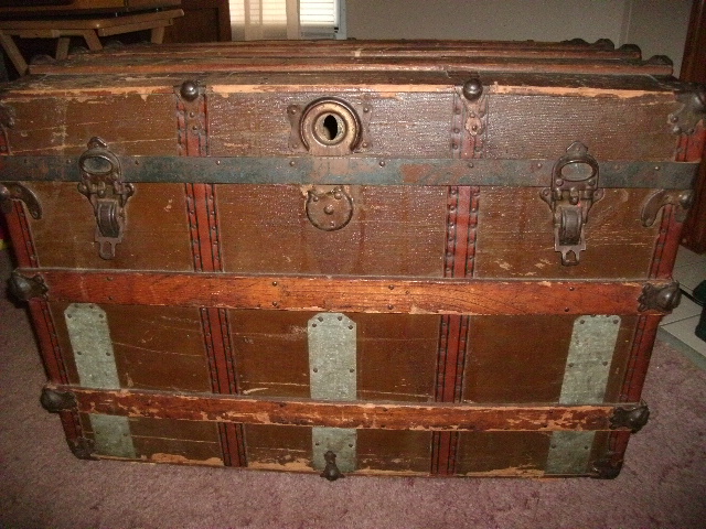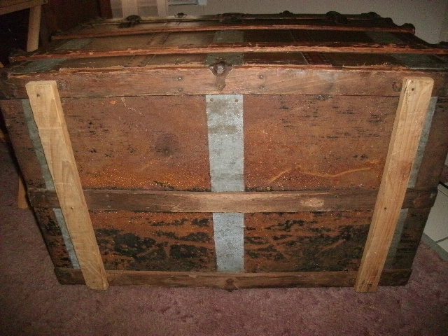 Old wood trunk with metal straps on bottom and 2/3 up front and back.
