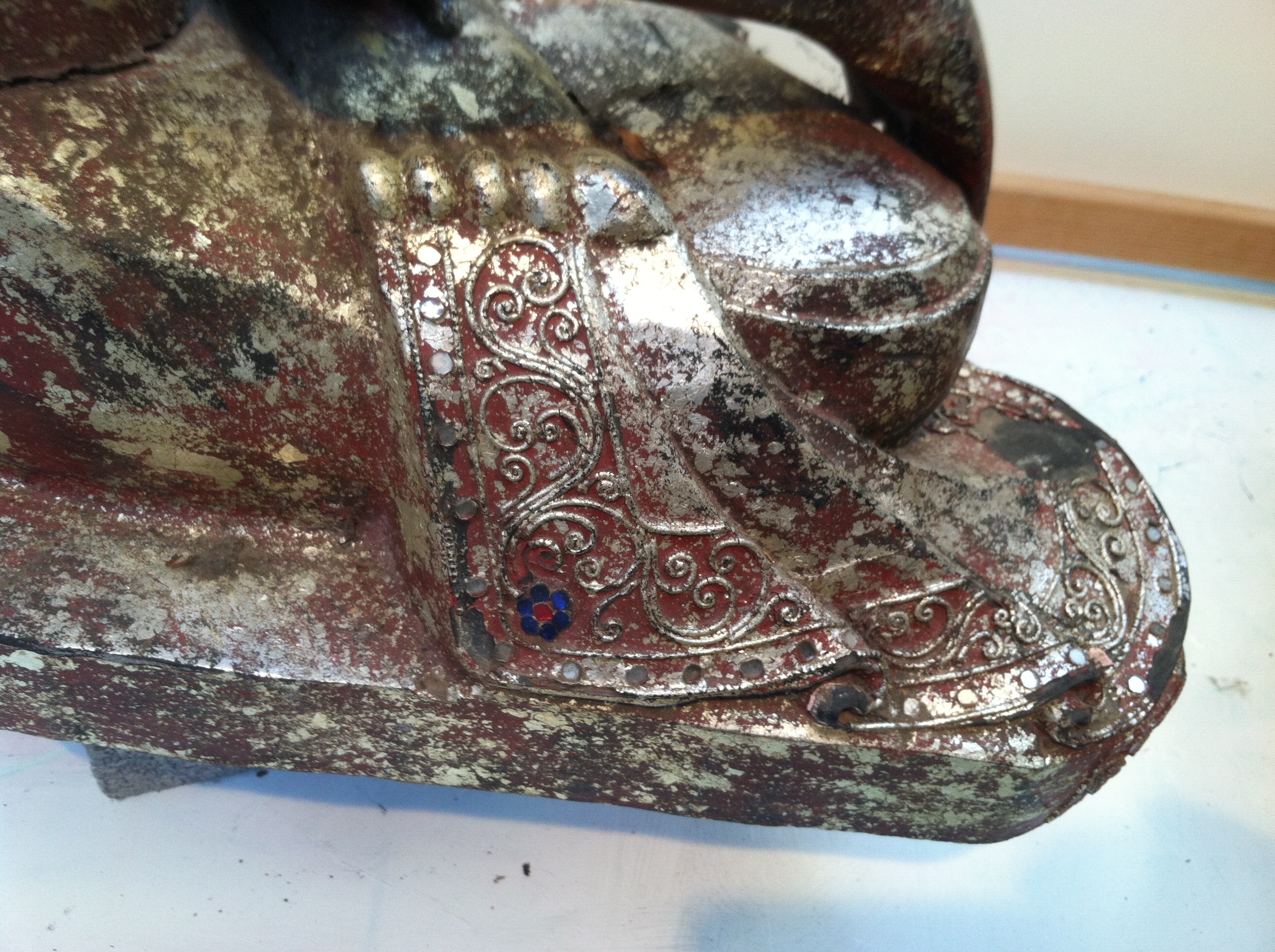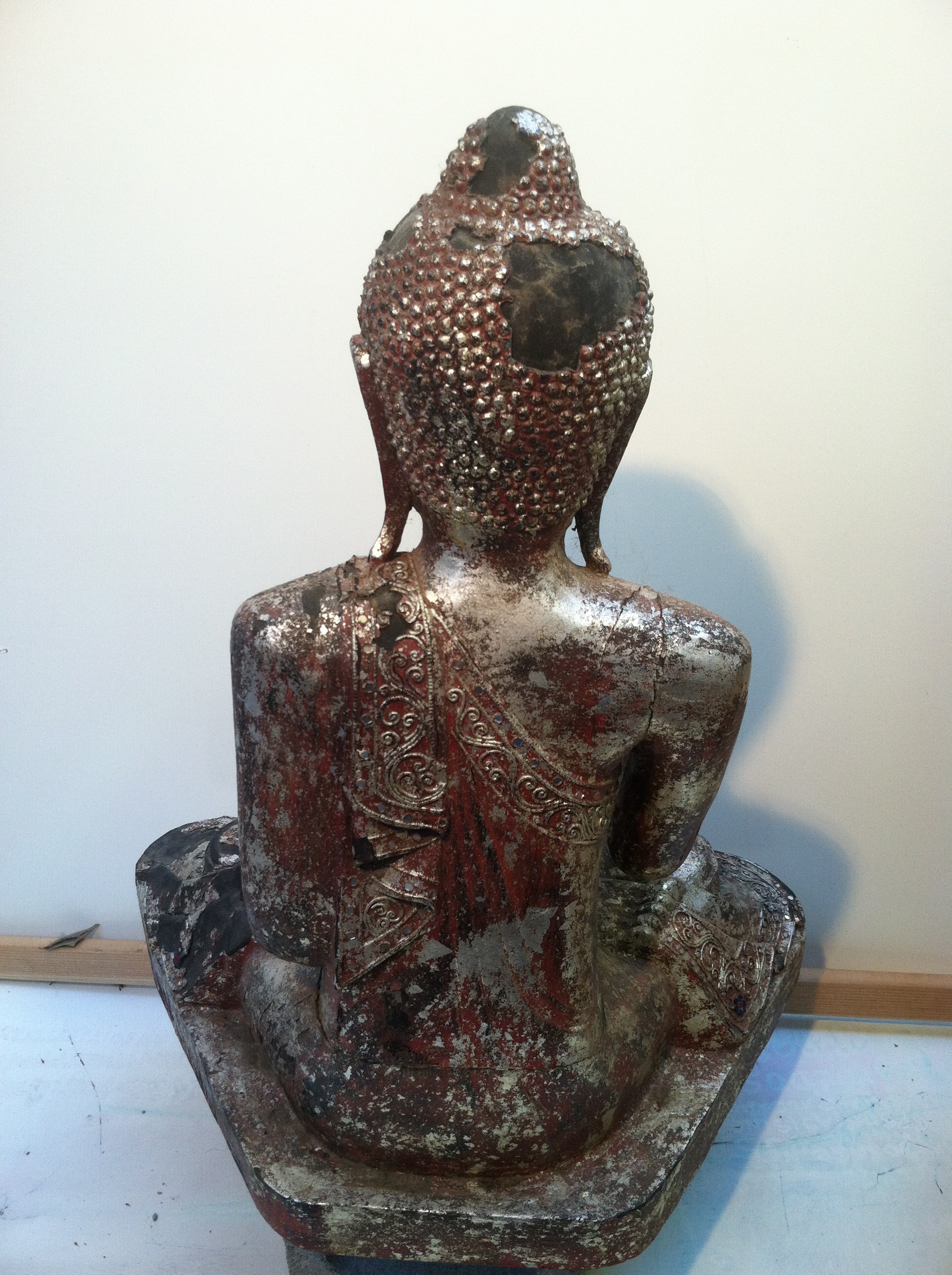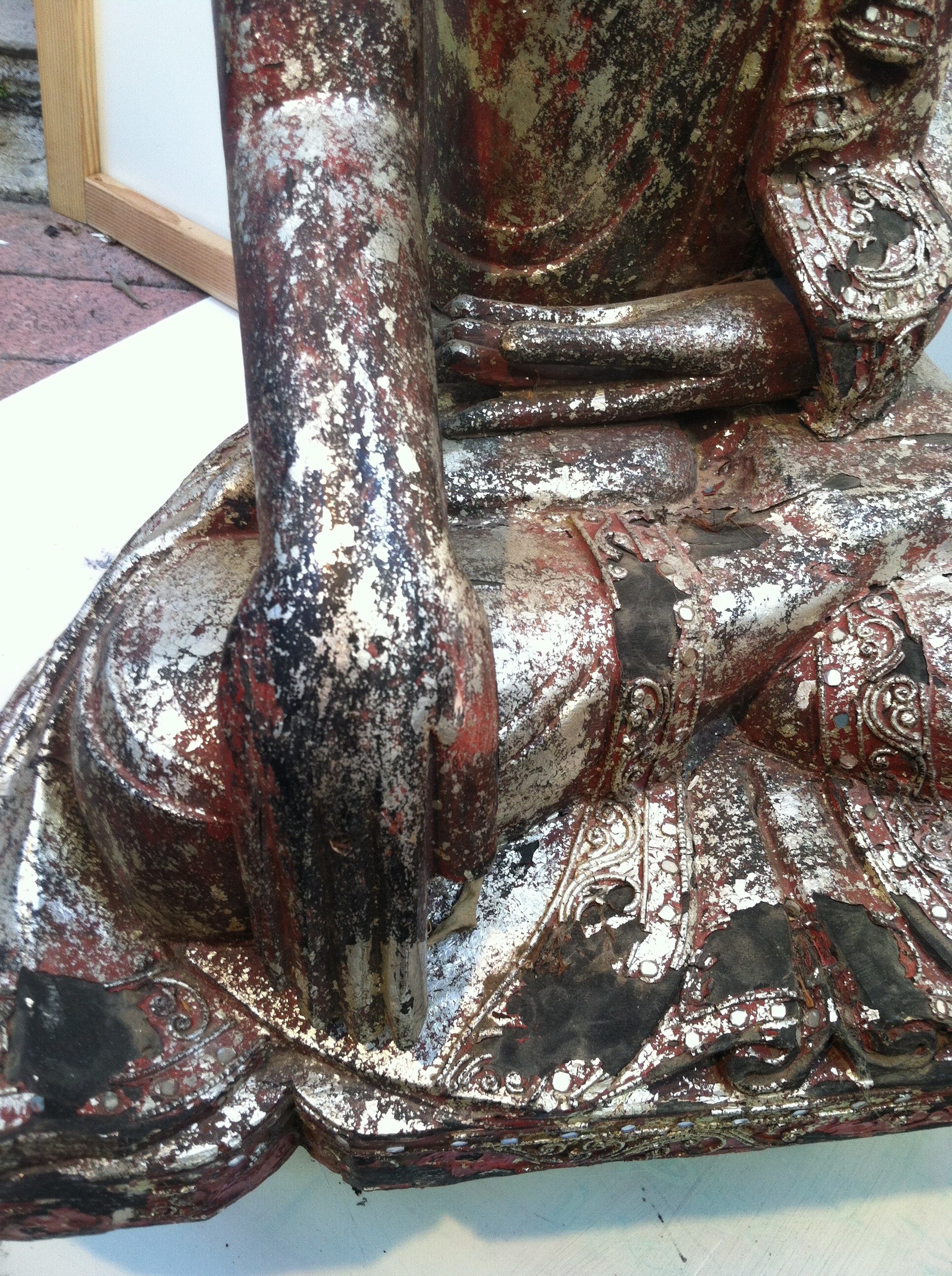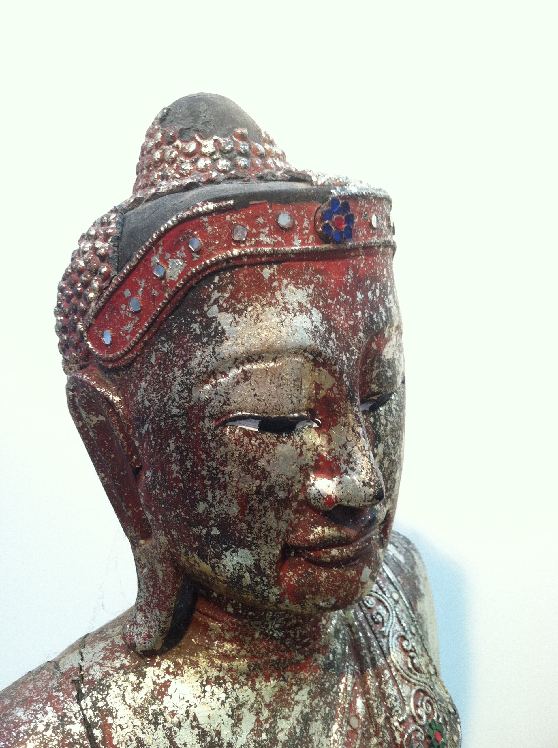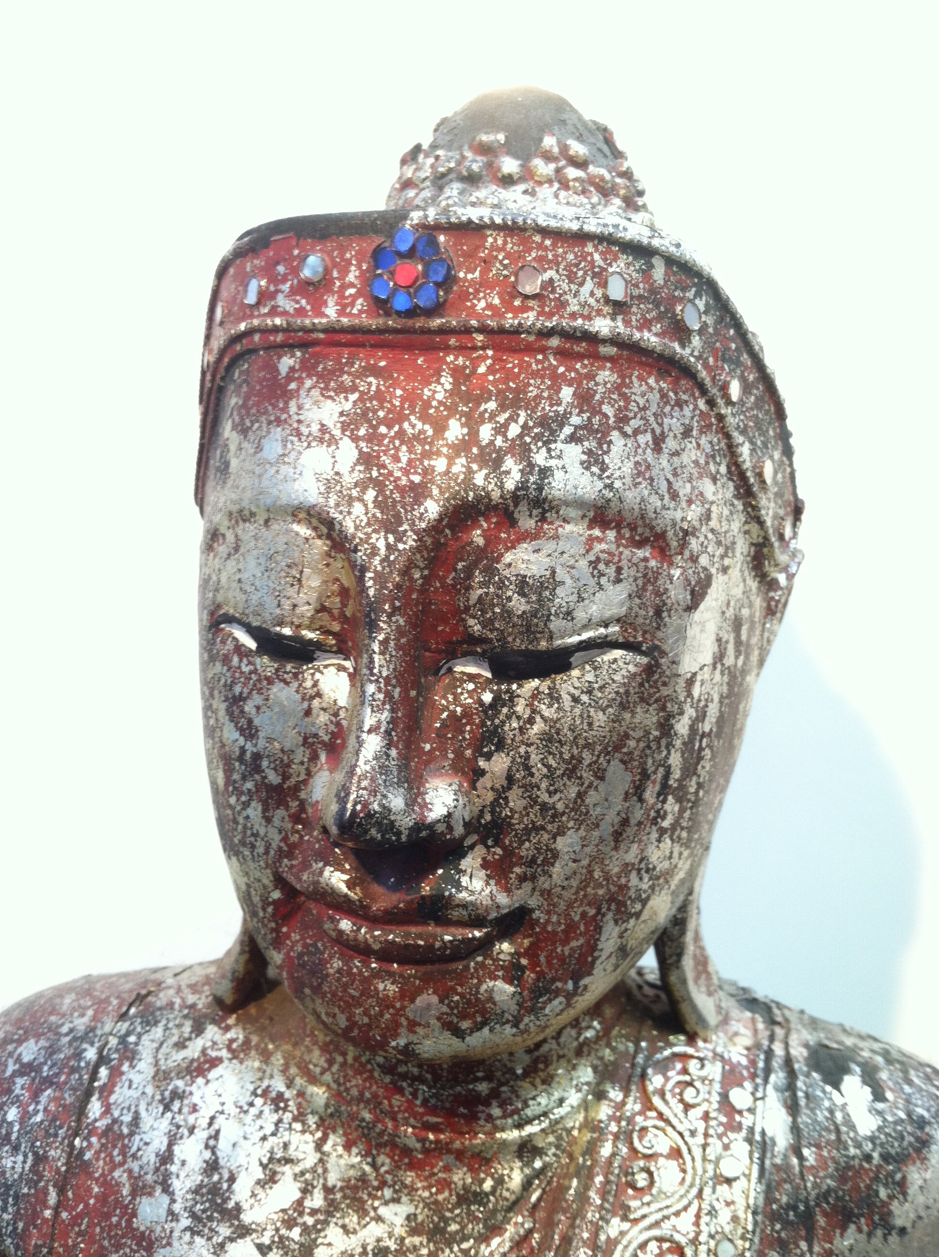 Wooden Sitting Buddha Statue, possibly of Burmese or Thai origin, heavily withered, about 25 inches tall, painted wood and gold paint as well as decorated
