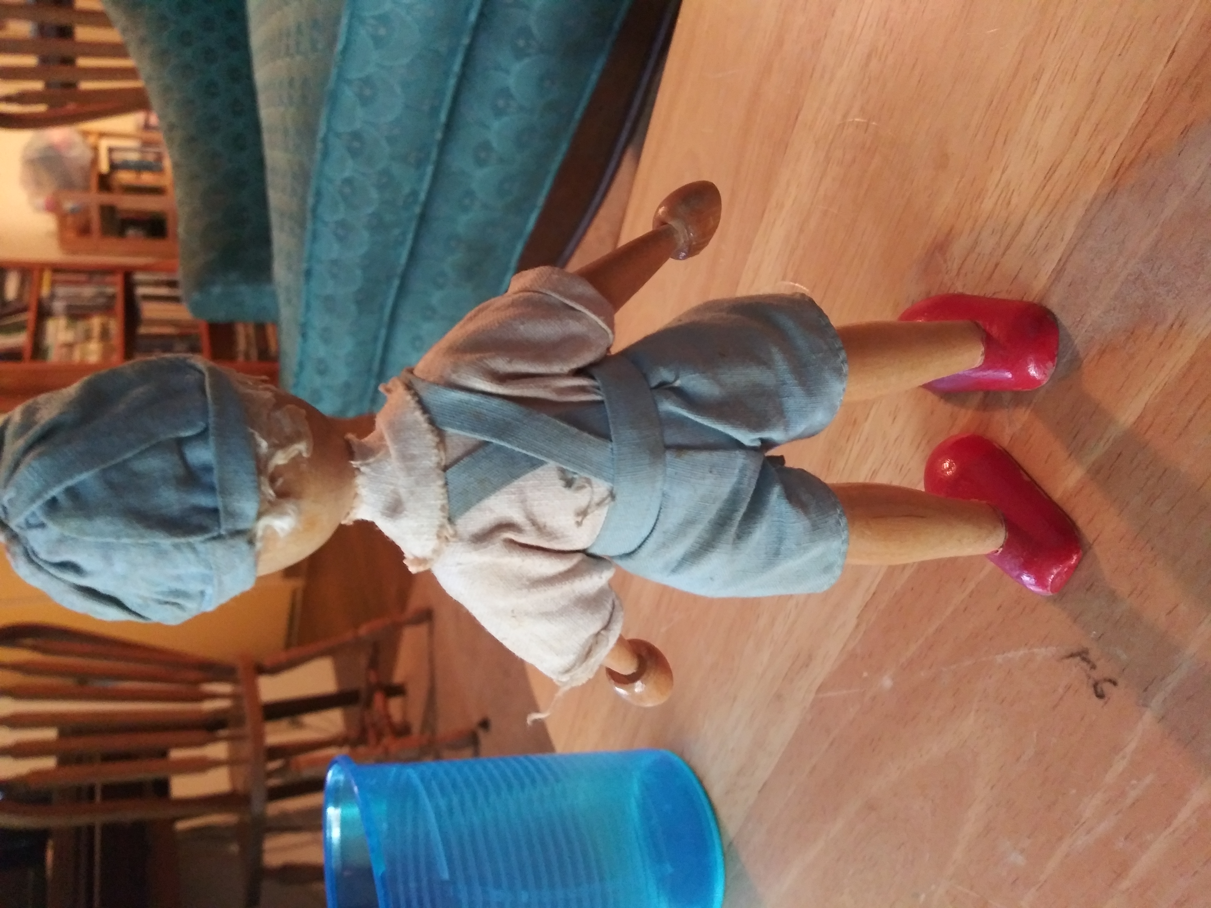 this doll is about 7in tall made of wood has moveable limbs painted on face with outfit that appears to be made from fabric hand sewn together not much i know about these things so need help