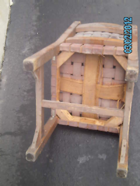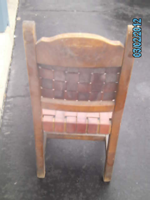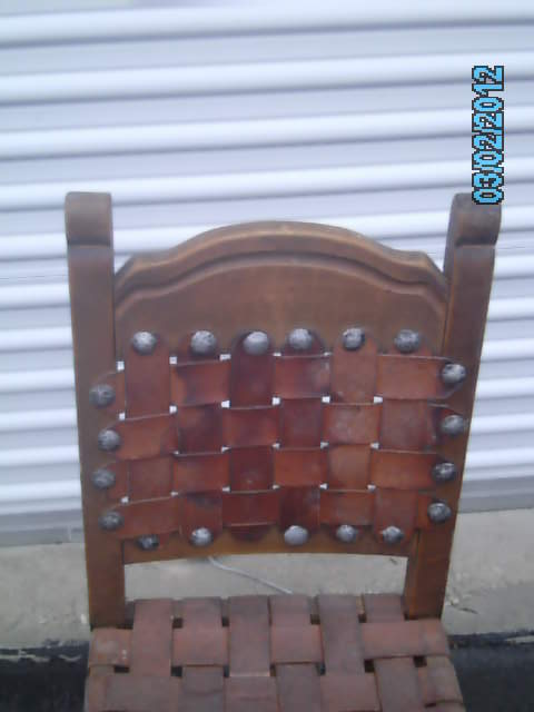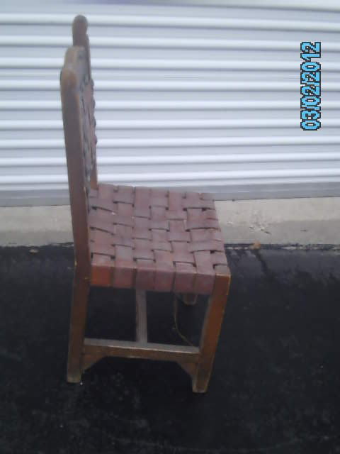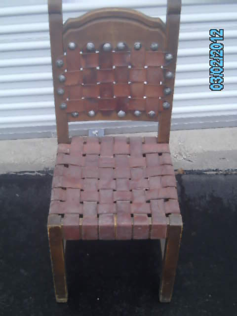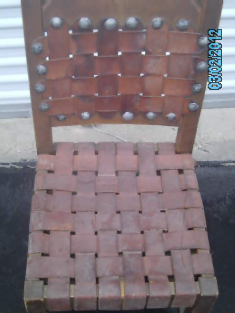 I aquired these chairs from the attic of an old German bar/resturant that has been around for over 50 years. I have 12 of these chairs in my possession. Chairs do have damage. Some are wobbly. Some have broken/torn leather laces. Some are mising steel rivits. Chairs are solid without any major cracks or damage. Chairs are made of wood (type unknow), leather laced and have steel rivets. Chairs could use a good cleaning but would make an excellent addtition to any room of this period. I have no idea when, where or who made these chairs and would like any information possible along with possible appraisal. Chairs are for sale...