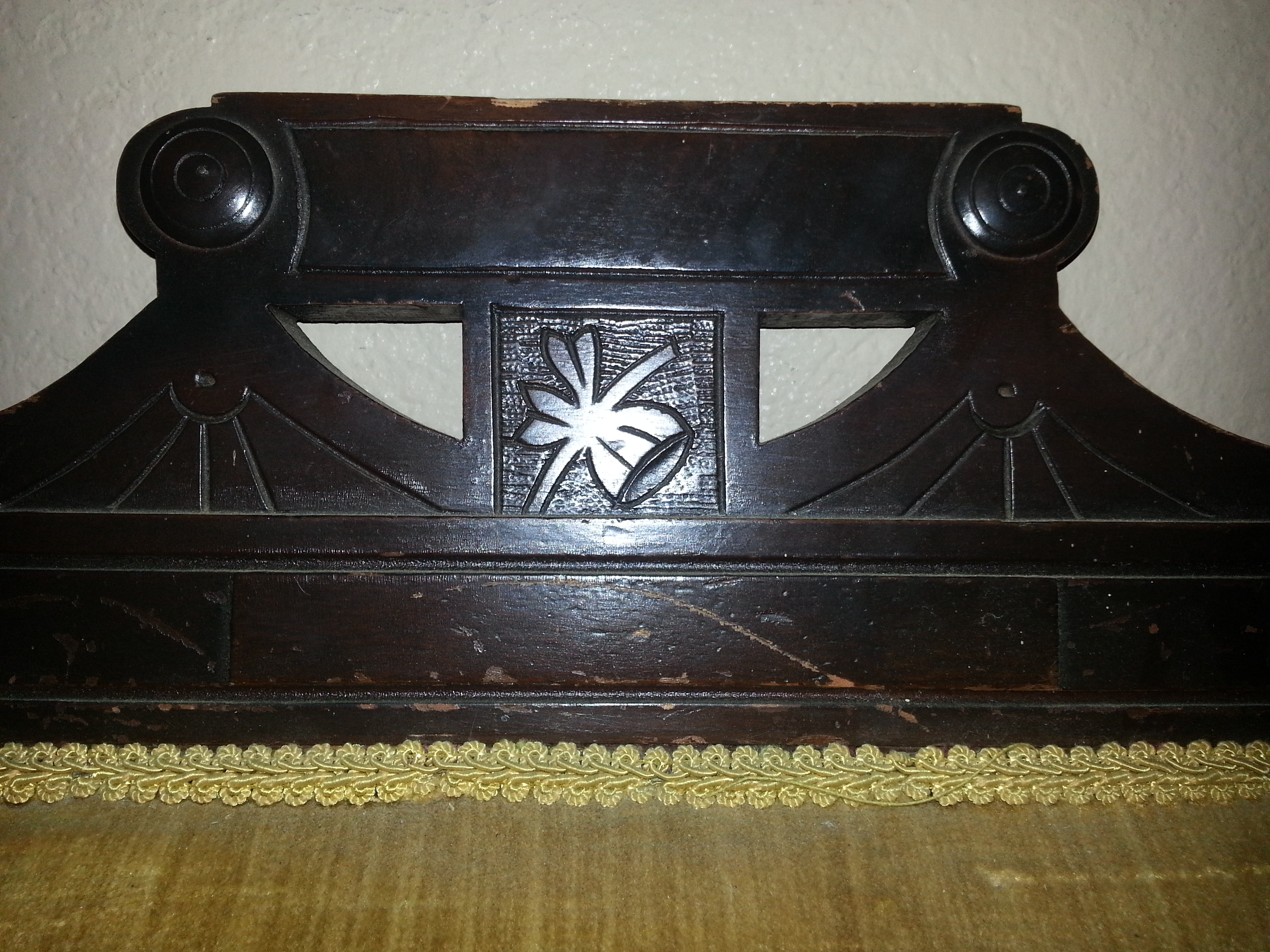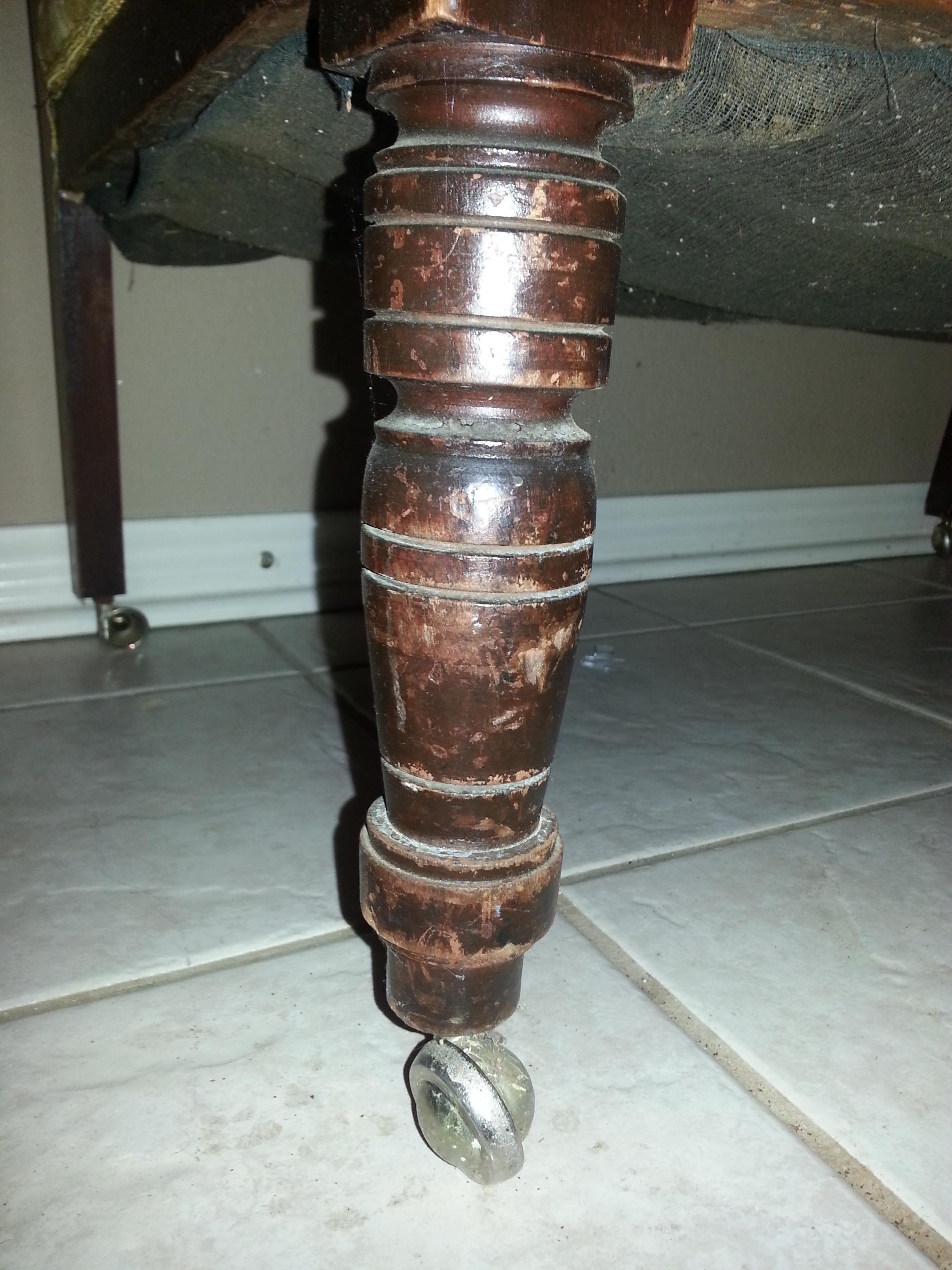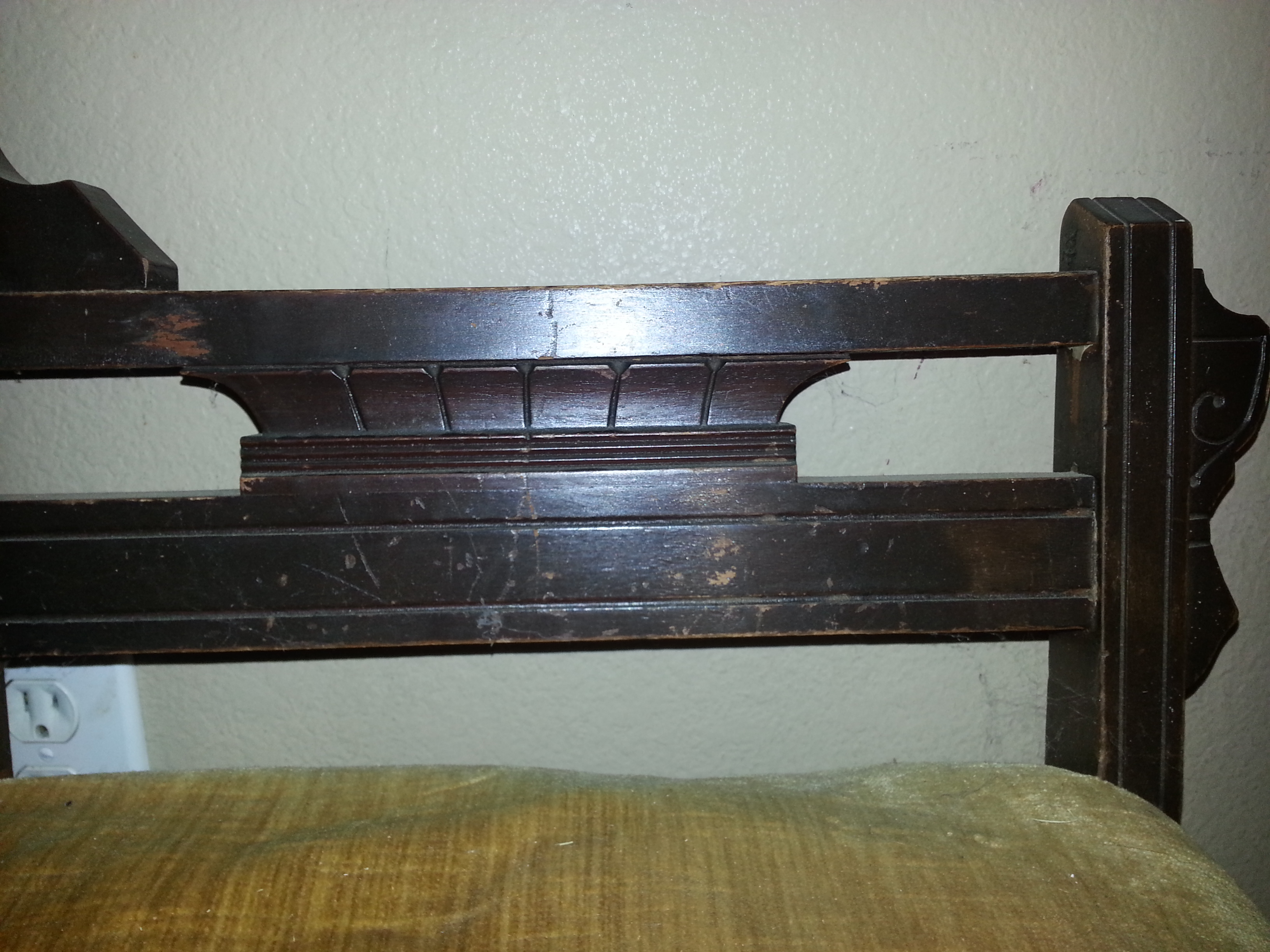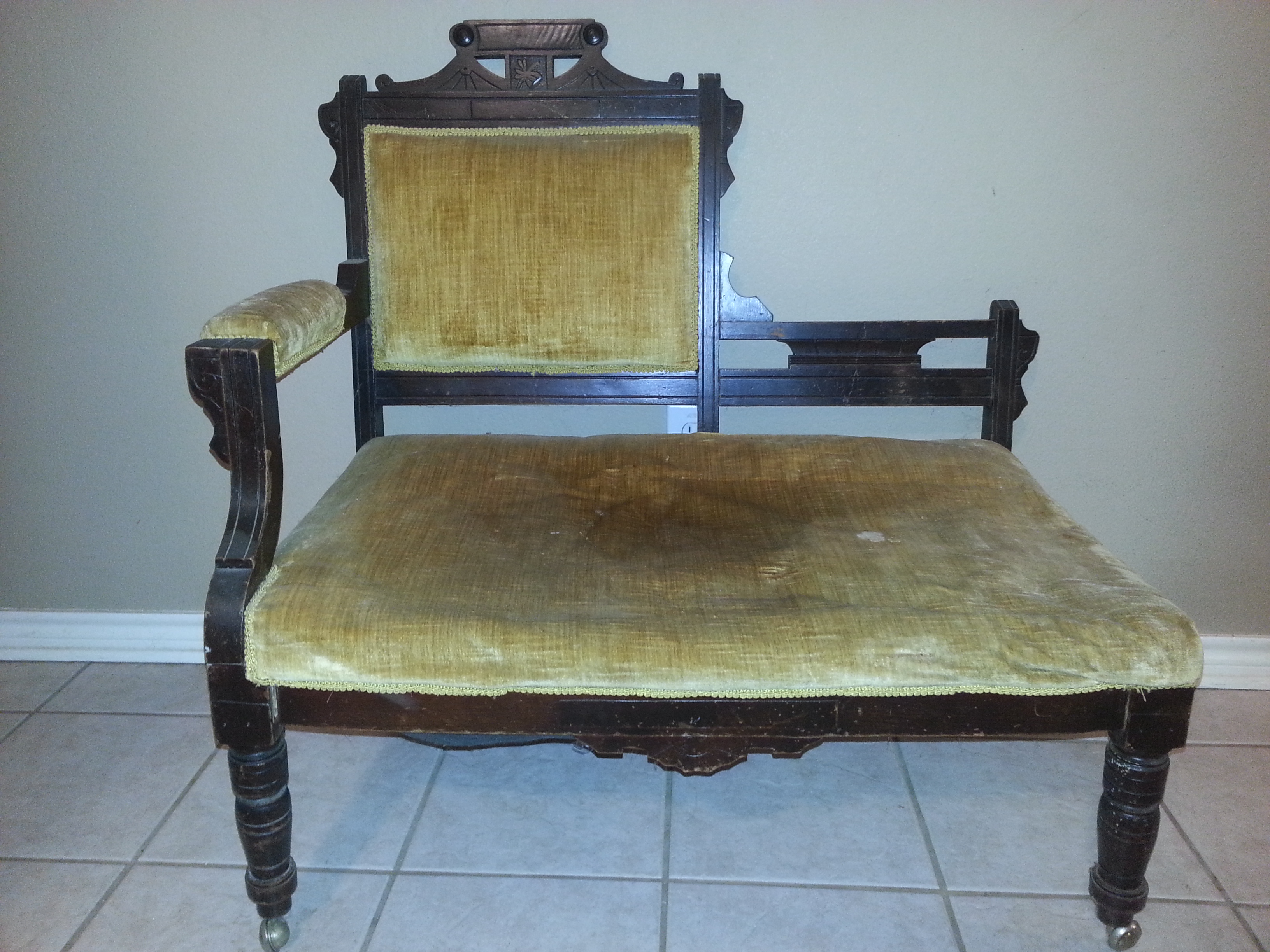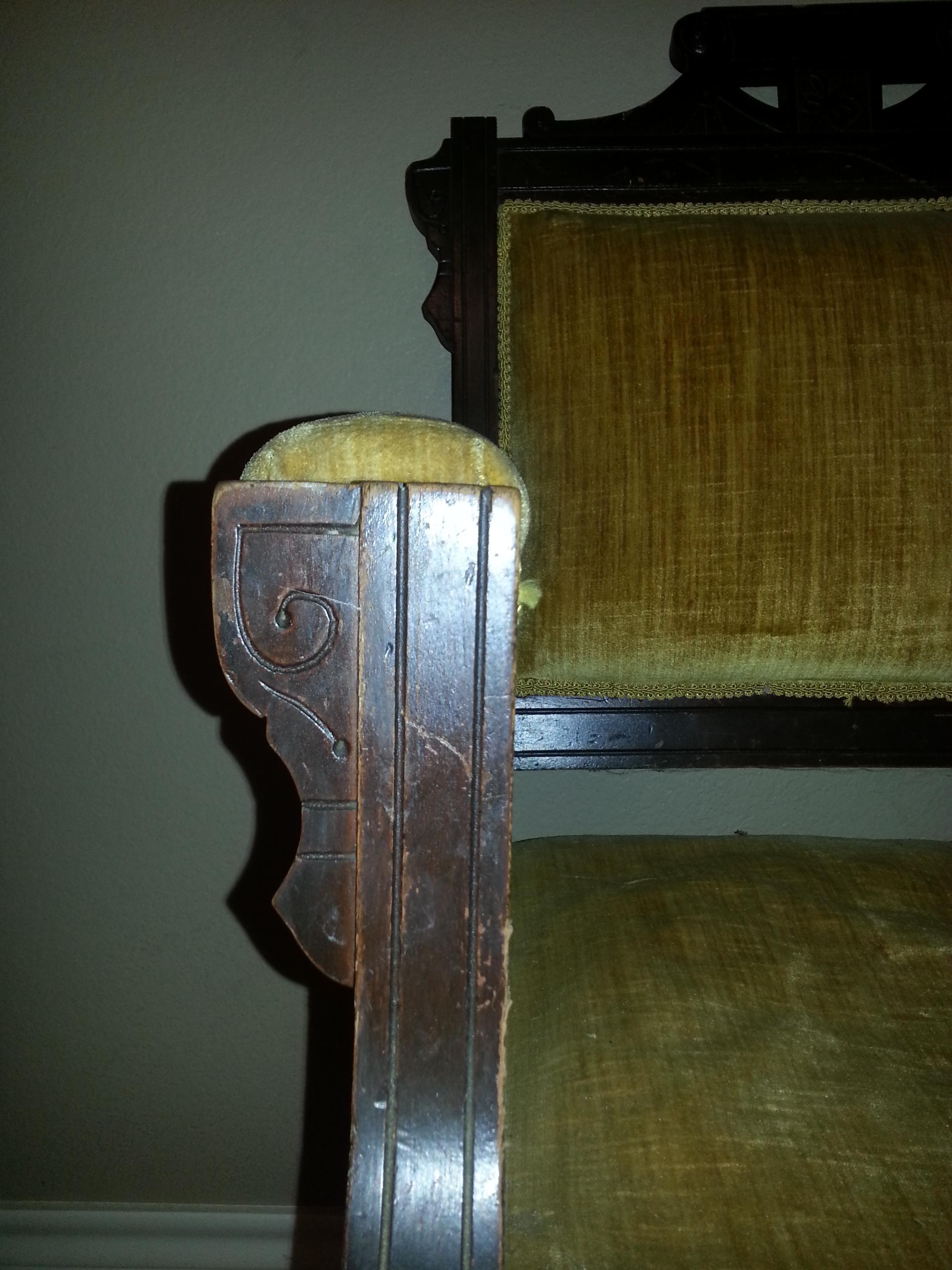 I believe this is a one-armed ladies chair in the Eastlake style (1870-1885) however I'm no expert and am looking for confirmation or correct information. The seat cushion sounds and feels like it is stuffed with some sort of grass and maybe a cotton stuffing. Wheels look like they may have been replaced with newer wheels. The upholstery (gold velvet) appears to have been put right over the original upholstery (red velvet?) I peeked under an edge but do not want to pull off all current upholstery. The back cushion and arm cushion are very firm but the seat is quite "flat" and makes a crunching sound when pressed (from whatever stuffing is inside (which looks like a dried up grass or moss of some kind ? very brittle and almost brillo pad-like)