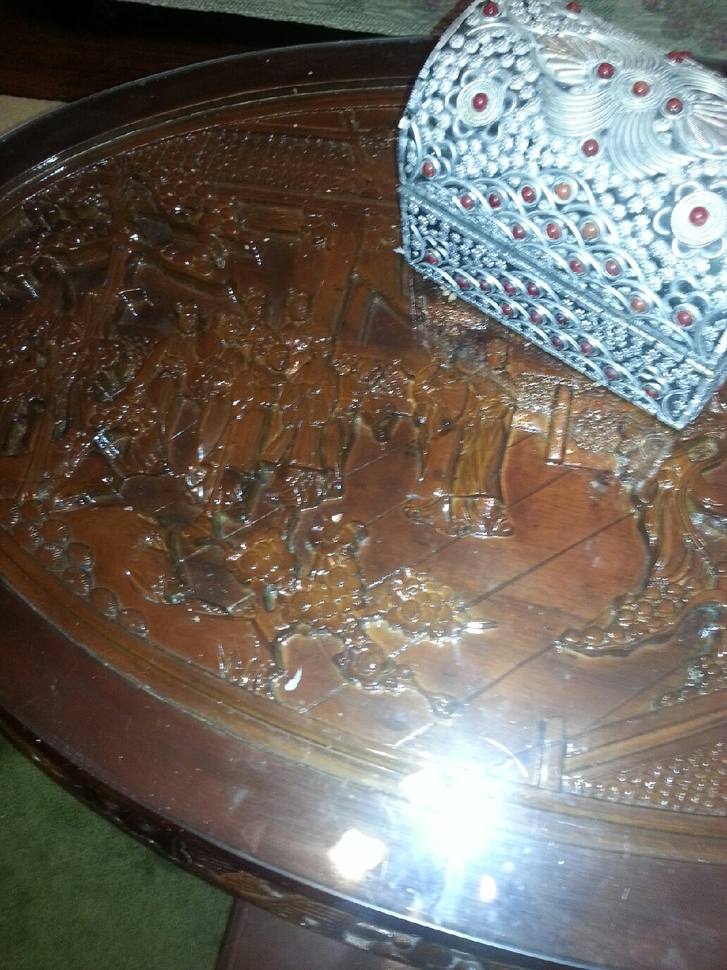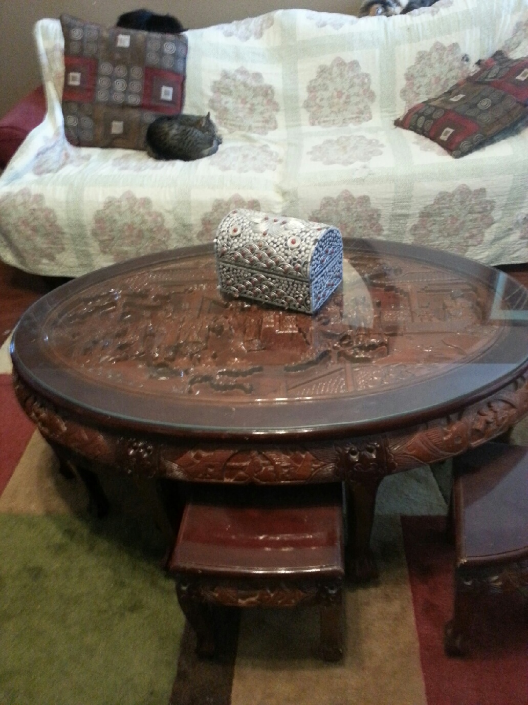 HAND CARVED CHERRY WOOD TABLE WITH 6 STOOLS