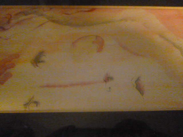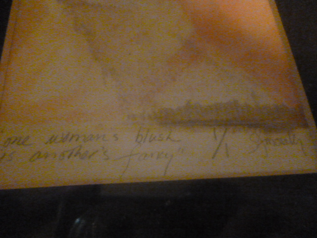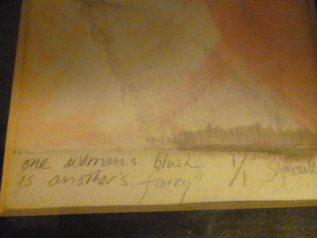 Framed with Black matting.  Colors: Pink, gray, blush tone, burgundy, black pencil.  Signed in pencil with caption: "One woman's blush is another's fancy.  frame size is 12 5/8 Height 9 3/4 Width.