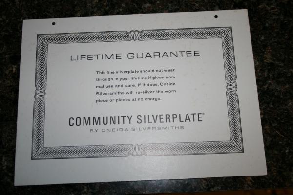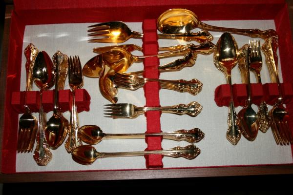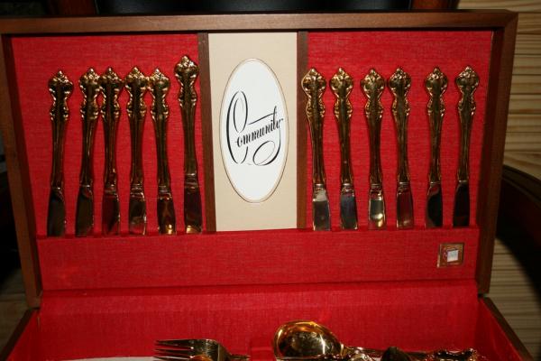 This is an Onieda gold electroplated silverware set. It contains service for 12 plus serving utencils, extra teaspoons (not pictured) and a snub nosed spoon. Comes in wood case with backstamp, "Community". This was purchased by my mother for $100 from Fortunoff's in October 1969. I have included photos' of the original sales receipt and other paperwork. The pattern name is "Ruby Gold". I could not find this pattern on Onieda's database online.