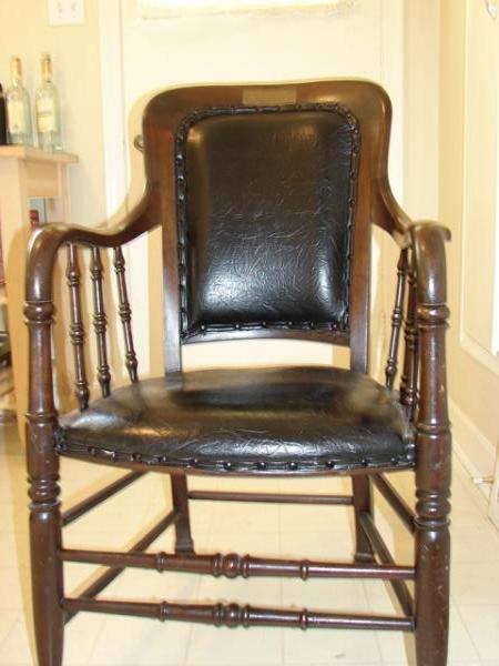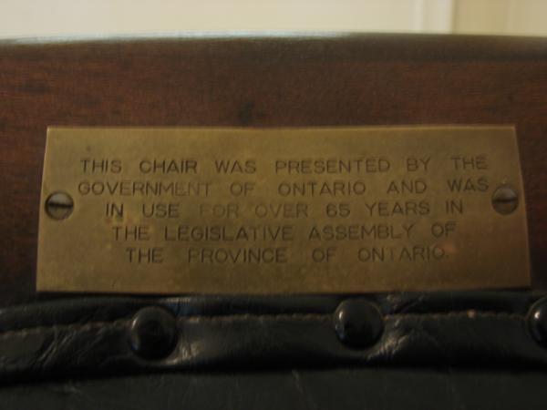 plaque on the chair noting that the chair was presented by the government of Ontario and sat in the Legislative Assembly for 65 years