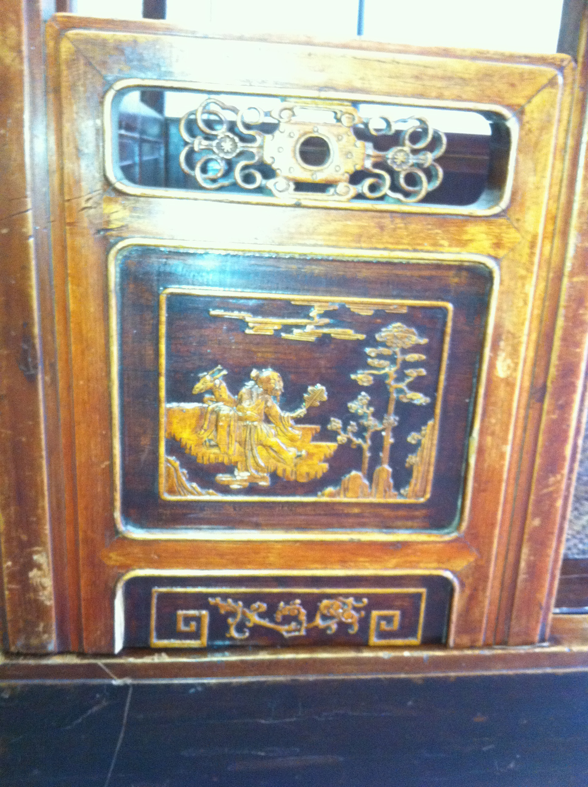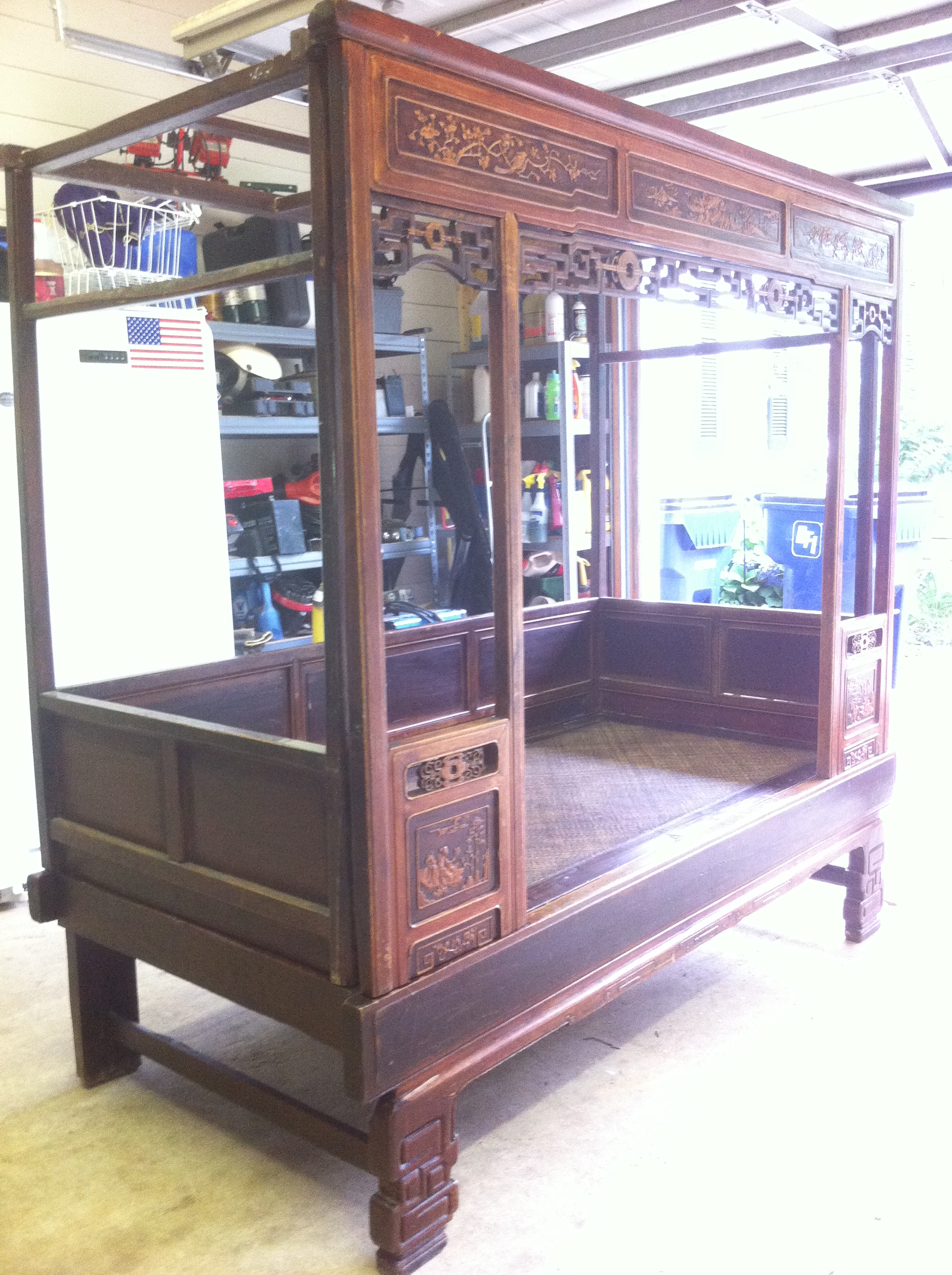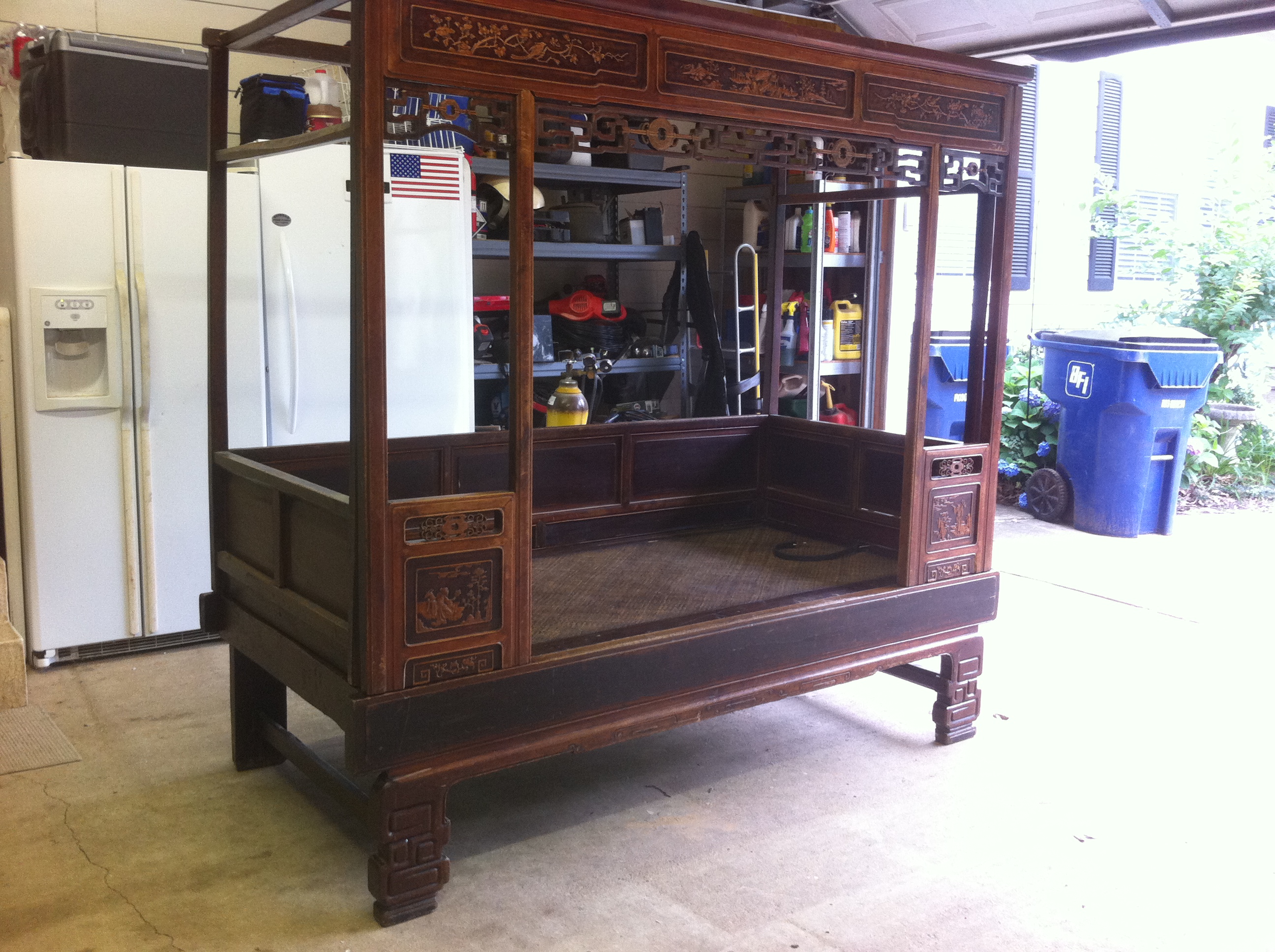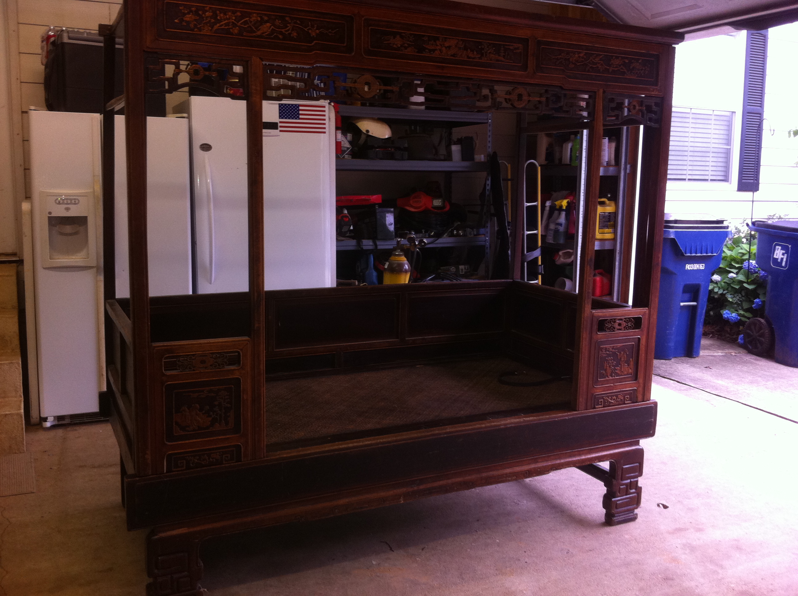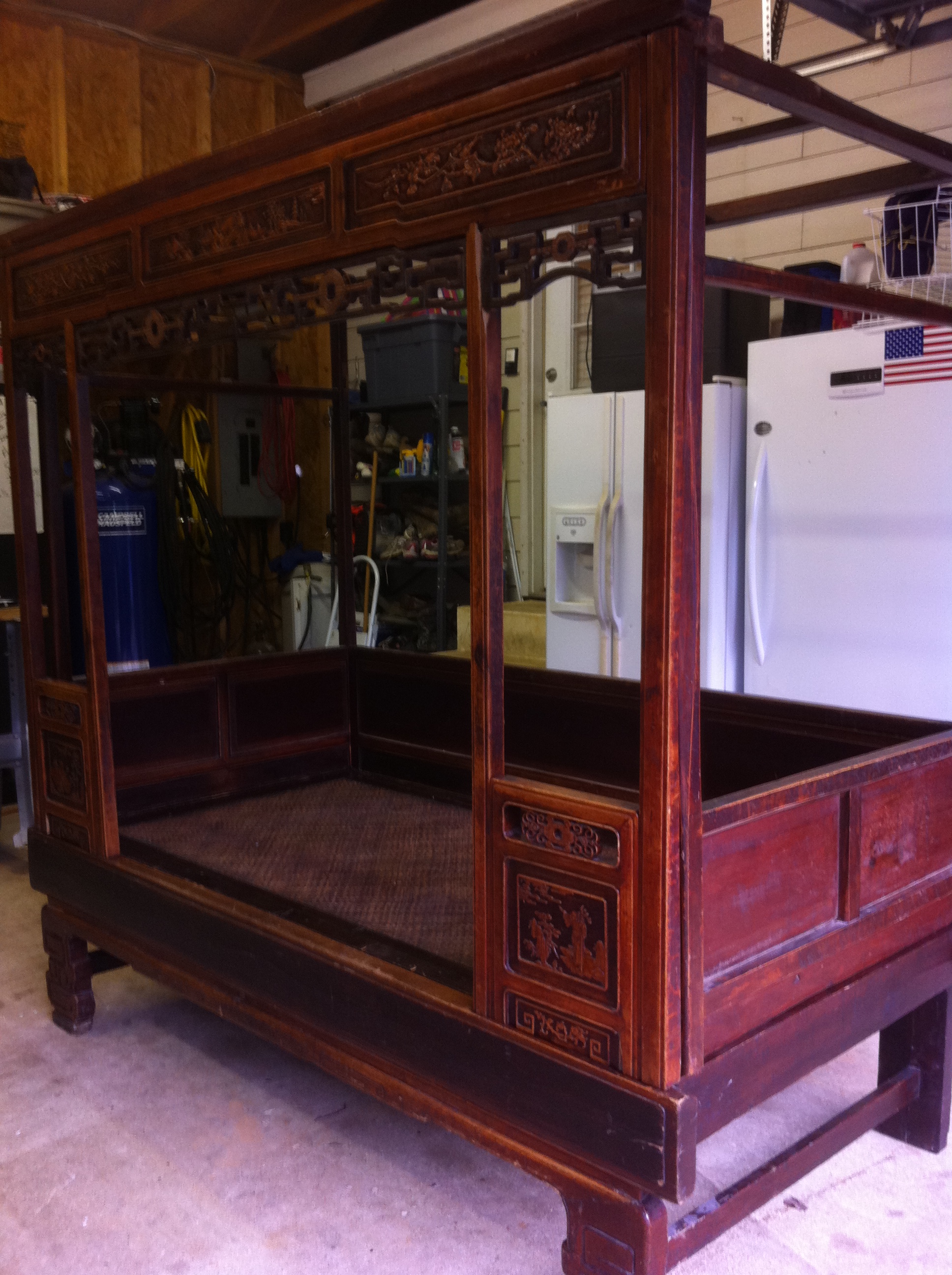 It seems to be in nice condition. They tend to run $1,000 to $2,000 in my experience, but with them all being unique, it's hard to say. There are reproductions (the bottom part, haven't seen any with the whole top and all) selling for $100-$200.The back piece is probably not missing, as this bed was most likely placed against a wall. Are there any screws, or does this piece just interlock and fit together?