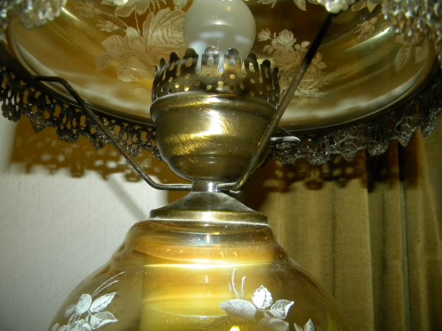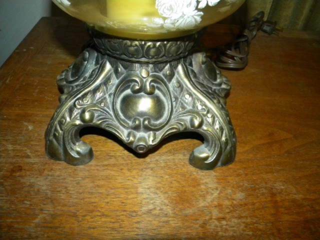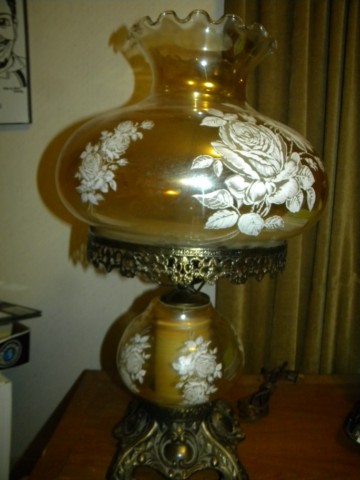 this was handed down and athe glass is orange in color and has roses around top and bottom , their is also a light on top and 1 light in smaller glass on bottom can light just bottom or just top or together . the only letters I can read are on the bottom side of legs and read as so