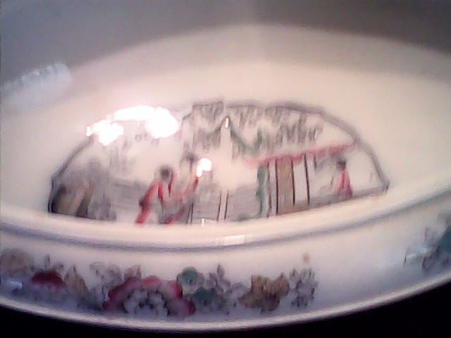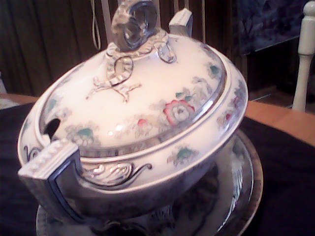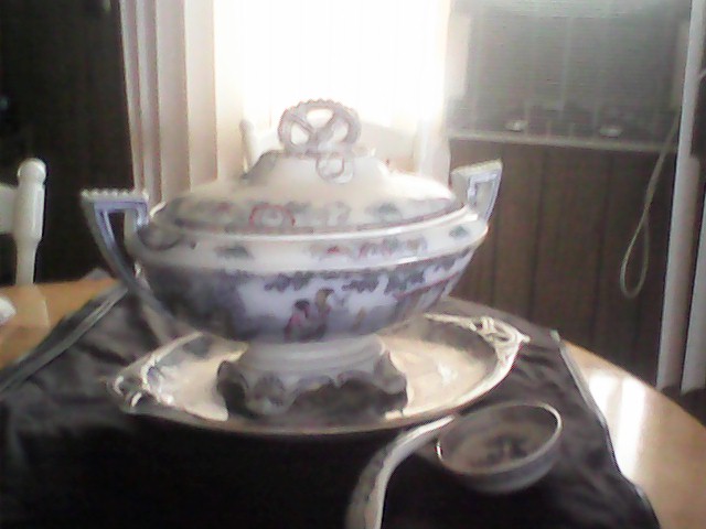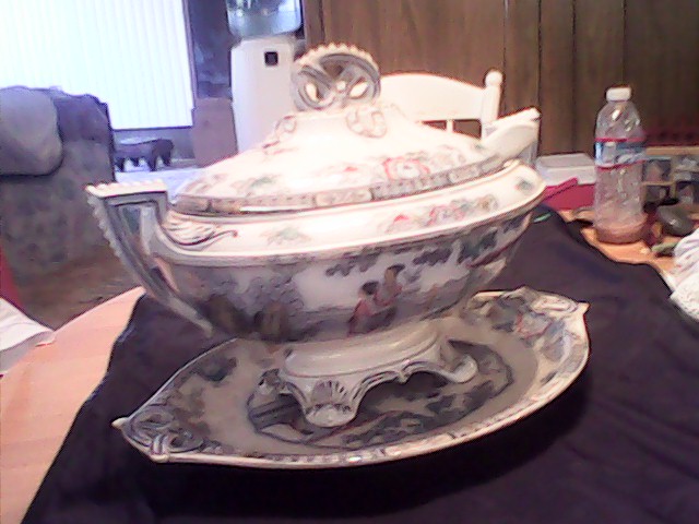 5?This soup tureen was left in a house we bought,it is very pretty,like a bluesy grey in color, with painting on bottom of bowl,and sides,and under lid,it has a platter and lid and laddel,Handel is broke on laddel, painting seams to be of Oriental people and towers trees,and a house, it is hard for me to describe I hope these pictures help explain the painting on it, It has the number . 6369 on every item, and looks like the the letters,JS,or JG, Thank you. And information will be greatly appreciated,as I have searched the Internet and Images and could not find a exact match