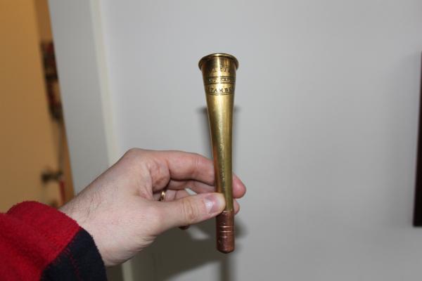 We think the train conductor used this hand held mini horn to announce train departures? It sounds exactly like a new year's eve party blower. It was bought not far from Paris in Tongeren, Belgium (near Liege) in an antique market. It has a copper mouthpiece and brass body and an engraving that says "Orient Express" framed by "Paris" and "Istambul". There is a place for a string to feed through suggesting it hung on a pocket or around the neck.