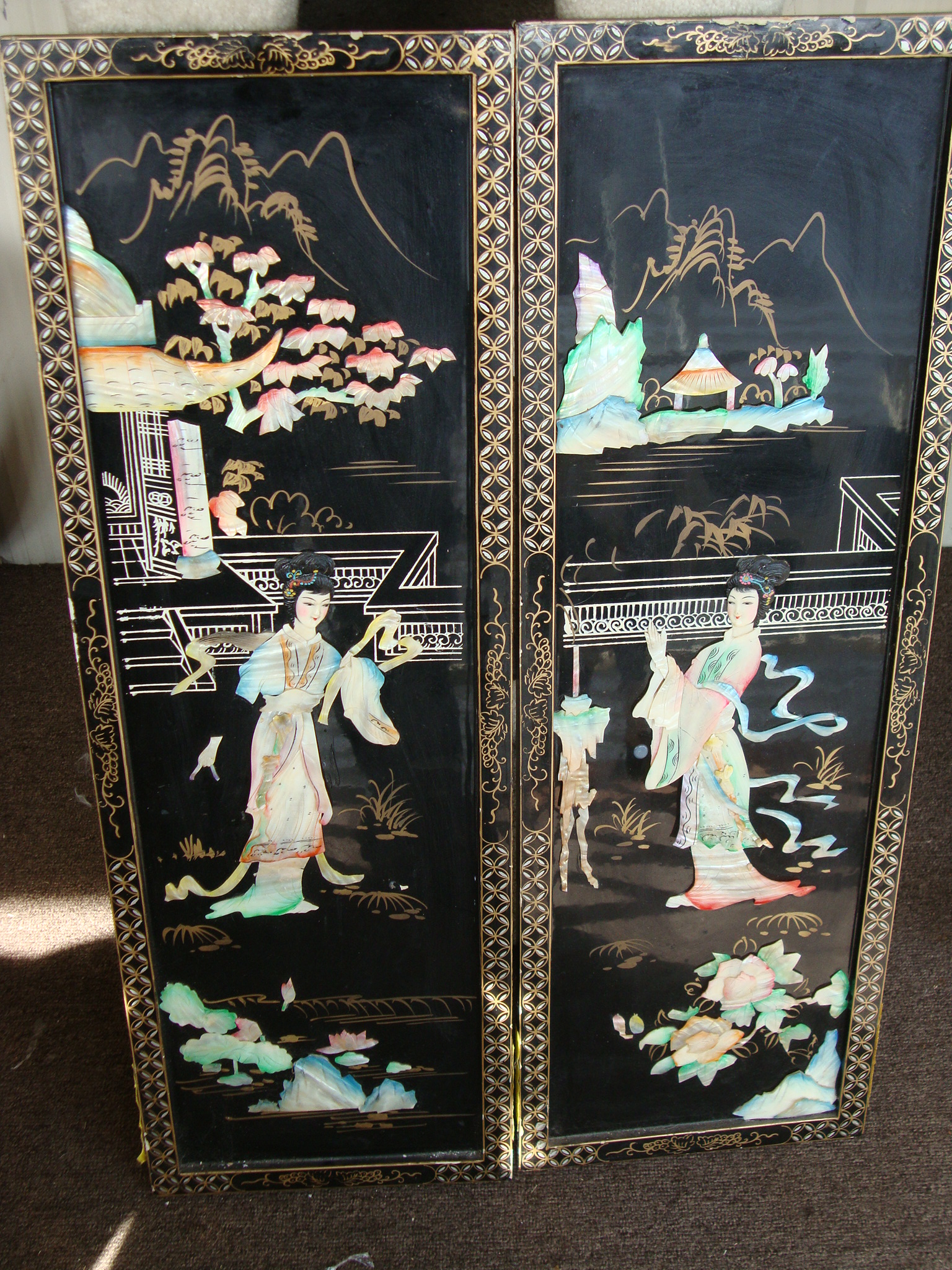 These are some very cool pieces, they look to be mother of pearl (dyed in places), Ivory, and Brass (Some very nice examples are inlaid with gold, but I doubt pieces this large would be) inlay. They are probably made for export, at some point within the last century. Most earlier pieces, and pieces by famous makers have a signature within an inlaid cartouche. I would think the value would be in the $200-300 range per pair, but it's hard to tell for sure from a picture, and examples can range from around $50 up to several thousands of dollars, depending on age, materials, and the maker (if that can be determined). I would definitely recommend having it appraised by an expert in asian art just to be sure.