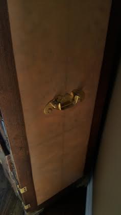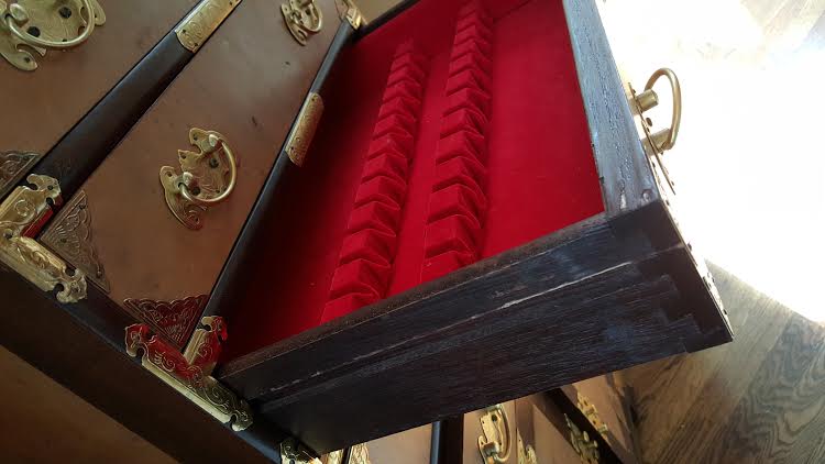 Five drawer. Looks like walnut. Brass handles. Tung and groove.
