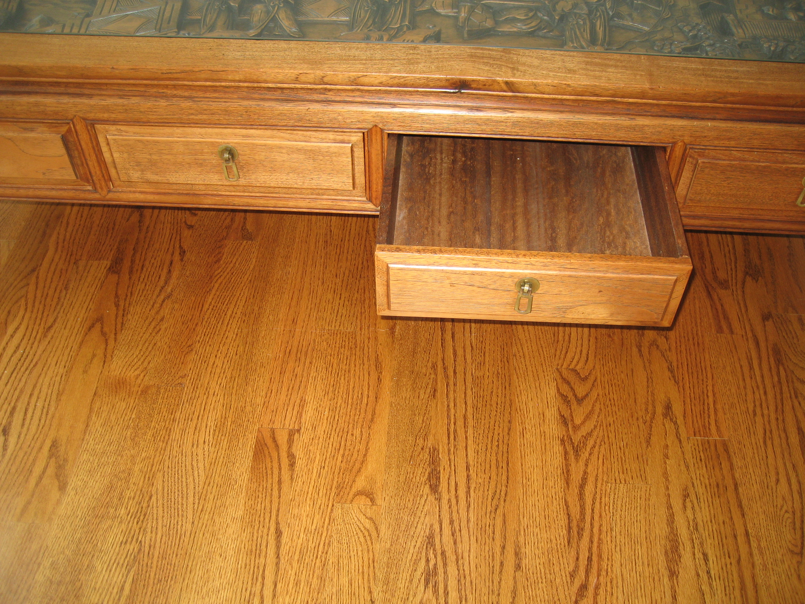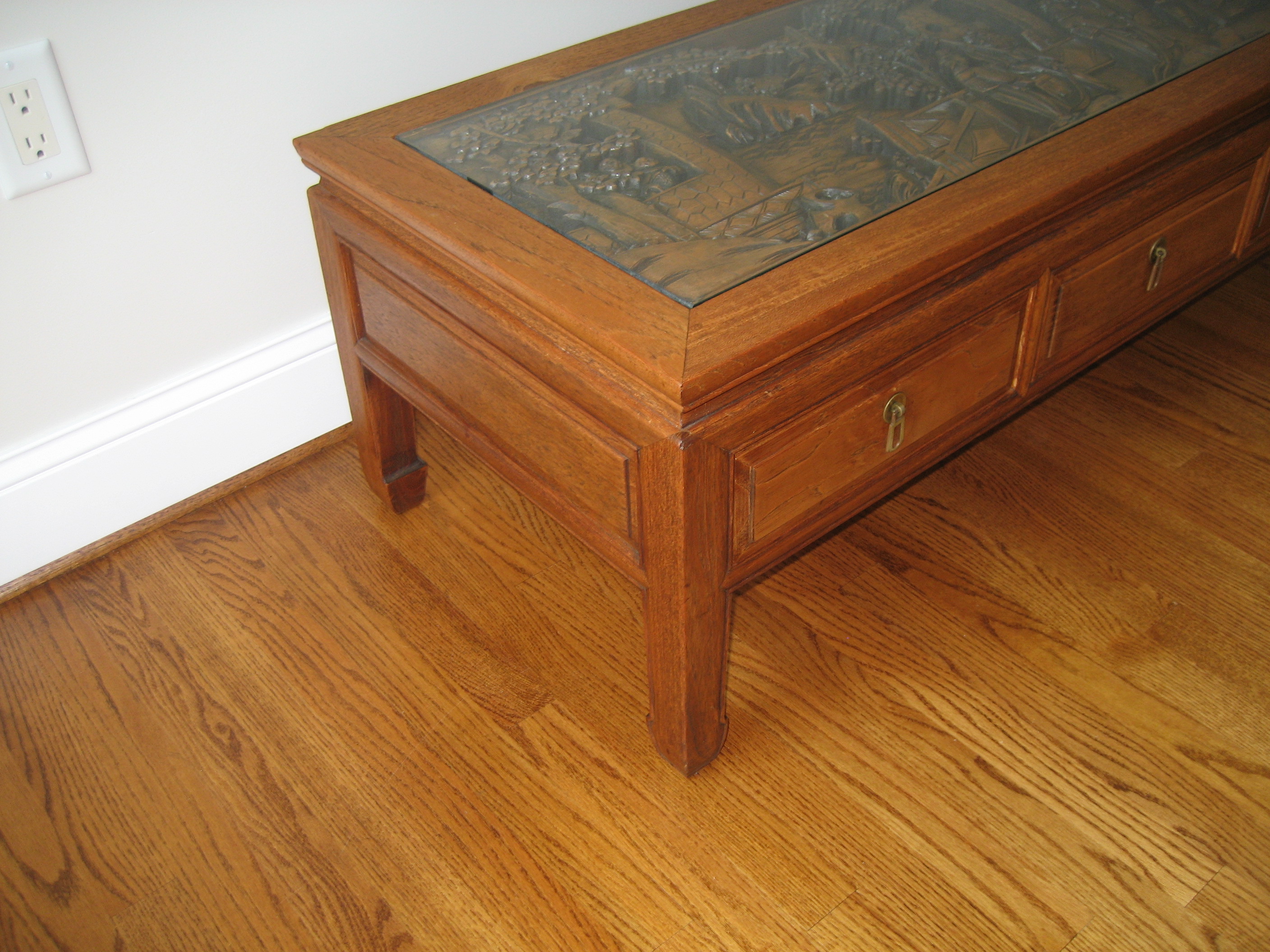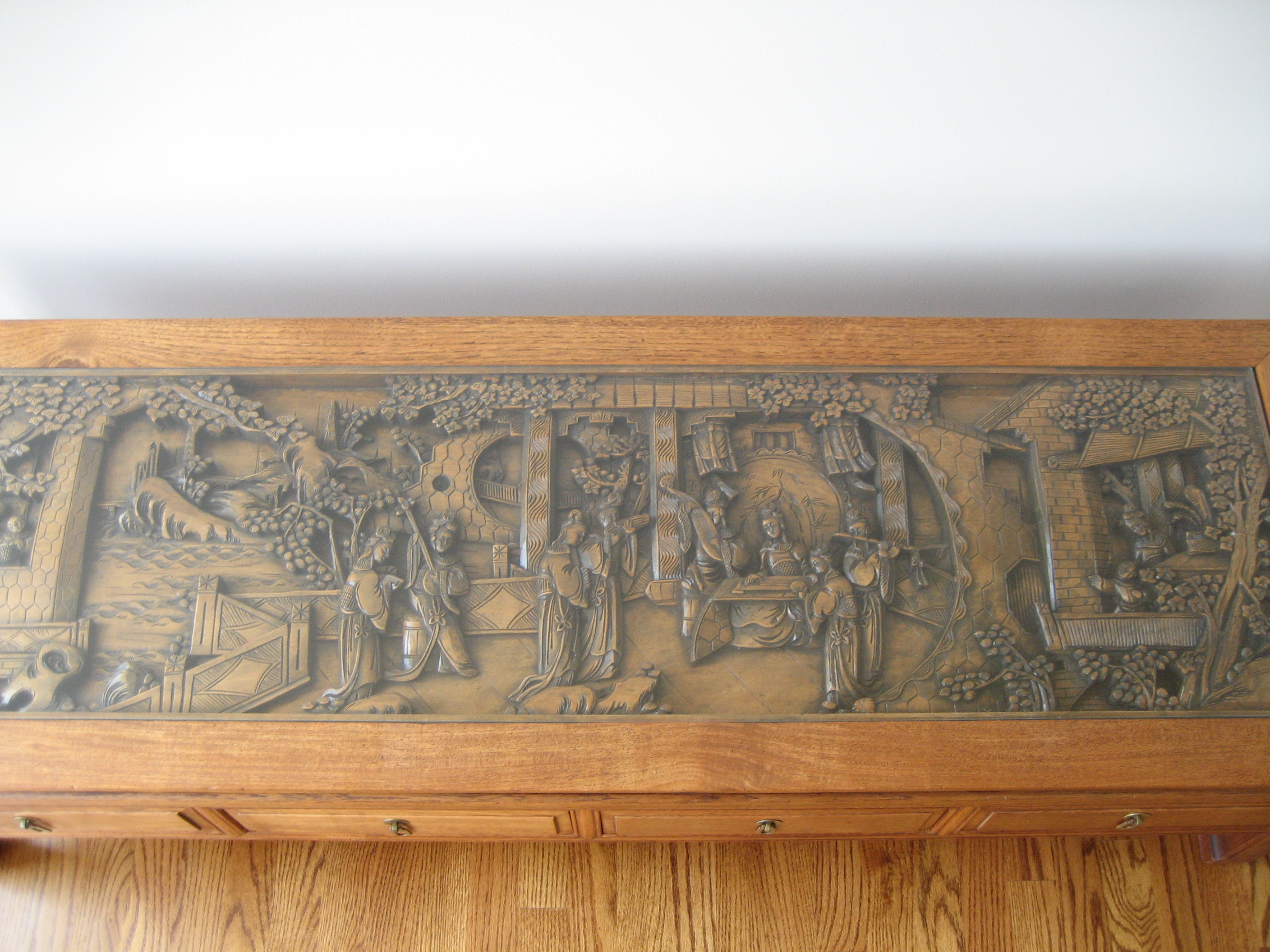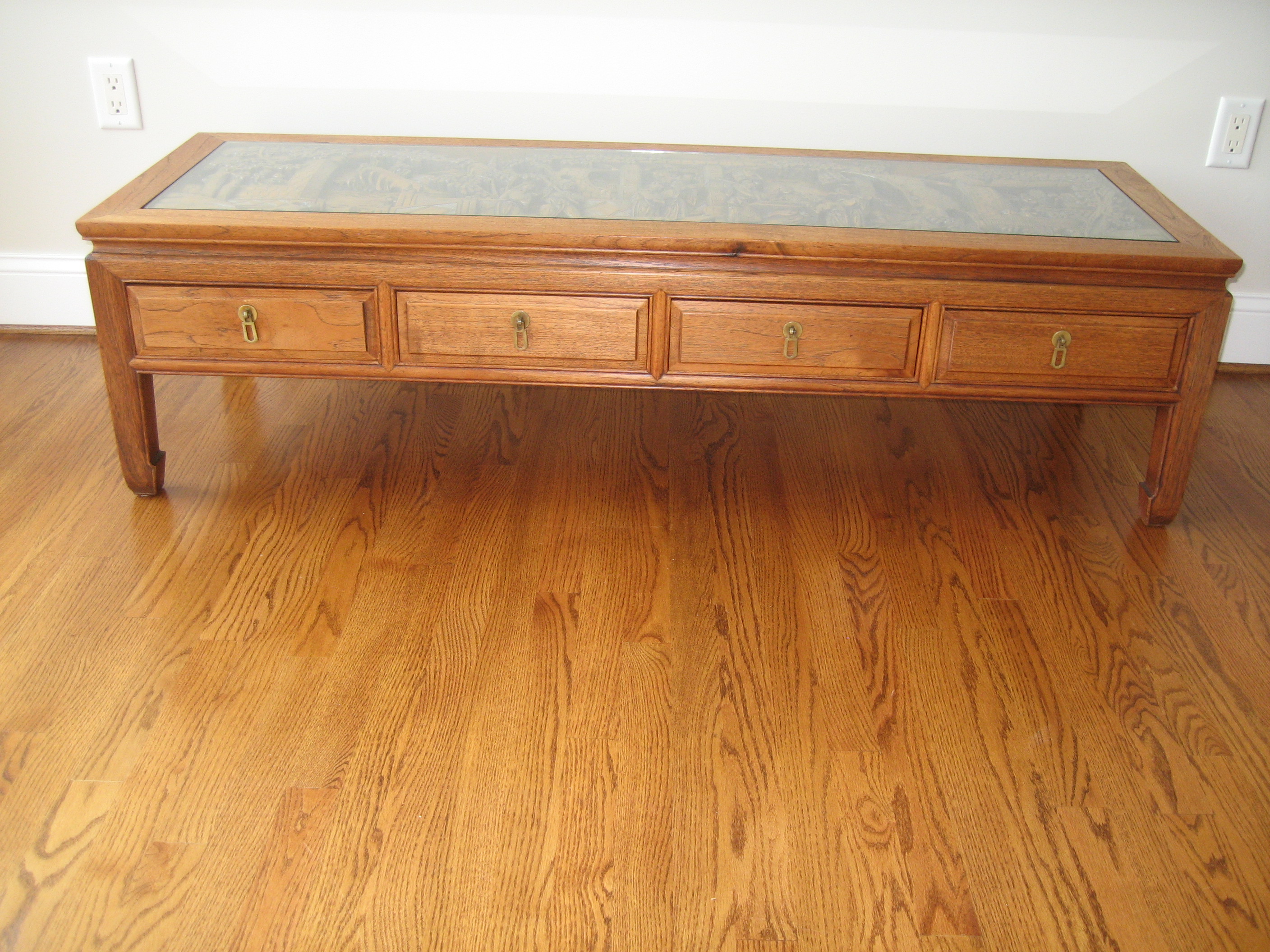 "Oriental Coffee Table with Hand carved Peaceful Village Scene" Glass top 60" X 20" X 16" H