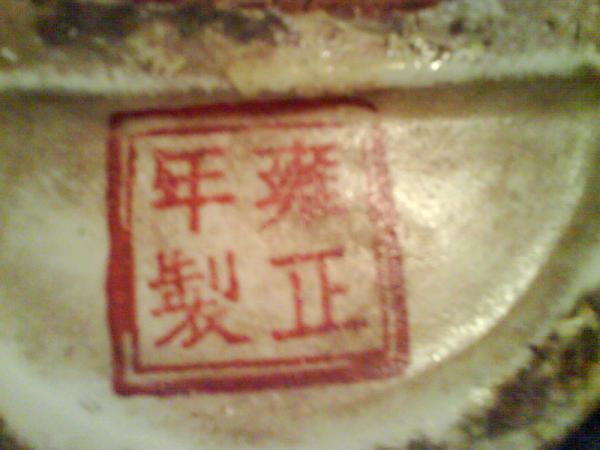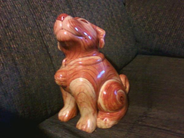 Unique style of painting  looks like they were trying to make it look like wood grain, not sure if it is ceramic or porceline, doesn't have the air hole in the bottom like most ceramics.Instead he has small holes in his nose, one in his mouth center, and the corners of his mouth, and in the bell around his neck. He was always looking up at me as I walked by him with a grin so I had to have him. Has some oriental signature or marking on bottom. Bought him in Hot Springs, Arkansas so where he came from is a mystery.Would love to know more about him Thank you Donna9239