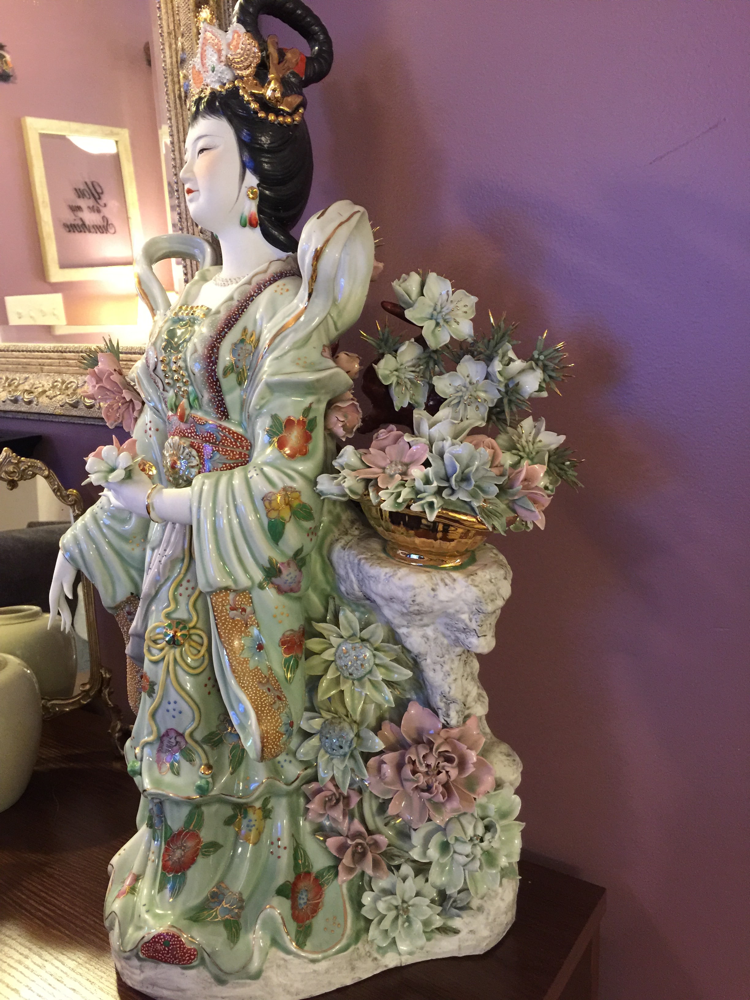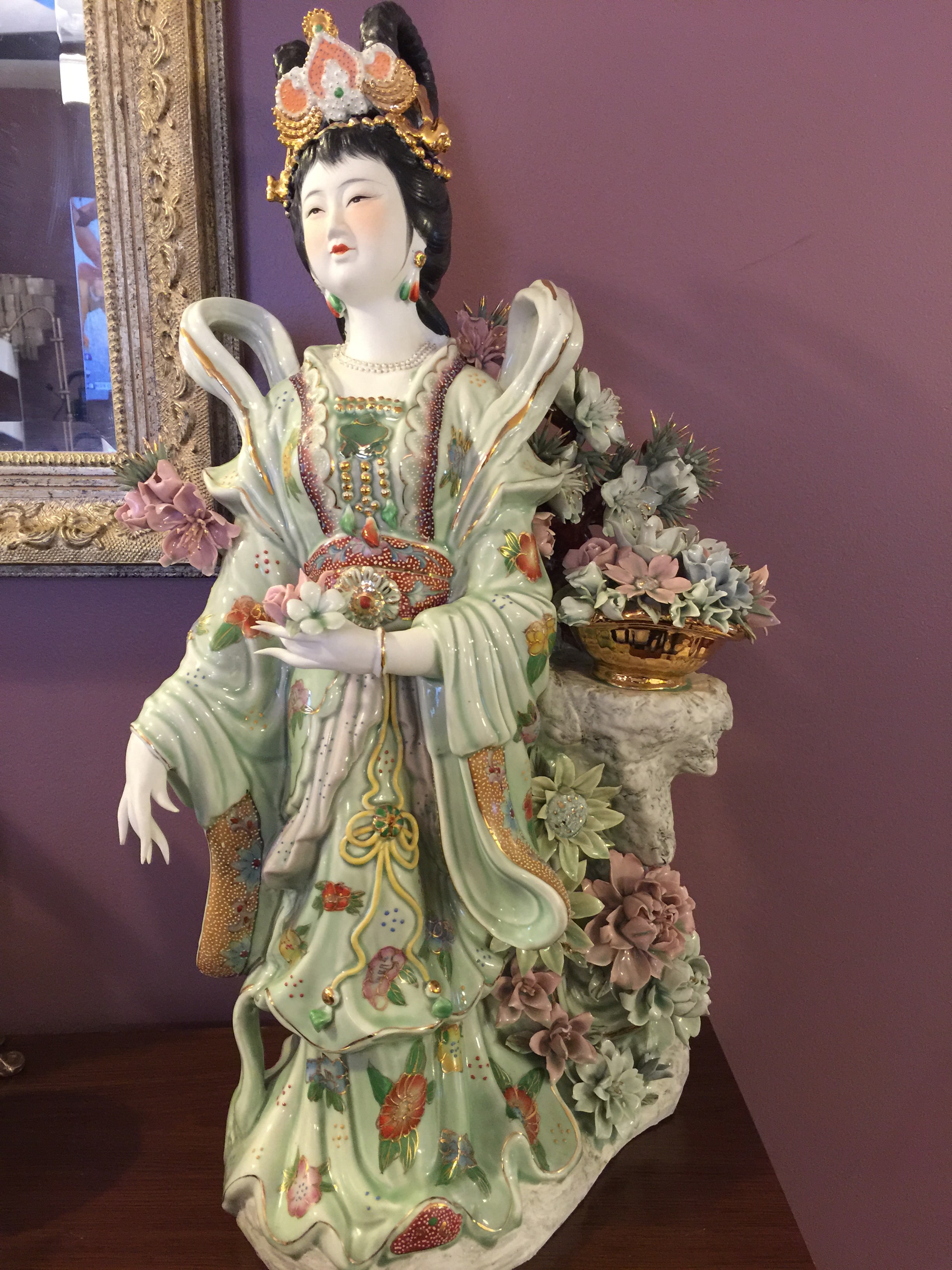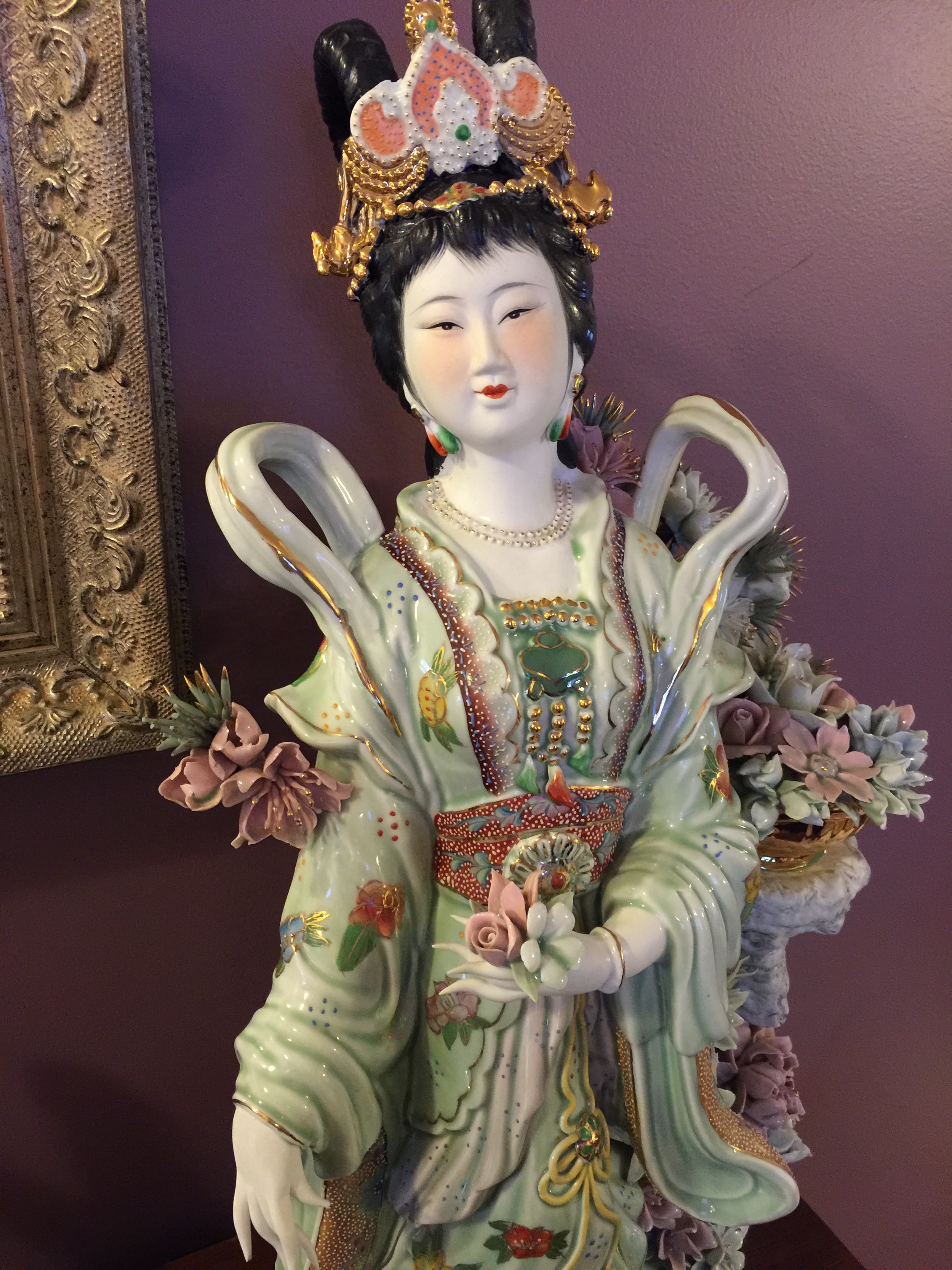 I purchased this statue at a church re-sale shop. The lady who donated it told the shop girls that her ex-husband had bought it for her and paid over $400. The shop had a price of $100 on it but accepted $75 because it has a few small chips. It is 24" tall and 13" wide at its widest point and hand painted. It is extremely heavy weighing 16.2 pounds!!! There is a sticker on the bottom that says made in China.